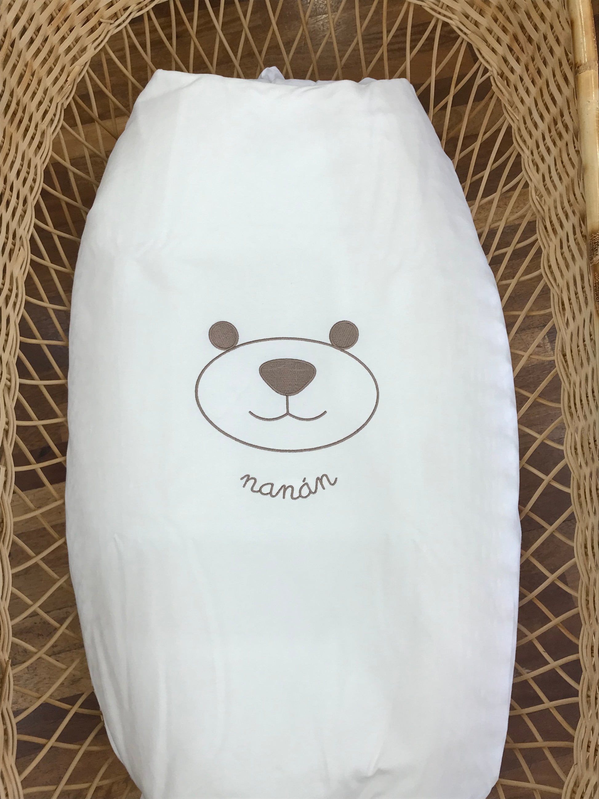 La coperta Nanan presenta un orsetto ricamato sul davanti e un bordo completamente smerlato, offrendo un design raffinato e una finitura elegante che valorizza ogni dettaglio.
