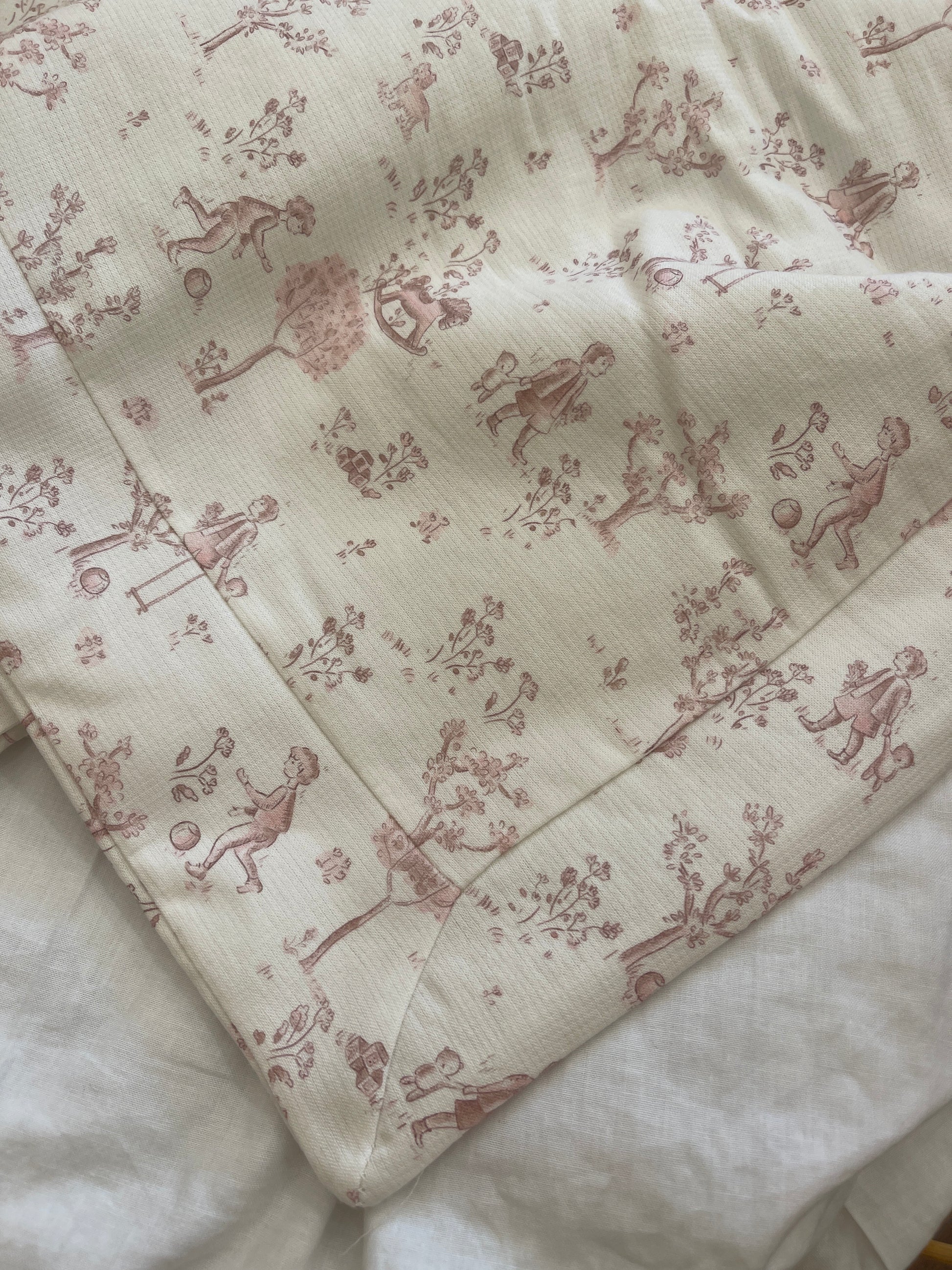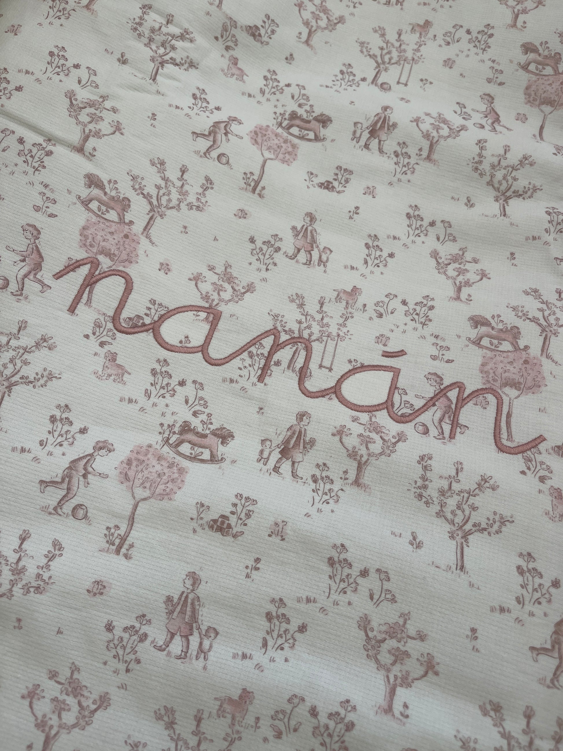 La coperta Nanan è caratterizzata da un raffinato logo ricamato al centro e arricchita da una varietà di disegni delicati, tra cui alberelli, fiorellini e piccoli animaletti, che conferiscono un tocco di eleganza e dolcezza ad ogni utilizzo.
