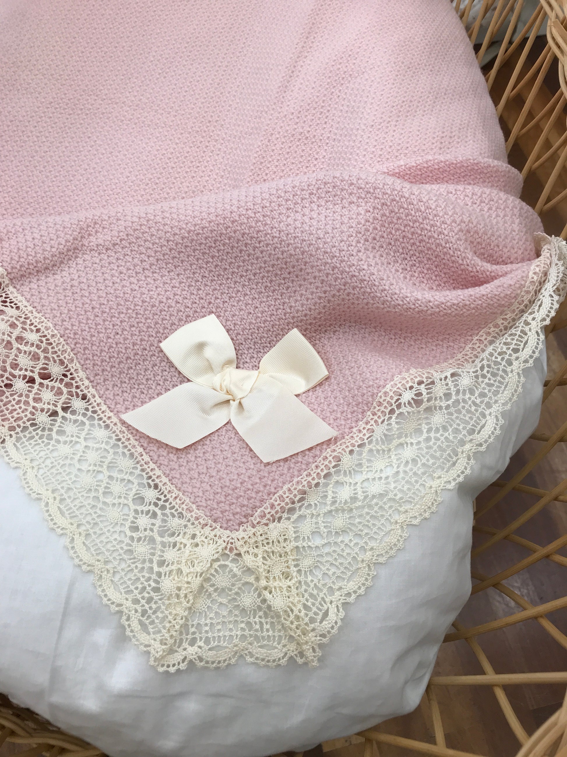 Questa coperta in lana si distingue per il design essenziale, arricchito da un bordo interamente in merletto e da un delicato fiocchetto posizionato su un angolo.