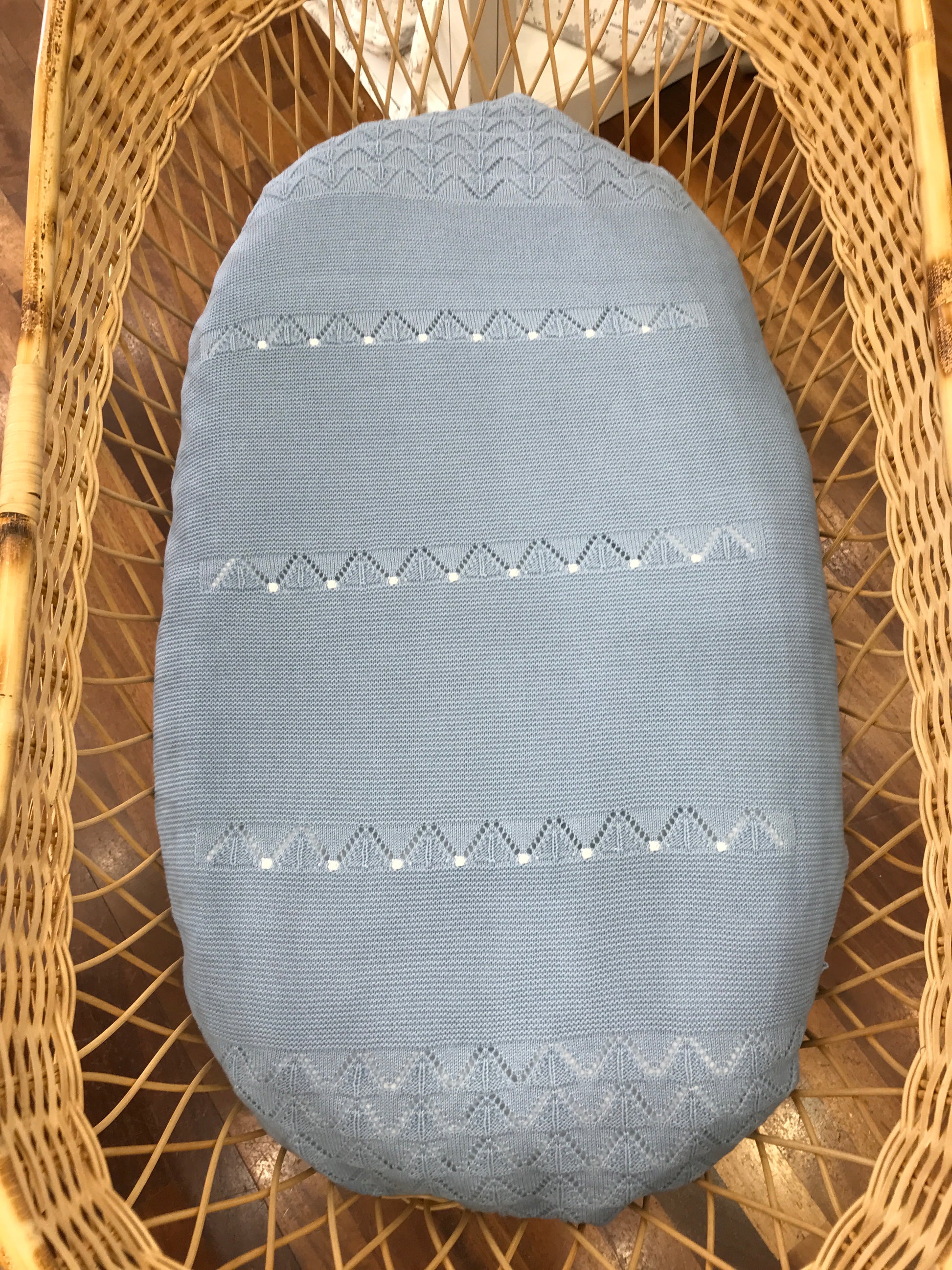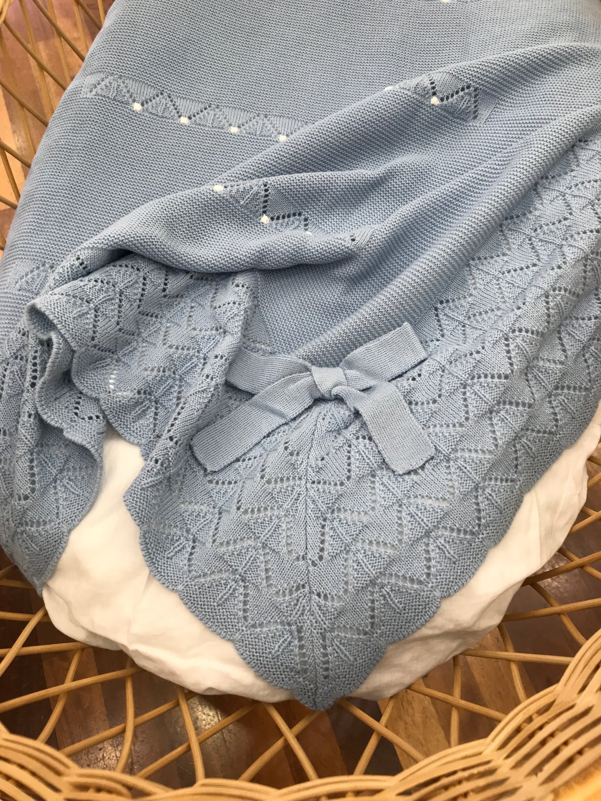 Questa coperta celeste , arricchita da pois bianchi, si distingue per i raffinati ricami traforati posizionati al centro, che ne esaltano l’eleganza. Il bordo è interamente decorato con un delicato ricamo traforato, conferendo un aspetto sofisticato e curato nei dettagli. A completare il design, un fiocco tono su tono aggiunge un tocco di dolcezza e armonia, rendendo questa coperta un accessorio ideale per il comfort e lo stile del tuo bambino.
