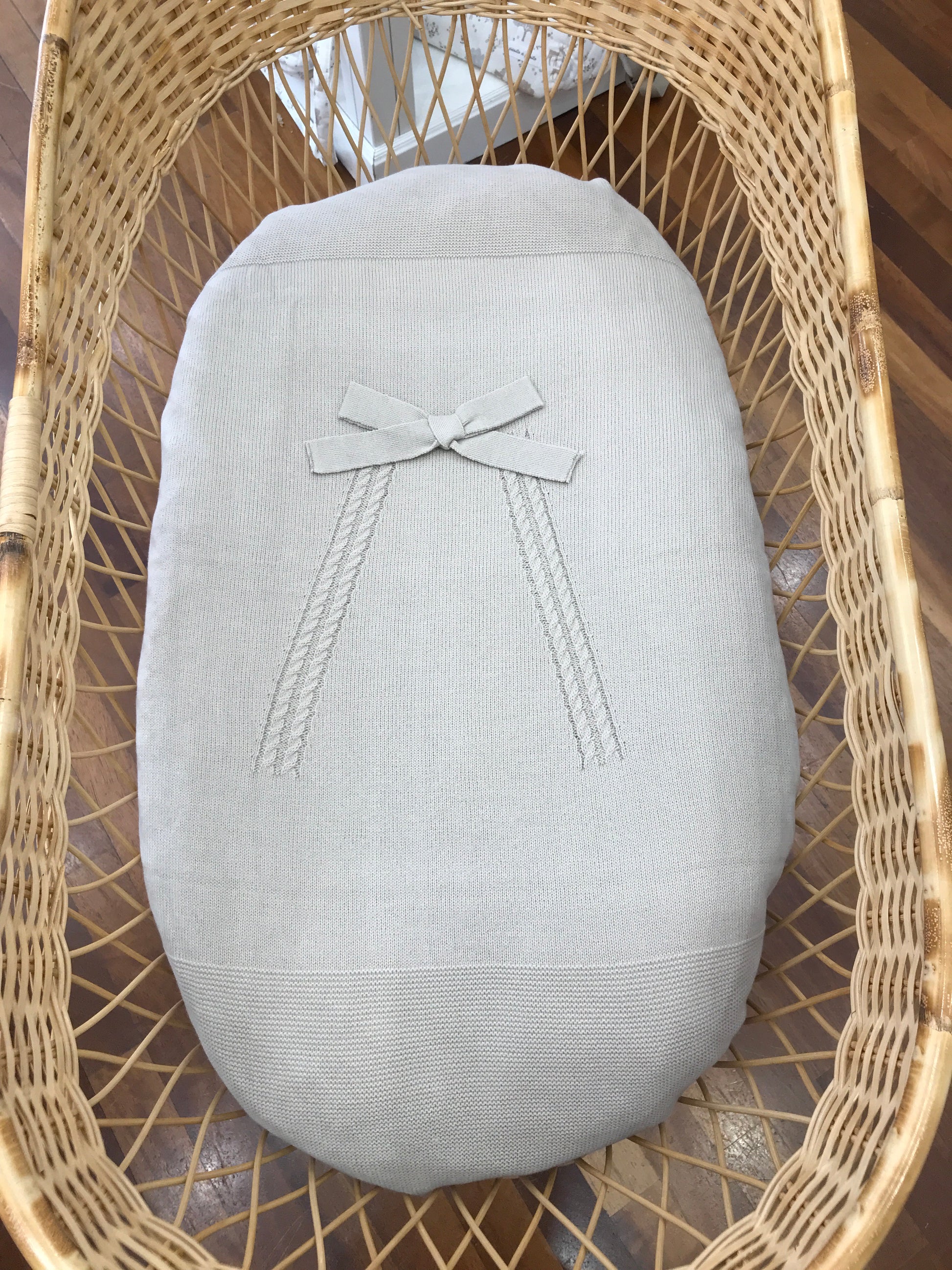 Coperta color tortora caratterizzata da una raffinata lavorazione a trecce sulla parte frontale, arricchita da un elegante fiocco tono su tono posizionato all’estremità superiore delle trecce, che aggiunge un tocco di delicatezza e stile al design complessivo.