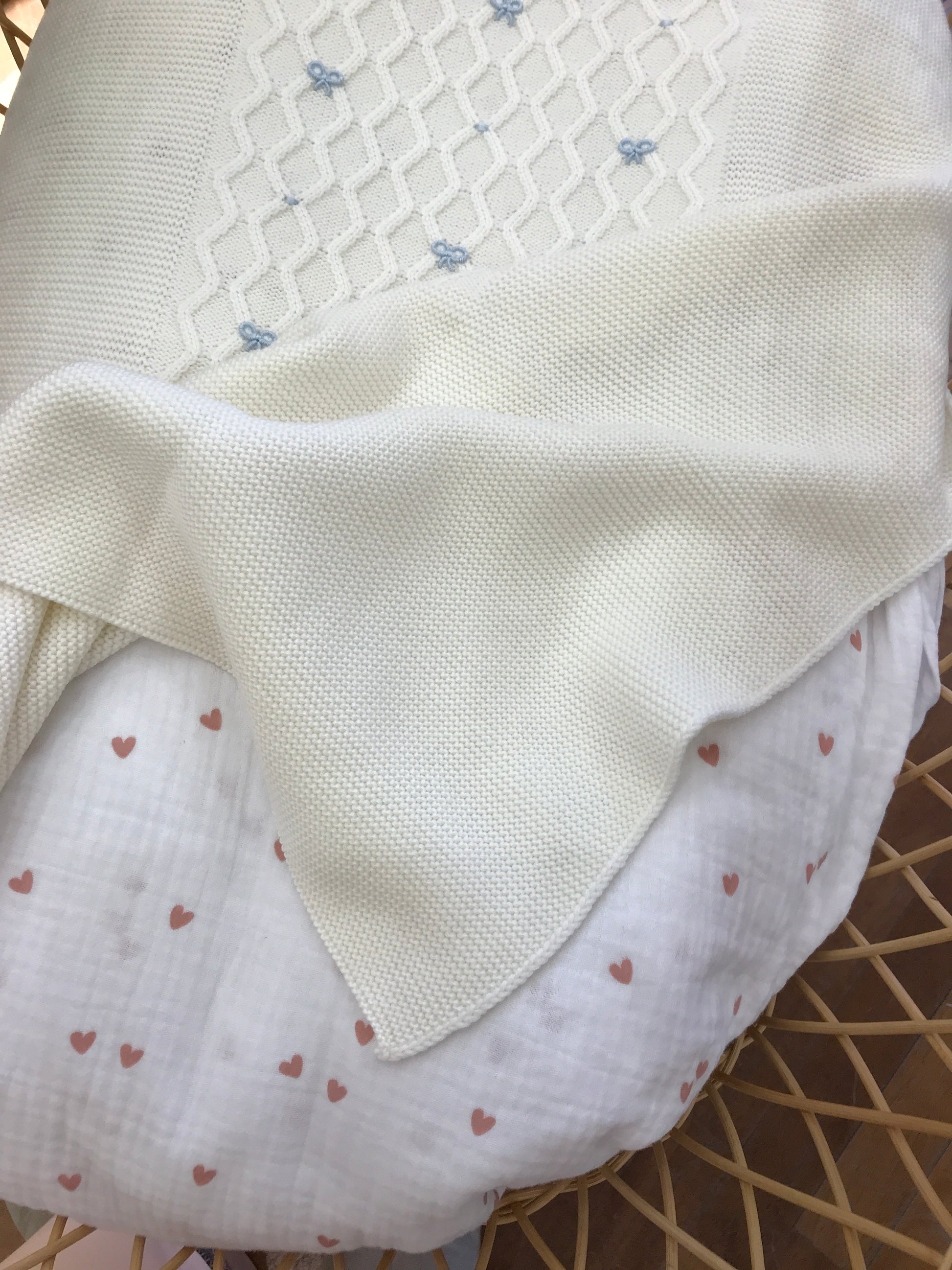 Raffinata coperta in pura lana color panna, caratterizzata da una pregevole lavorazione centrale impreziosita da delicati fiocchetti celesti. Un capo versatile che unisce eleganza e funzionalità, ideale per aggiungere calore e stile a qualsiasi ambiente.
