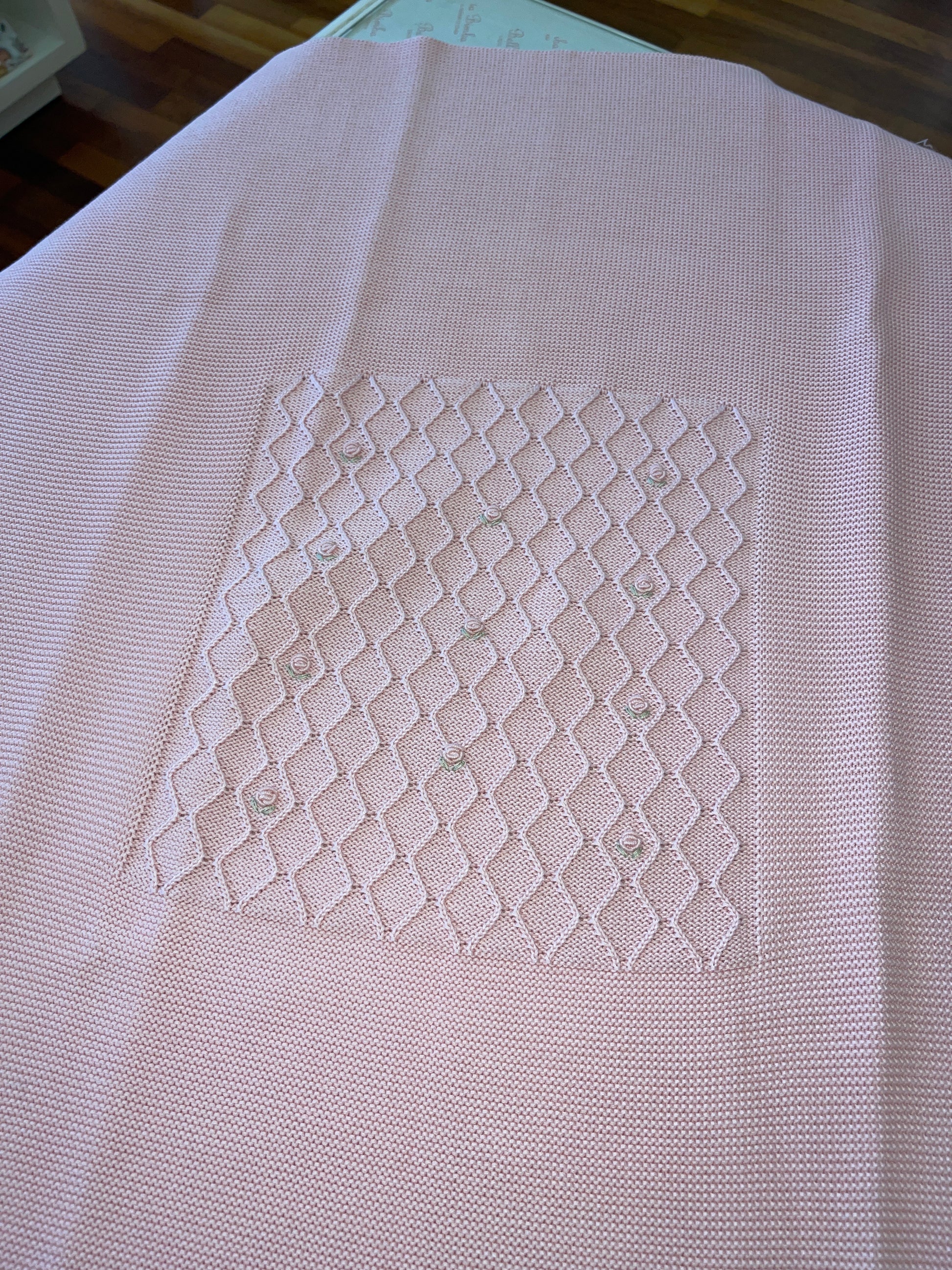 Questa bellissima coperta Pepece' è realizzata con filo bianco di alta qualità e arricchita da deliziose roselline ricamate a mano. Rimarrai incantato dalla sua eleganza e dalla sua morbidezza, rendendola perfetta per coccolare te stesso o per dare un tocco di classe al tuo arredamento.