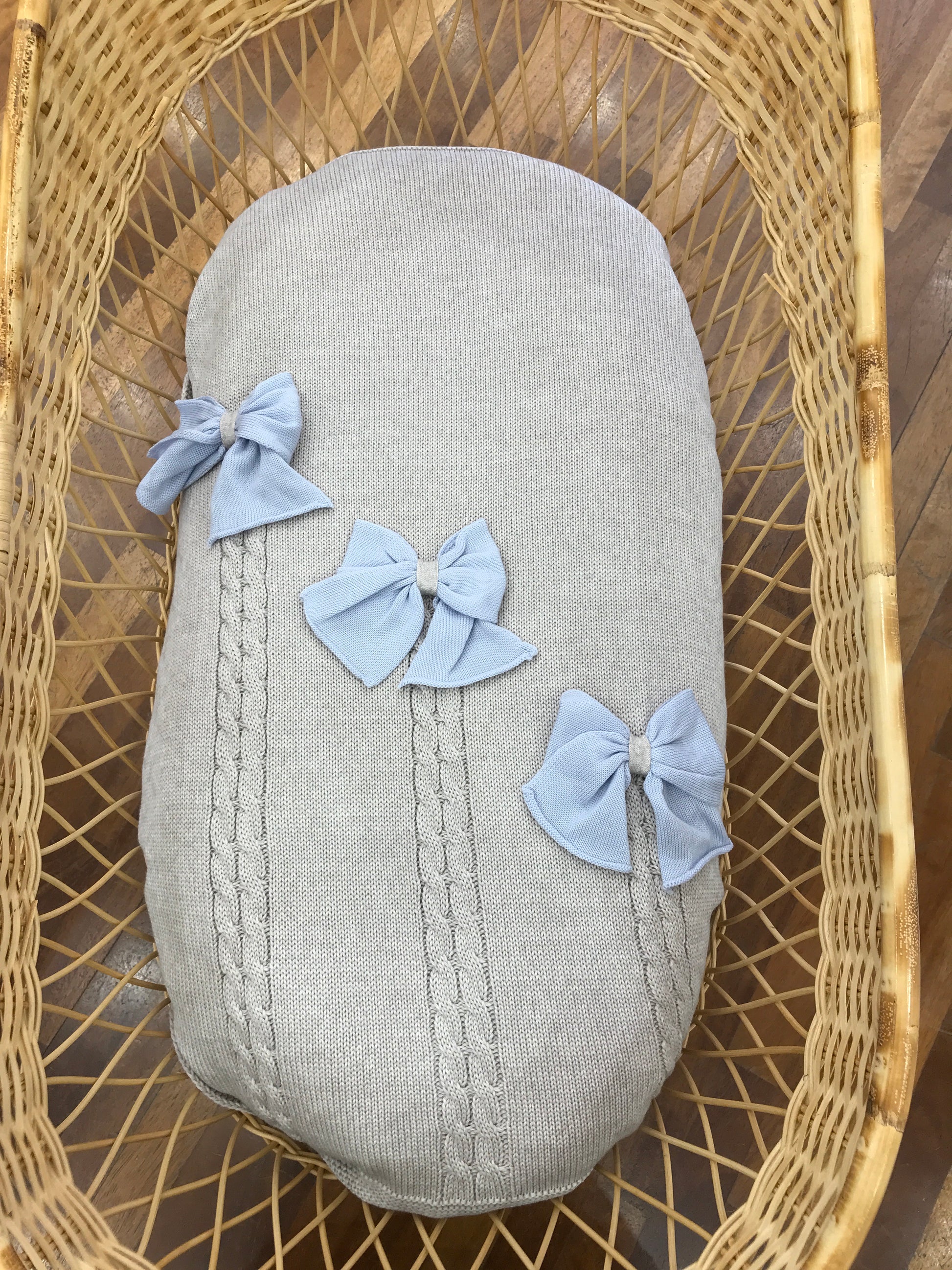 Questa coperta per bebè è realizzata con tre fasce intrecciate e decorata con tre grandi fiocchi in lana, unendo eleganza e morbidezza per il massimo comfort del neonato.