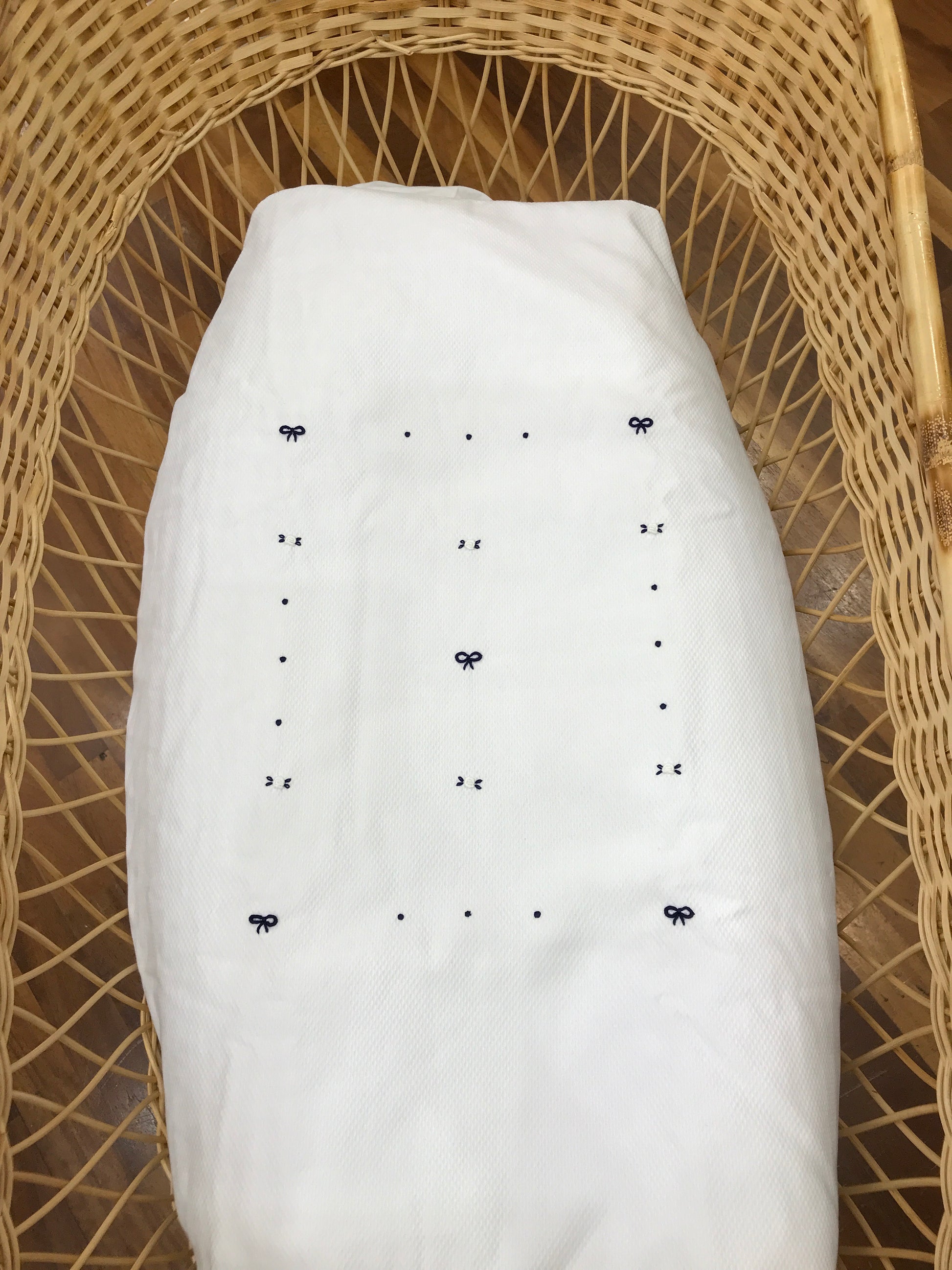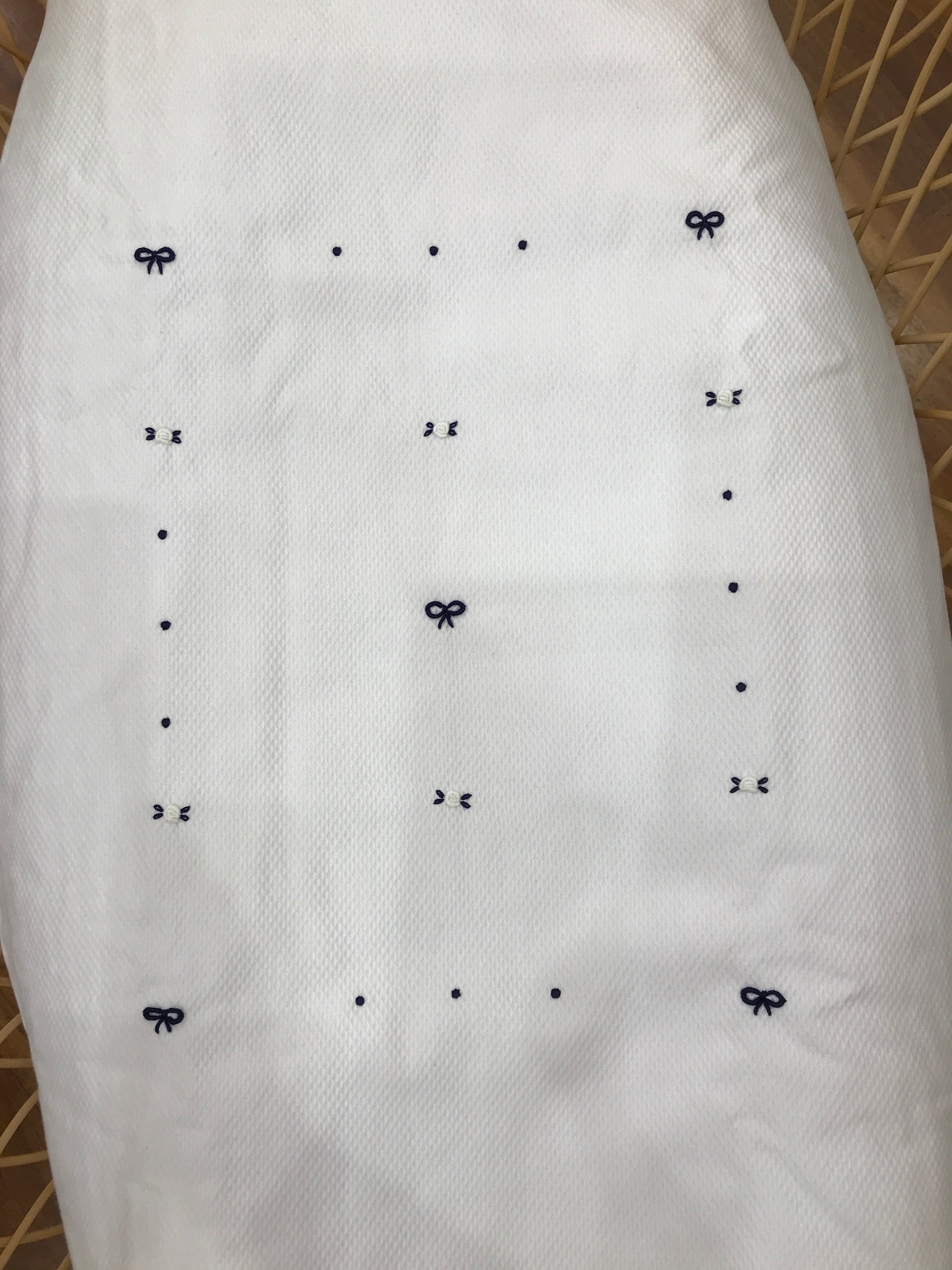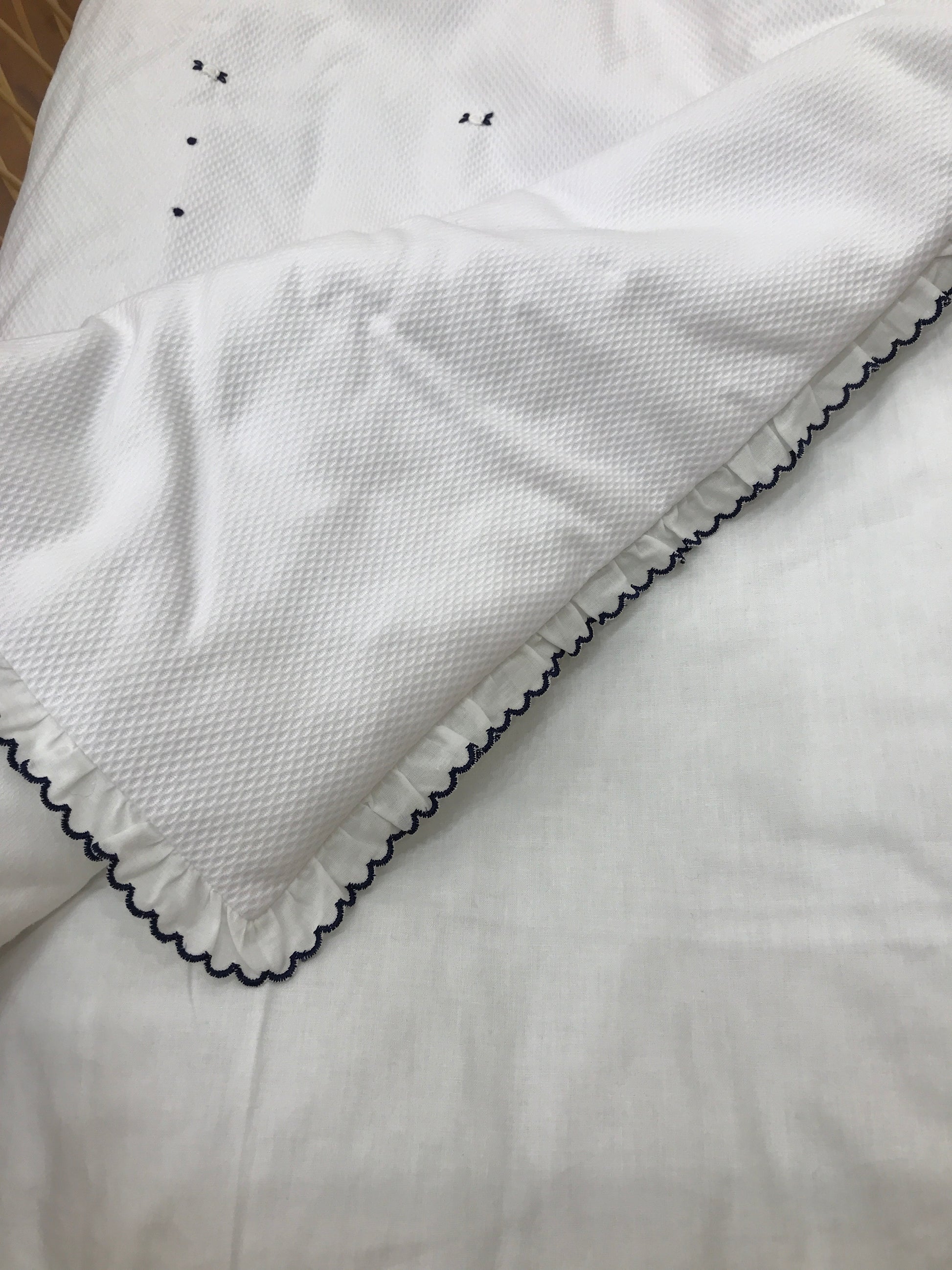 Questa coperta bianca è rifinita con un bordo ricamato in blu e decorata al centro con fiocchetti e piccole roselline ricamate, conferendo un tocco elegante e delicato.