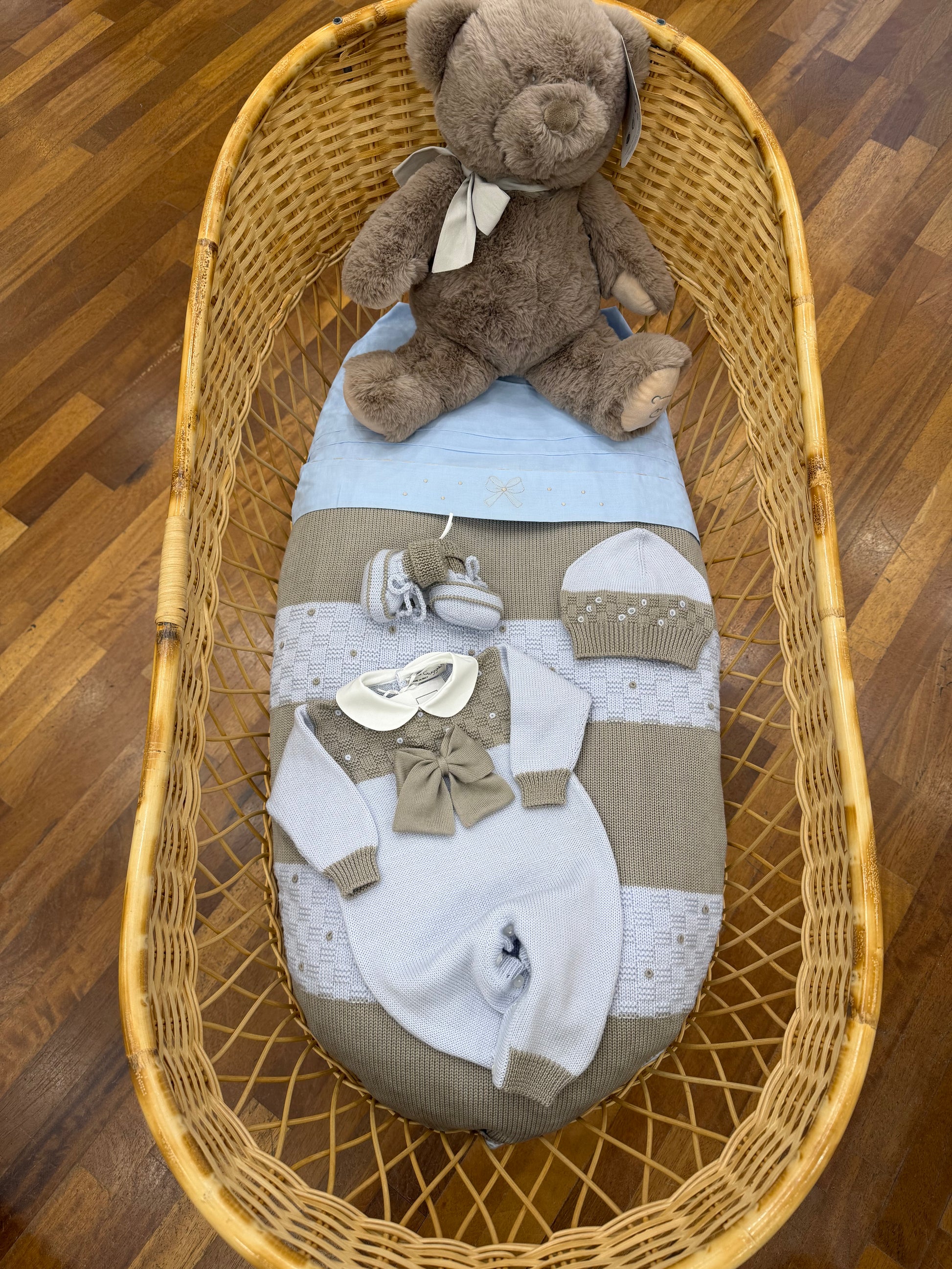 Questa coperta in lana presenta un design a fasce alternate nei colori cielo e moro. Le fasce cielo sono impreziosite da delicati ricami in moro, mentre il bordo è rifinito con entrambi i colori, creando un elegante contrasto.
