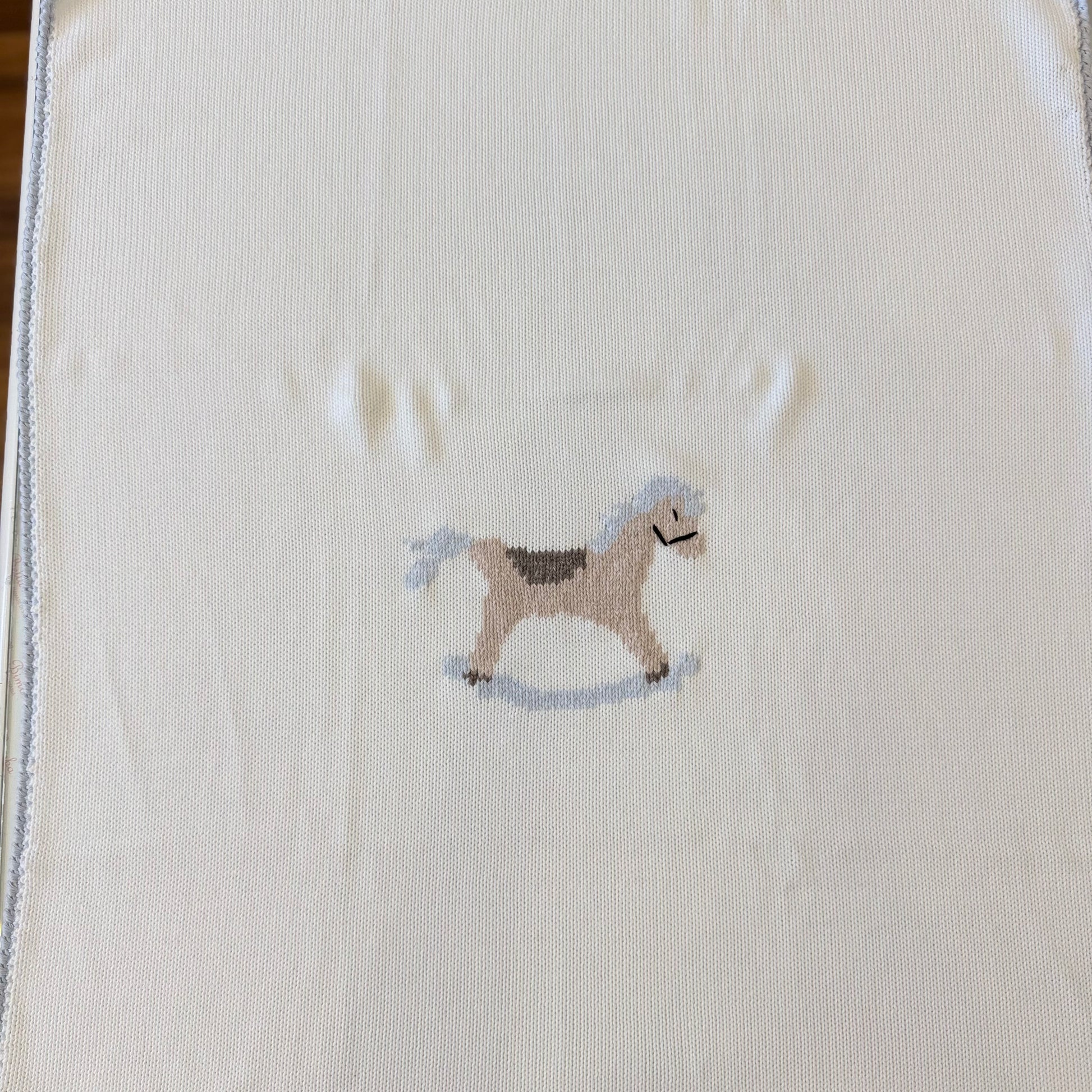 La copertina Colibrì è realizzata in puro filo di cotone e presenta un delicato ricamo centrale a mano di un cavallo a dondolo. Perfetta per coprire e coccolare i piccoli, regalando loro calore e morbidezza. Un tocco di eleganza senza tempo
