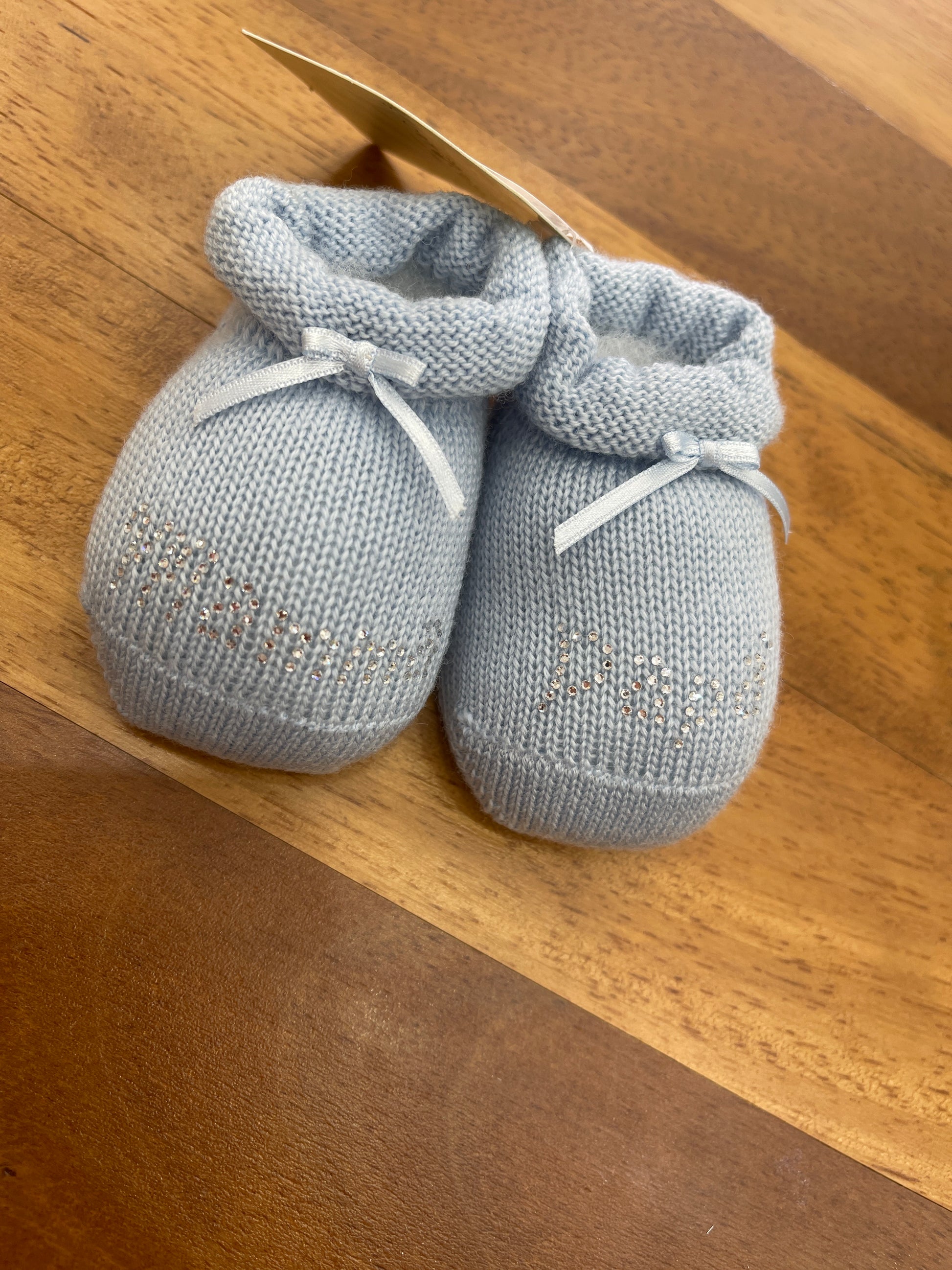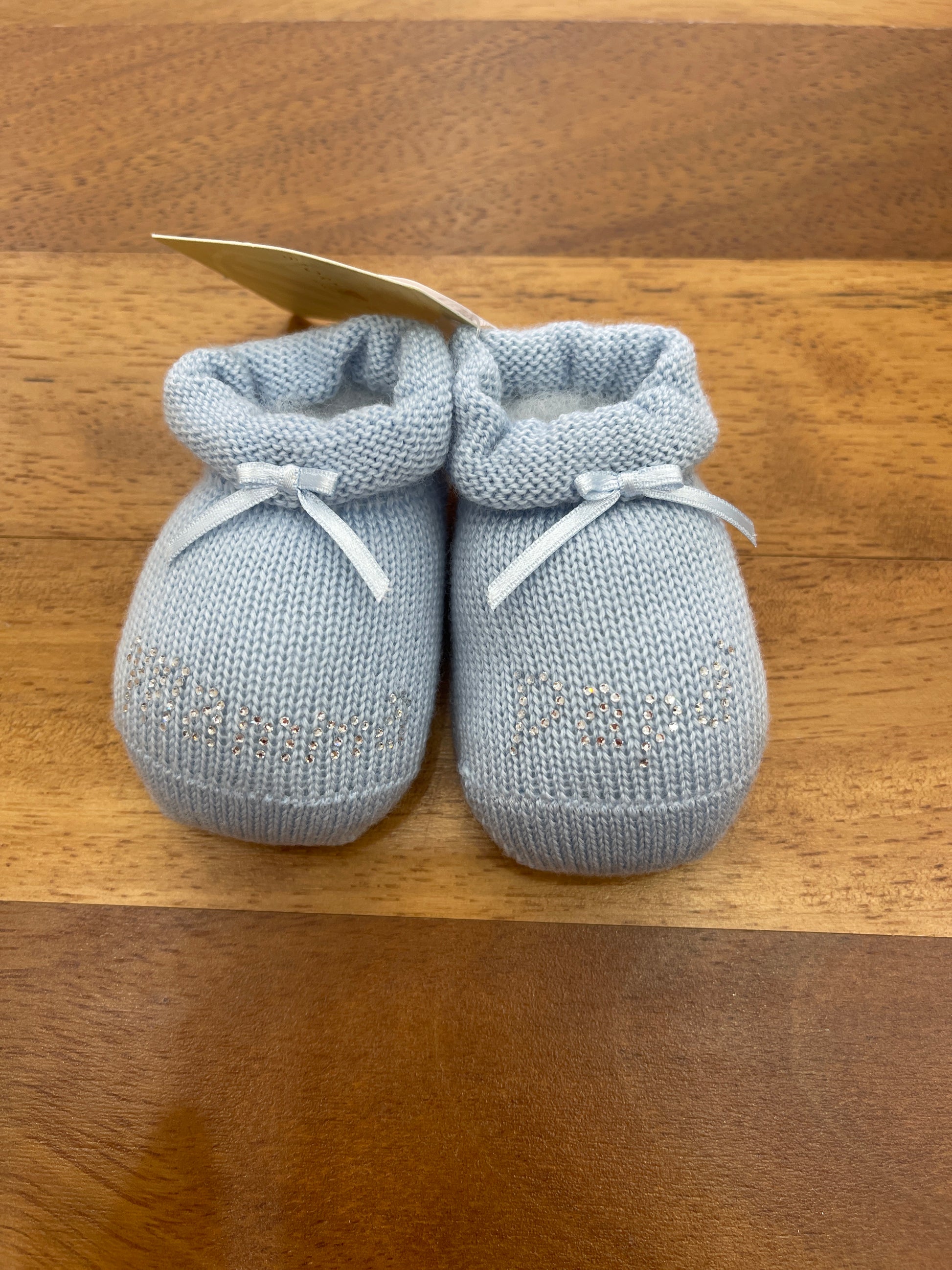 Babbucce in lana celeste caratterizzate da un piccolo risvolto e un delicato fiocchetto. Il set include entrambe le scarpine, decorate con dettagli scintillanti e la scritta “mamma papà”.