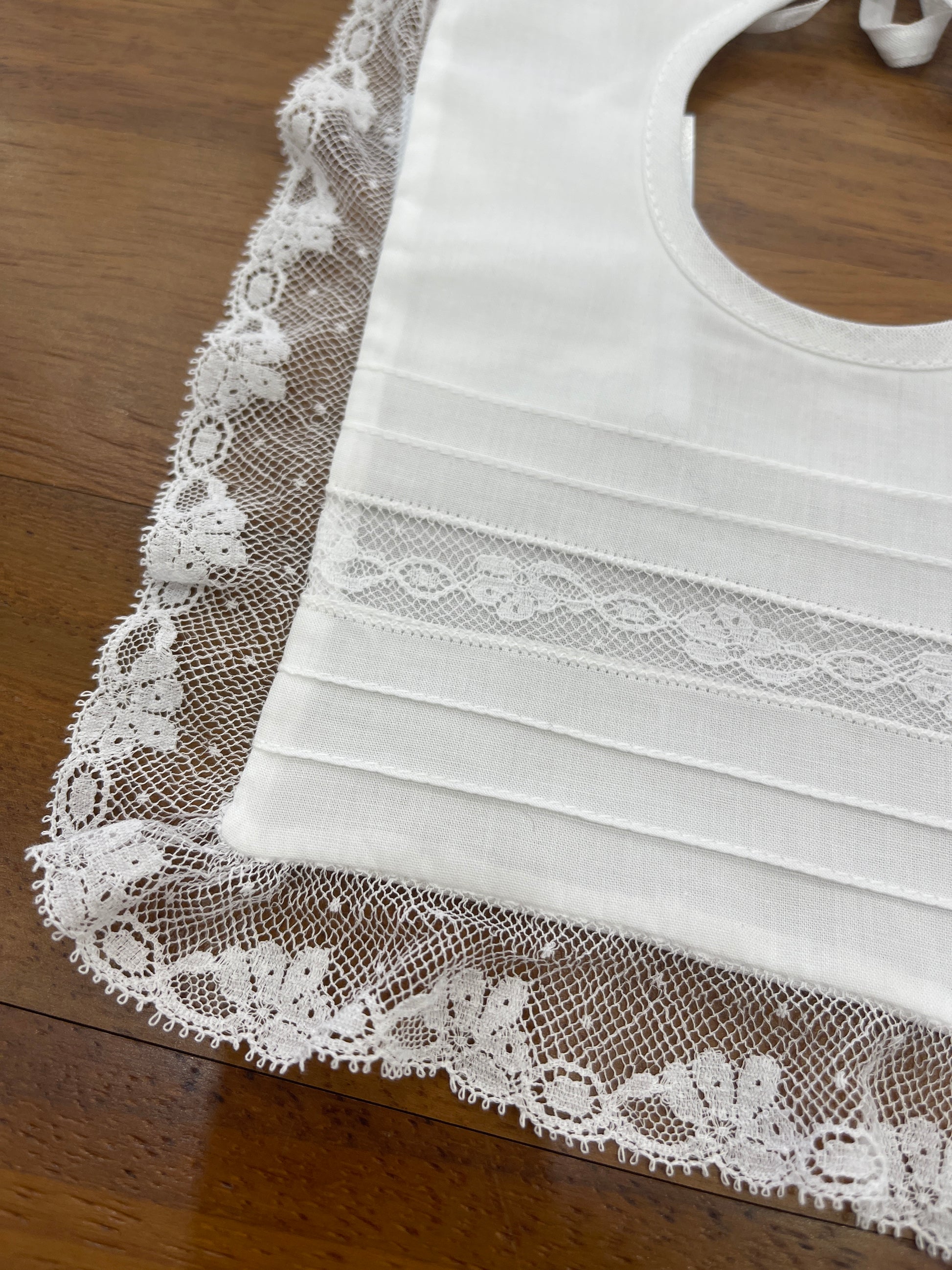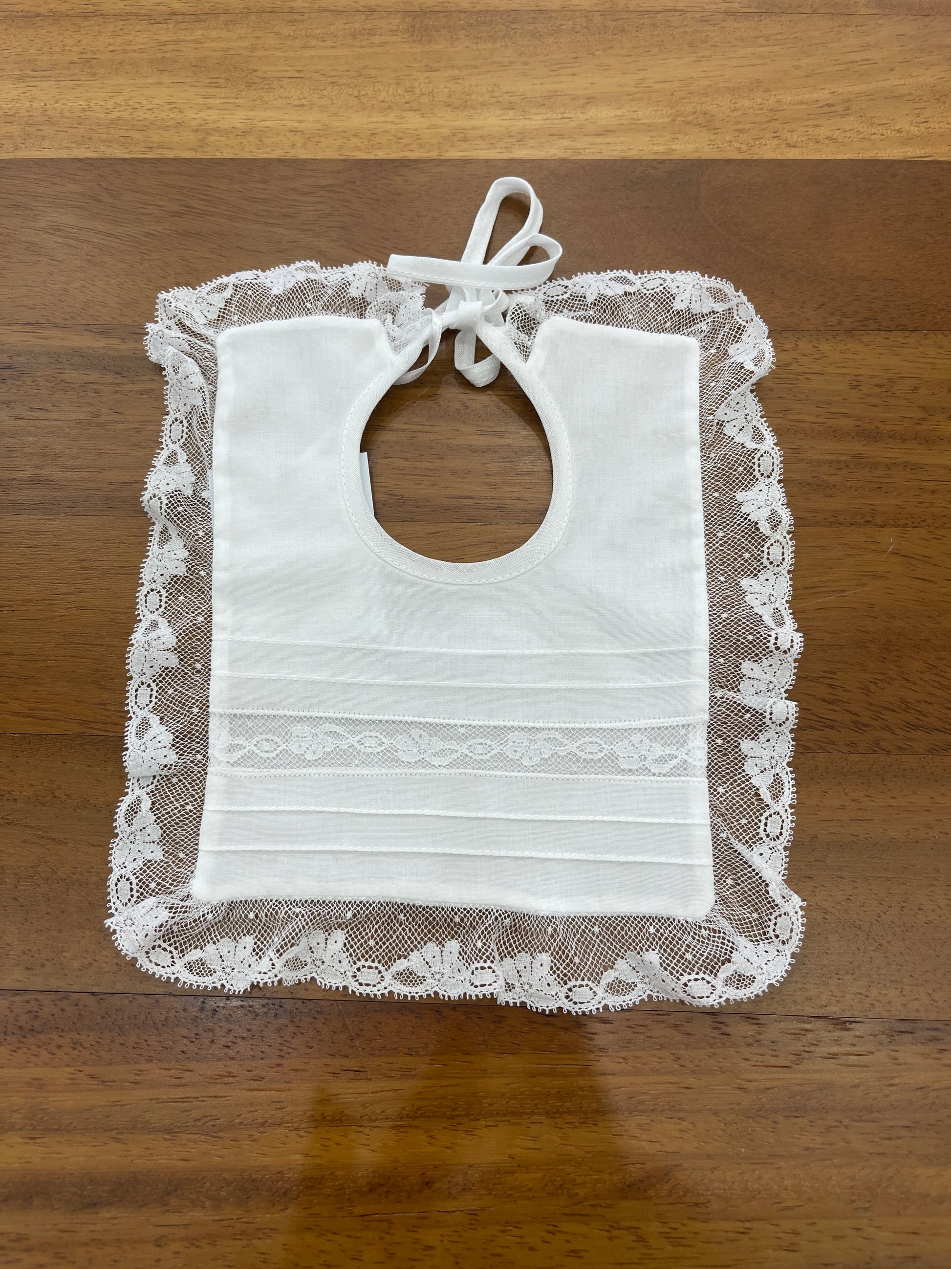 Questo bavaglino quadrato, realizzato in pregiata battista di cotone, è impreziosito da un delicato merletto che ne contorna i bordi, donando eleganza e raffinatezza. Sul davanti presenta eleganti pieghe arricchite da un merletto applicato con cura, che aggiunge dettaglio e stile al capo. La chiusura sul retro è garantita da un pratico laccetto, assicurando una vestibilità comoda e regolabile. Ideale per completare con classe ogni outfit, combina funzionalità e design in un accessorio distintivo.