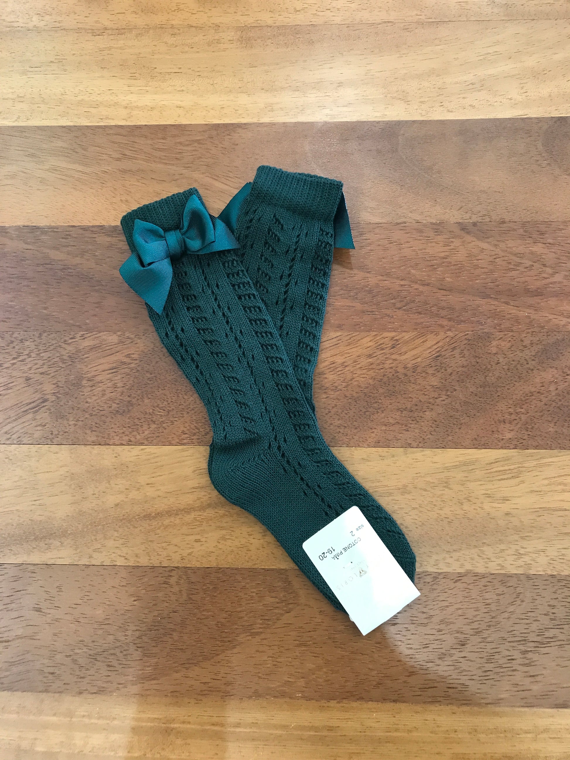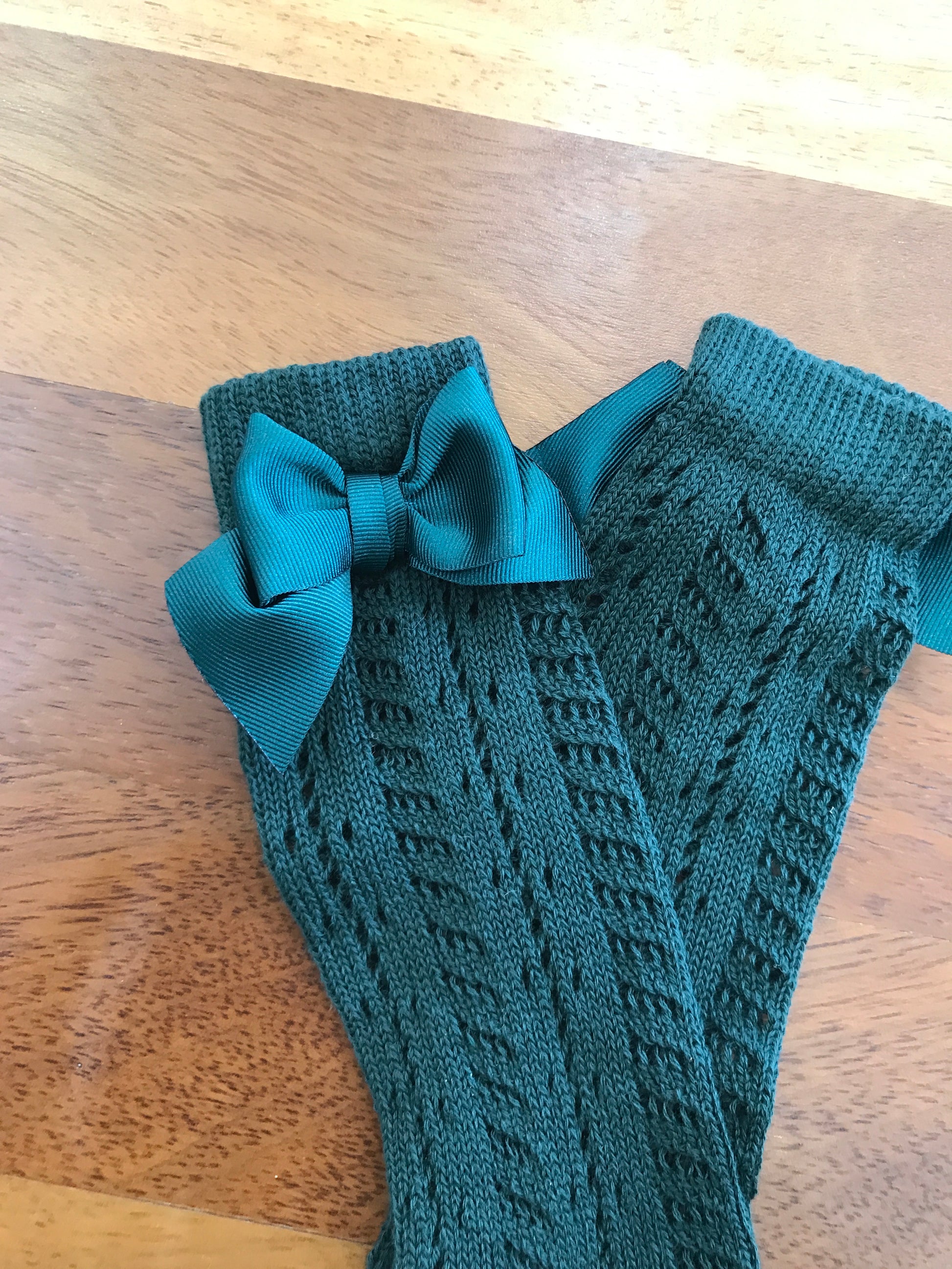 Calzini verde scuro in lana traforata, arricchiti da un elegante fiocchetto laterale.