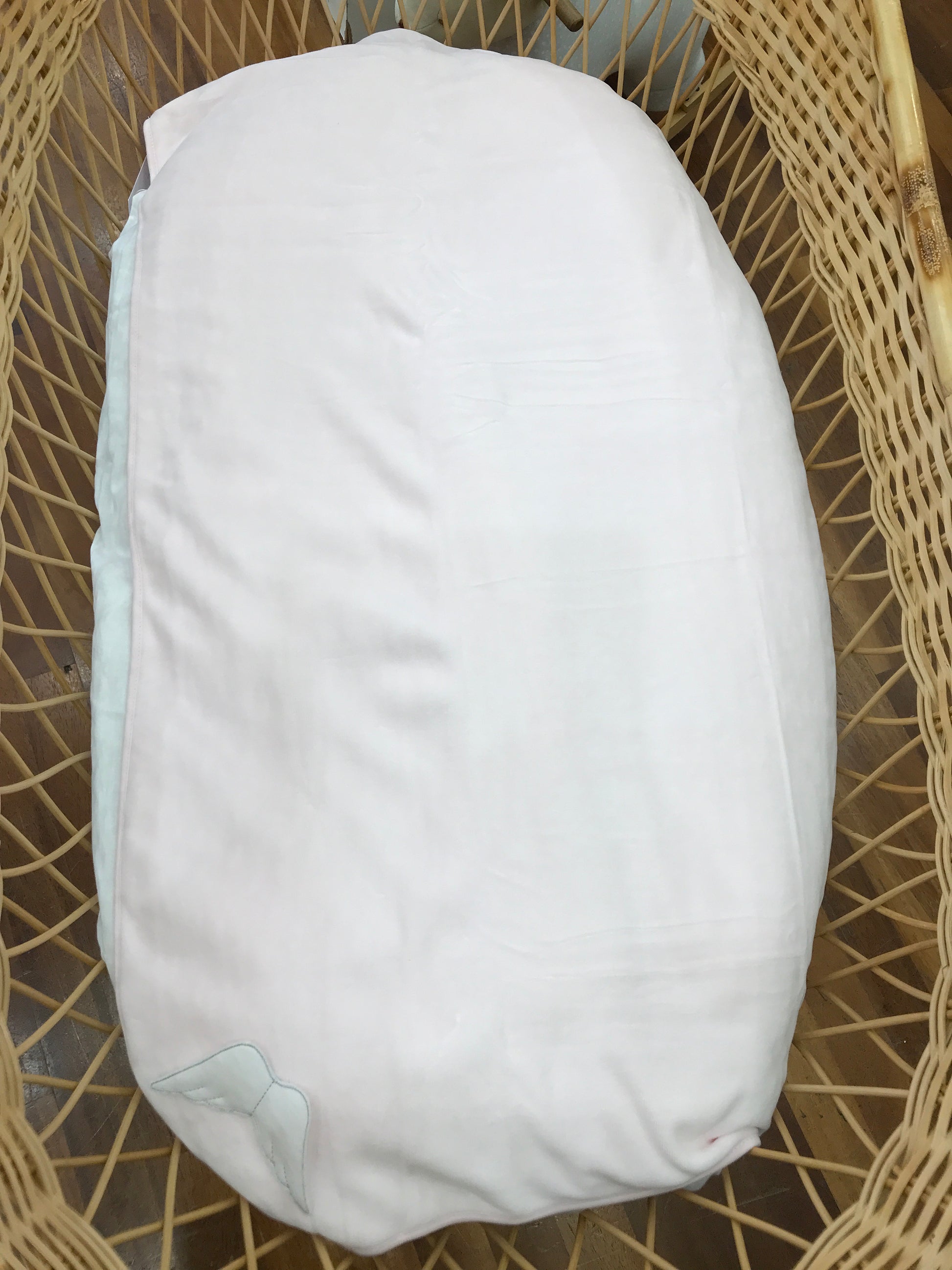 Coperta in ciniglia rosa arricchita da eleganti ali decorative bianche.