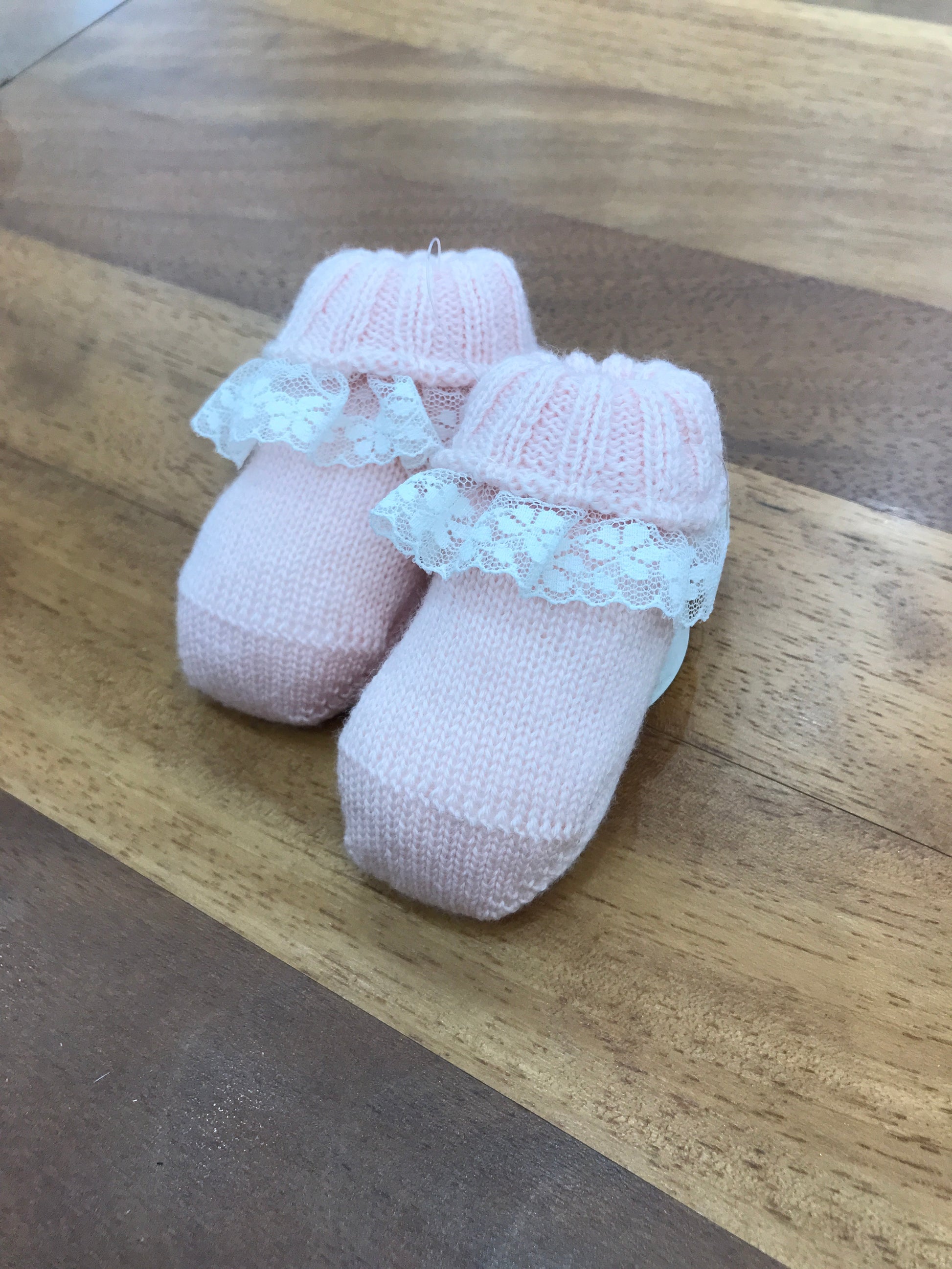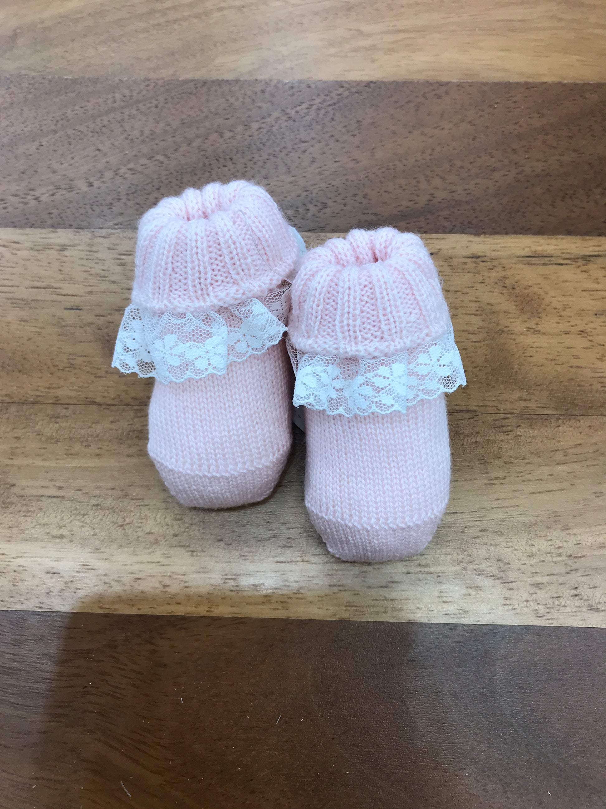 Babbucce rosa in lana, dotate di un delicato risvolto e rifinite con un elegante merletto.