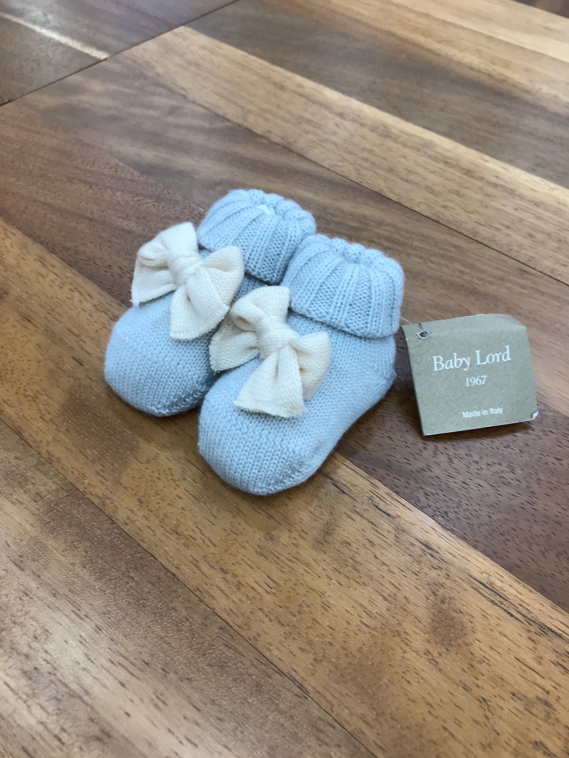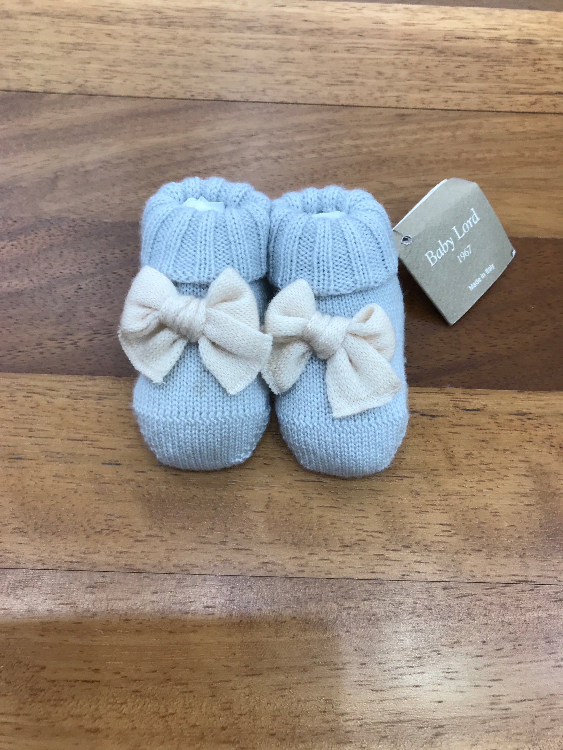 Morbide babbucce verdi in lana, caratterizzate da un risvolto e un elegante fiocco bianco posizionato frontalmente.