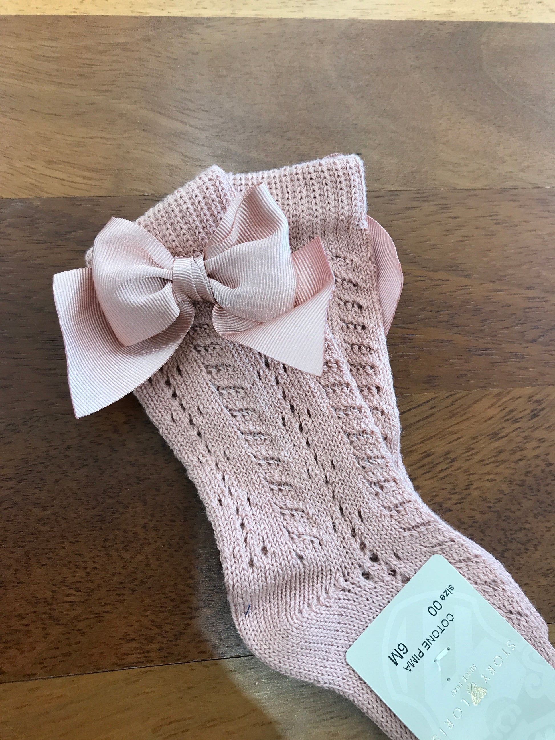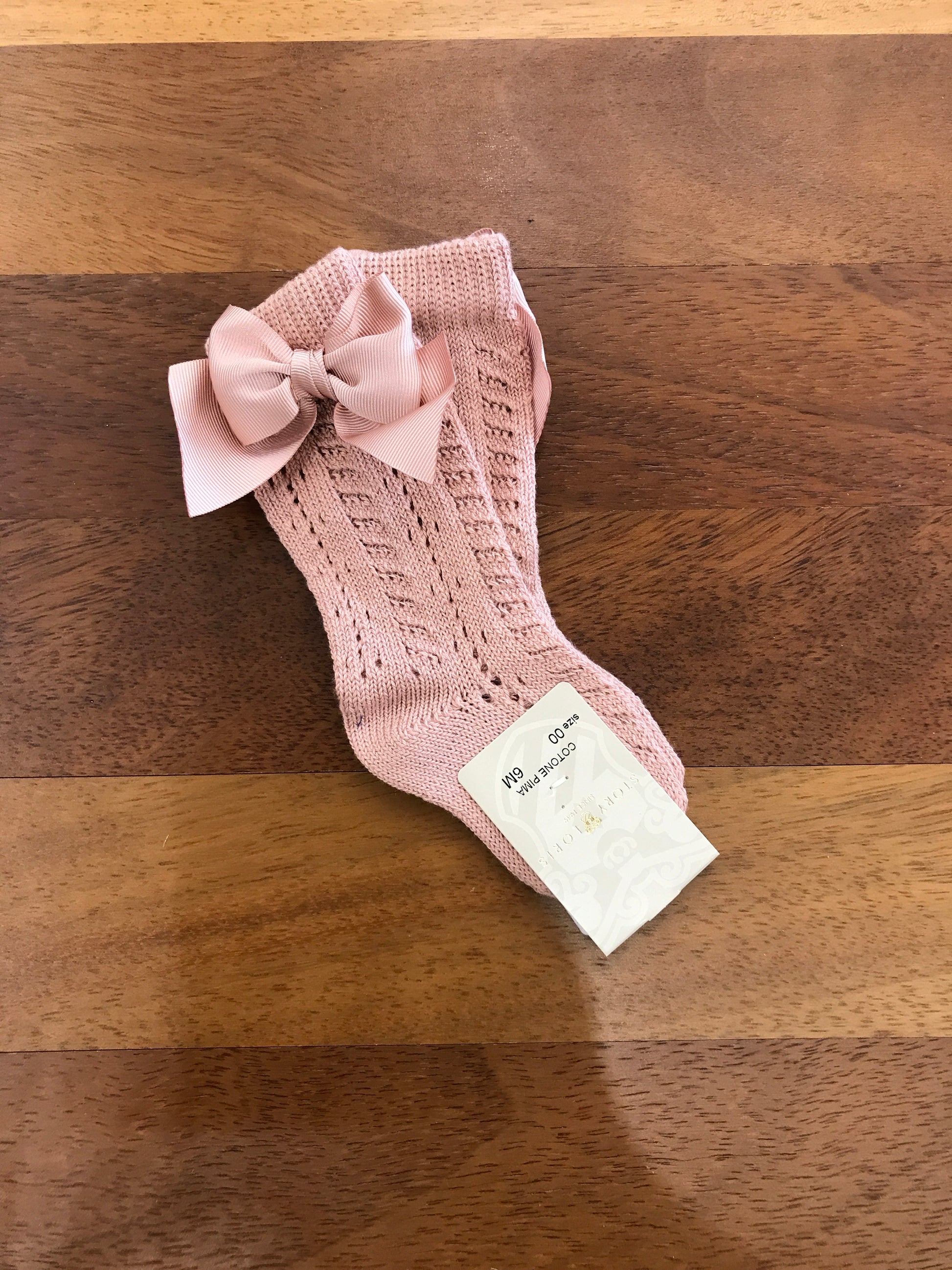 Calzini traforati in lana color rosso antico, arricchiti da un elegante fiocchetto laterale.