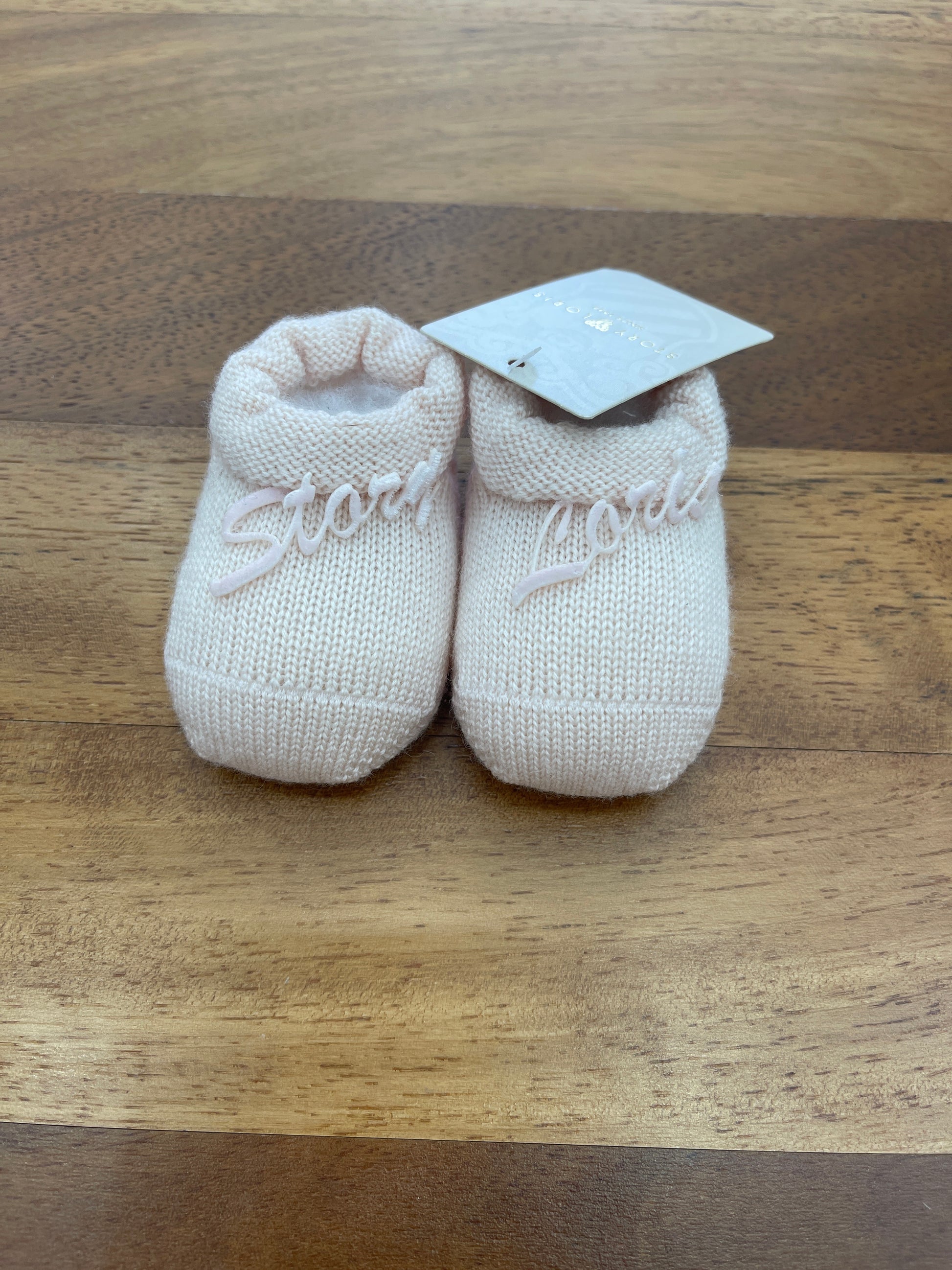 Morbide babbucce rosa in lana, arricchite da un piccolo risvolto e decorate con la scritta "Story Loris" in velluto.