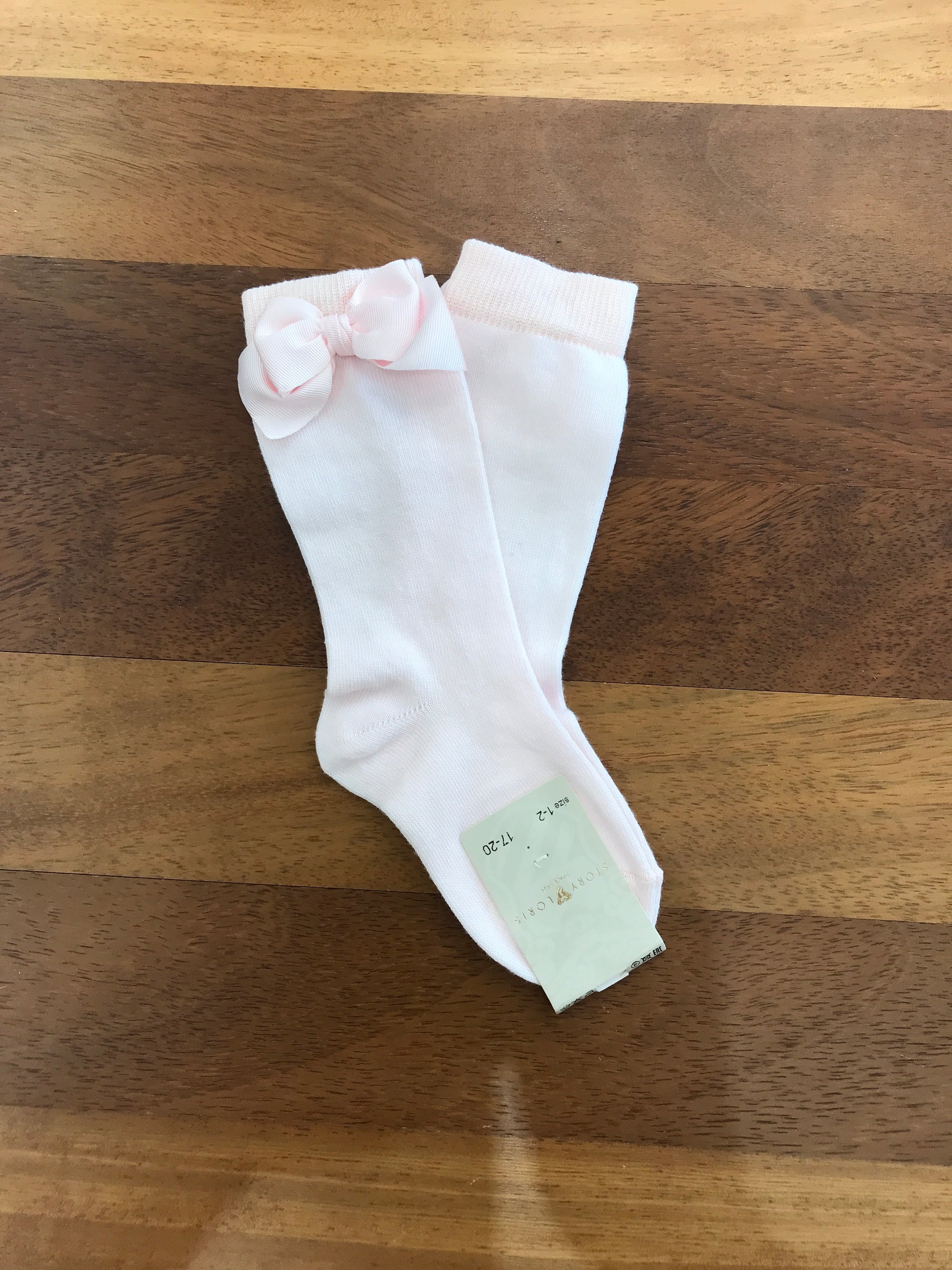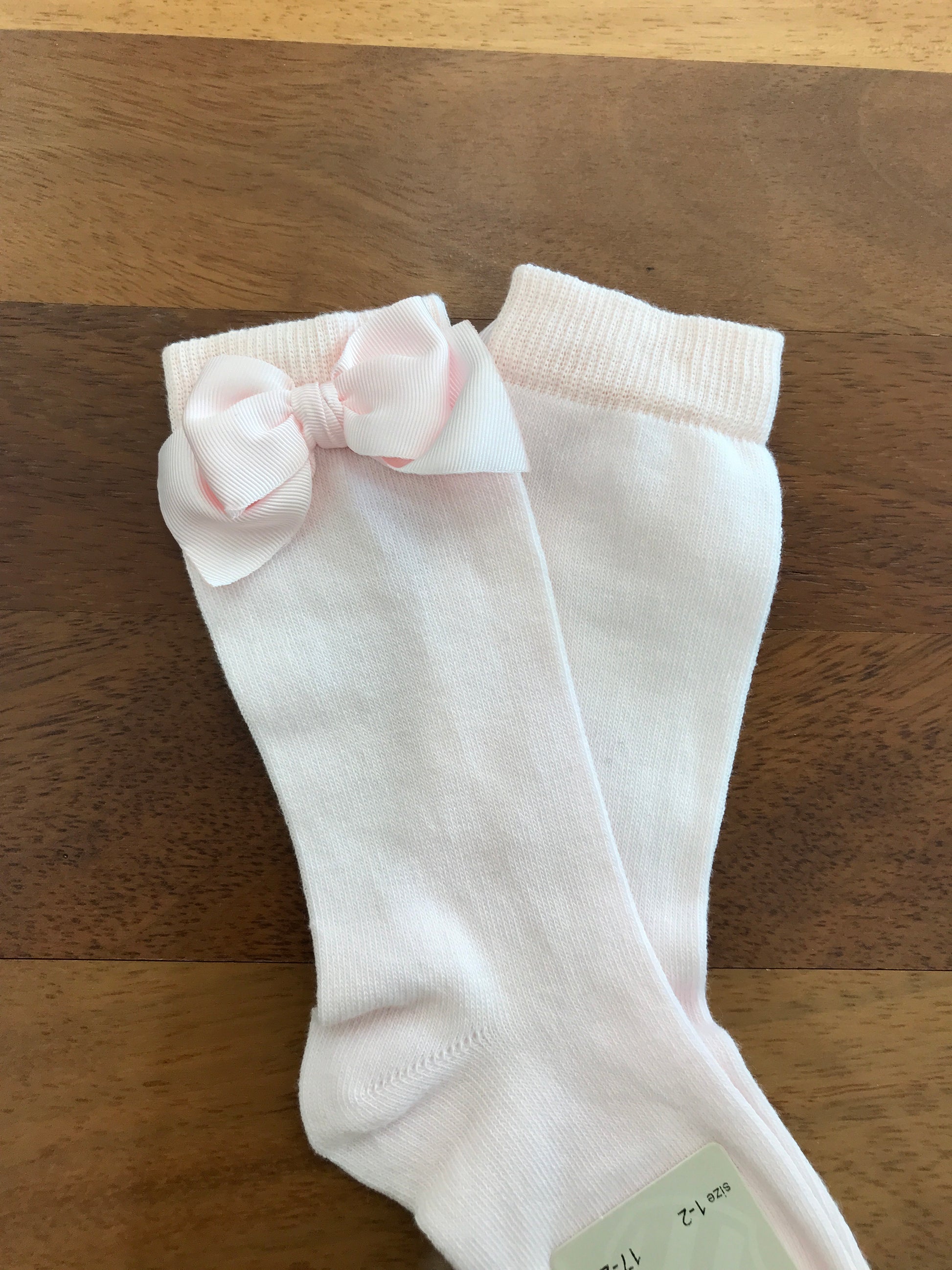 Calzini rosa chiaro in lana, arricchiti da un delicato fiocchetto posizionato lateralmente.