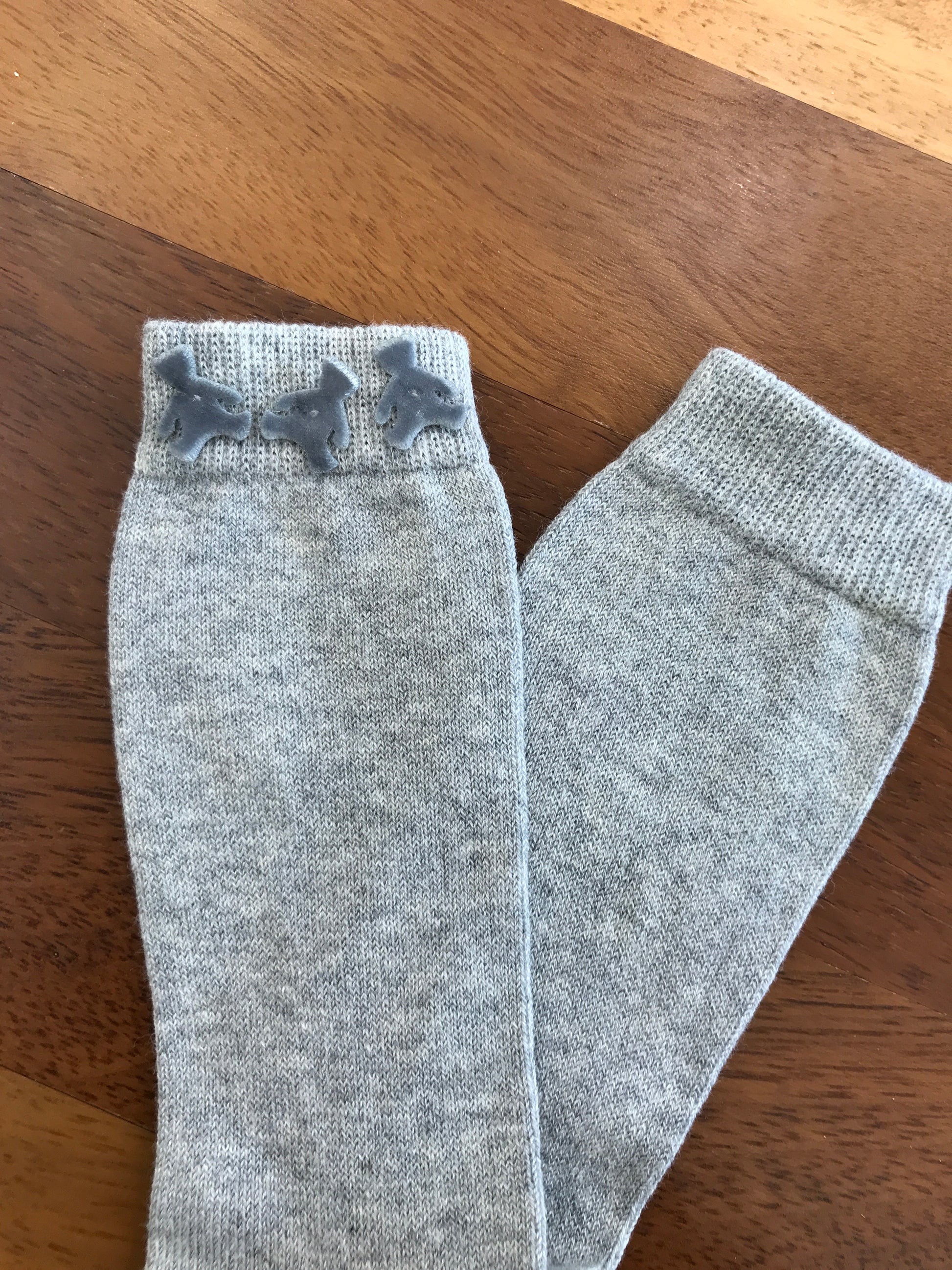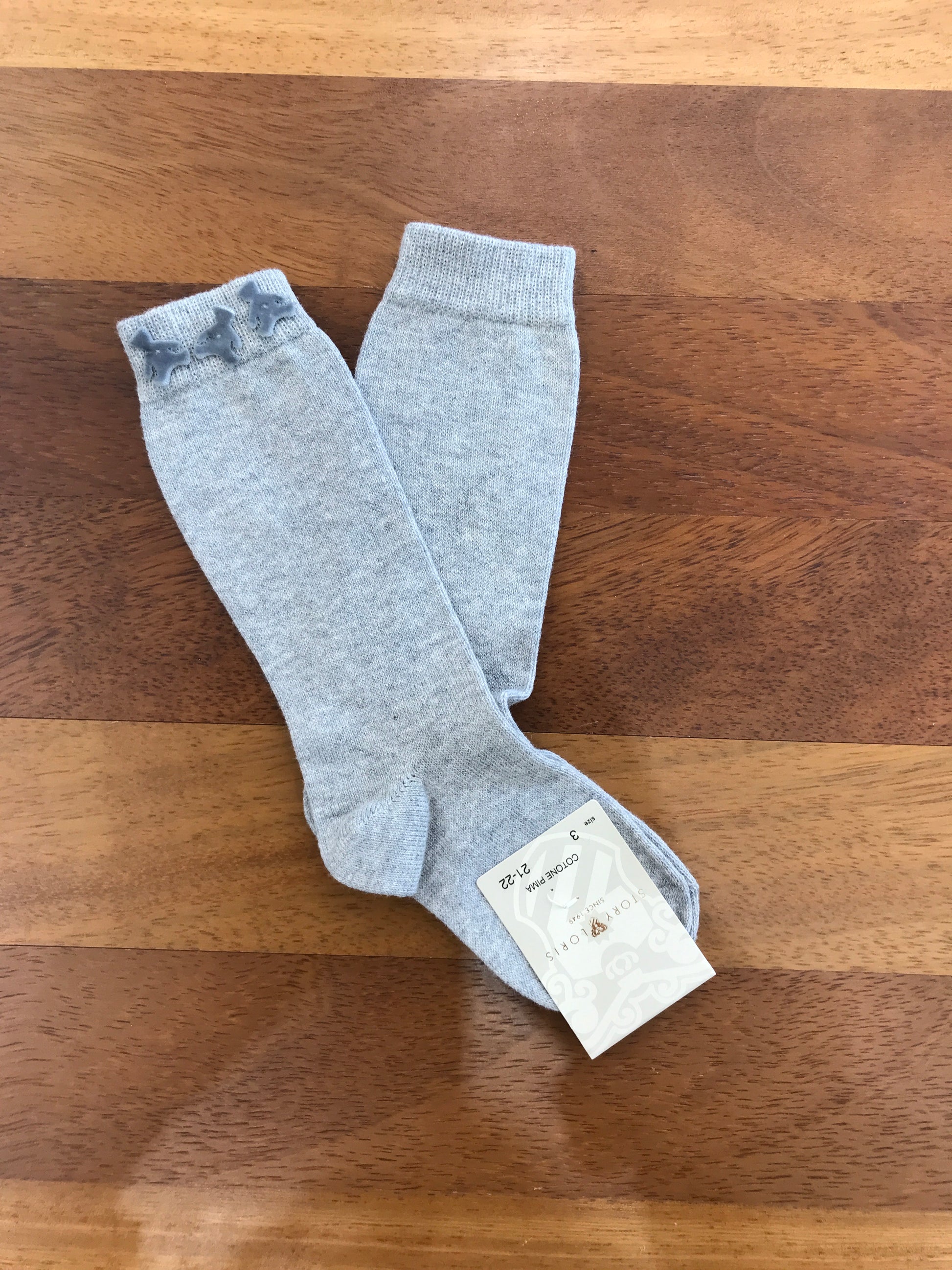 Calzini in lana grigio chiaro, arricchiti da orsetti in velluto posizionati sulla parte superiore ai due lati.