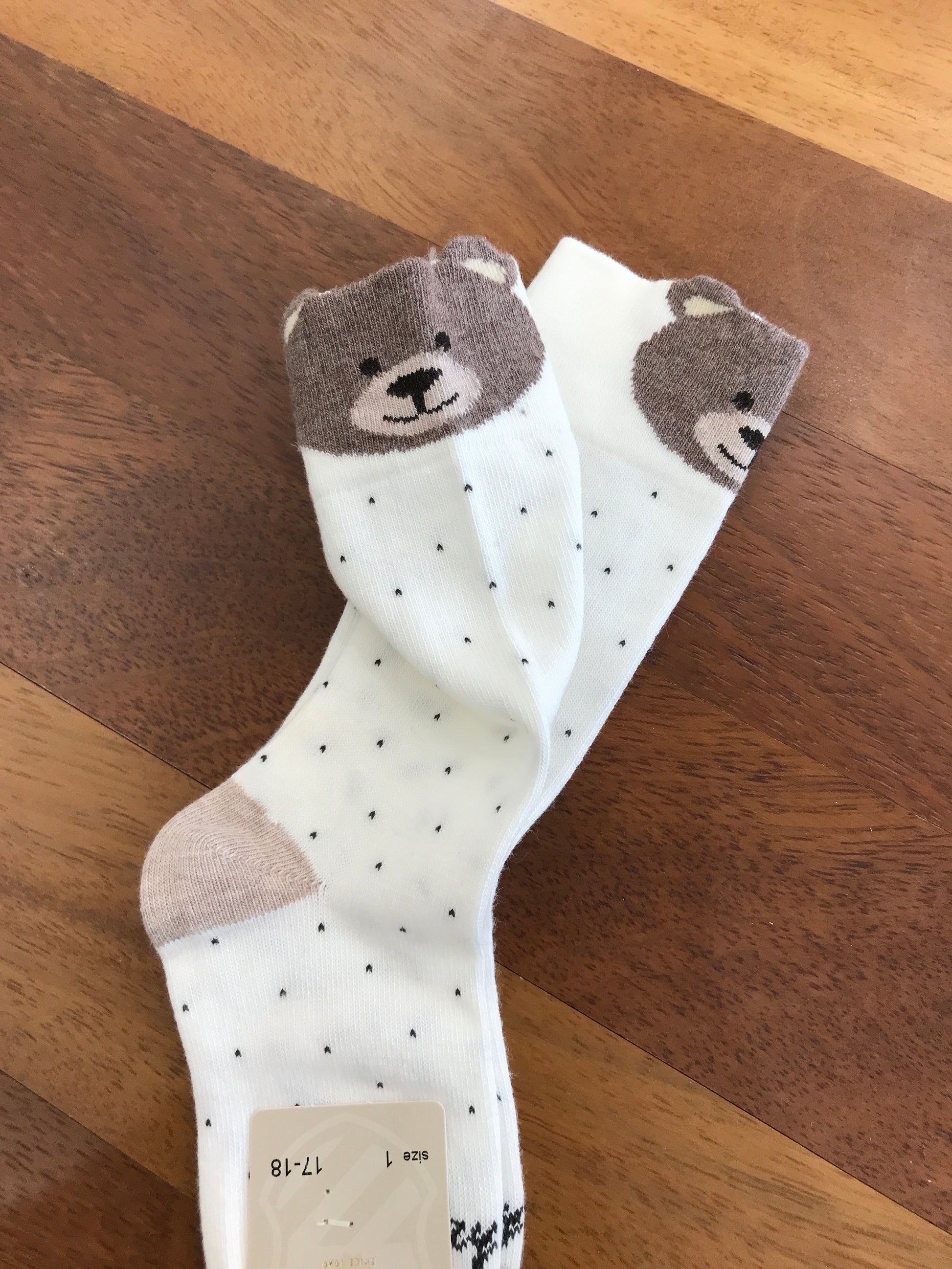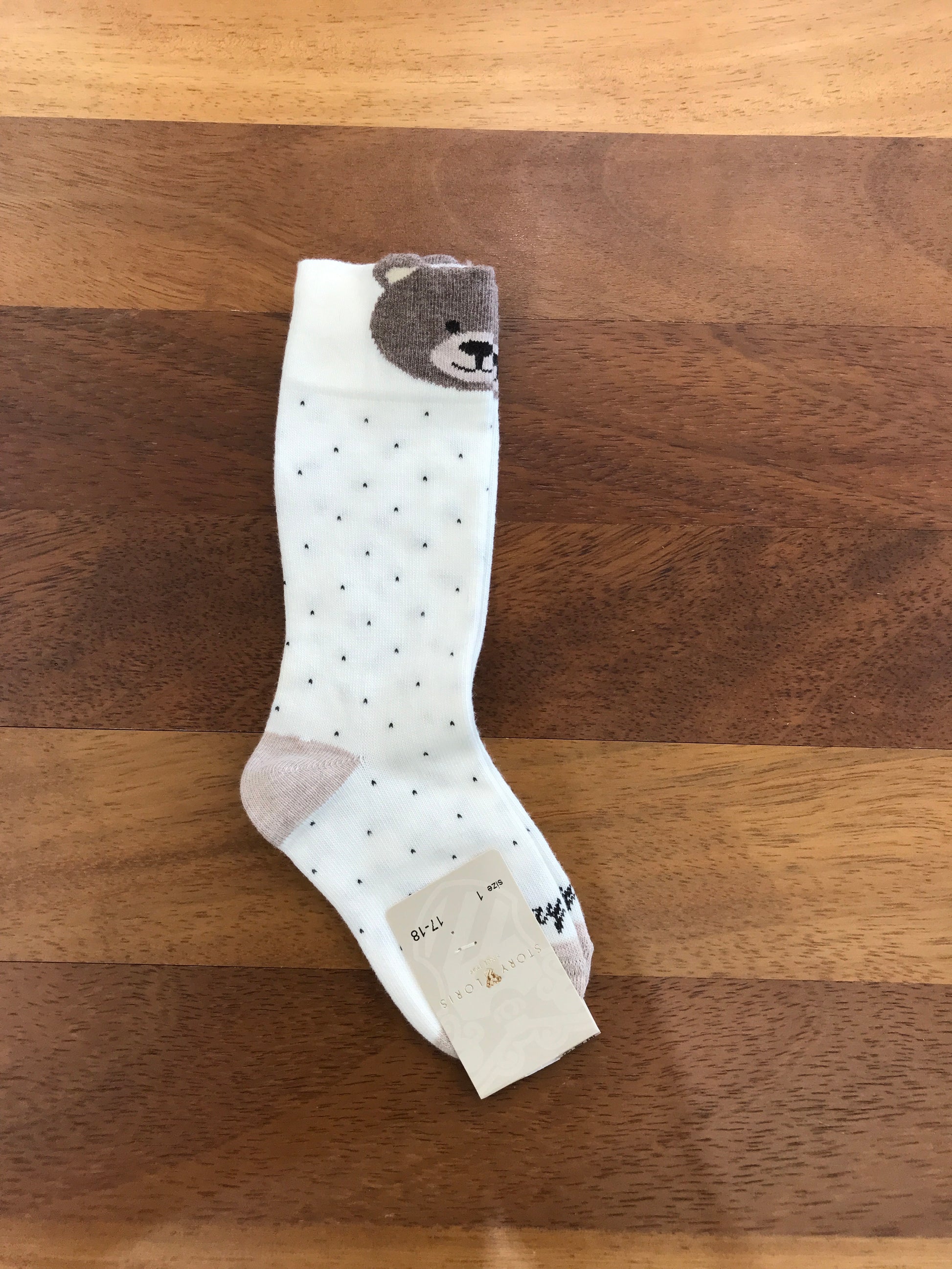 Calzini color panna realizzati in lana, decorati con pois e un orsetto posizionato nella parte superiore del calzino.