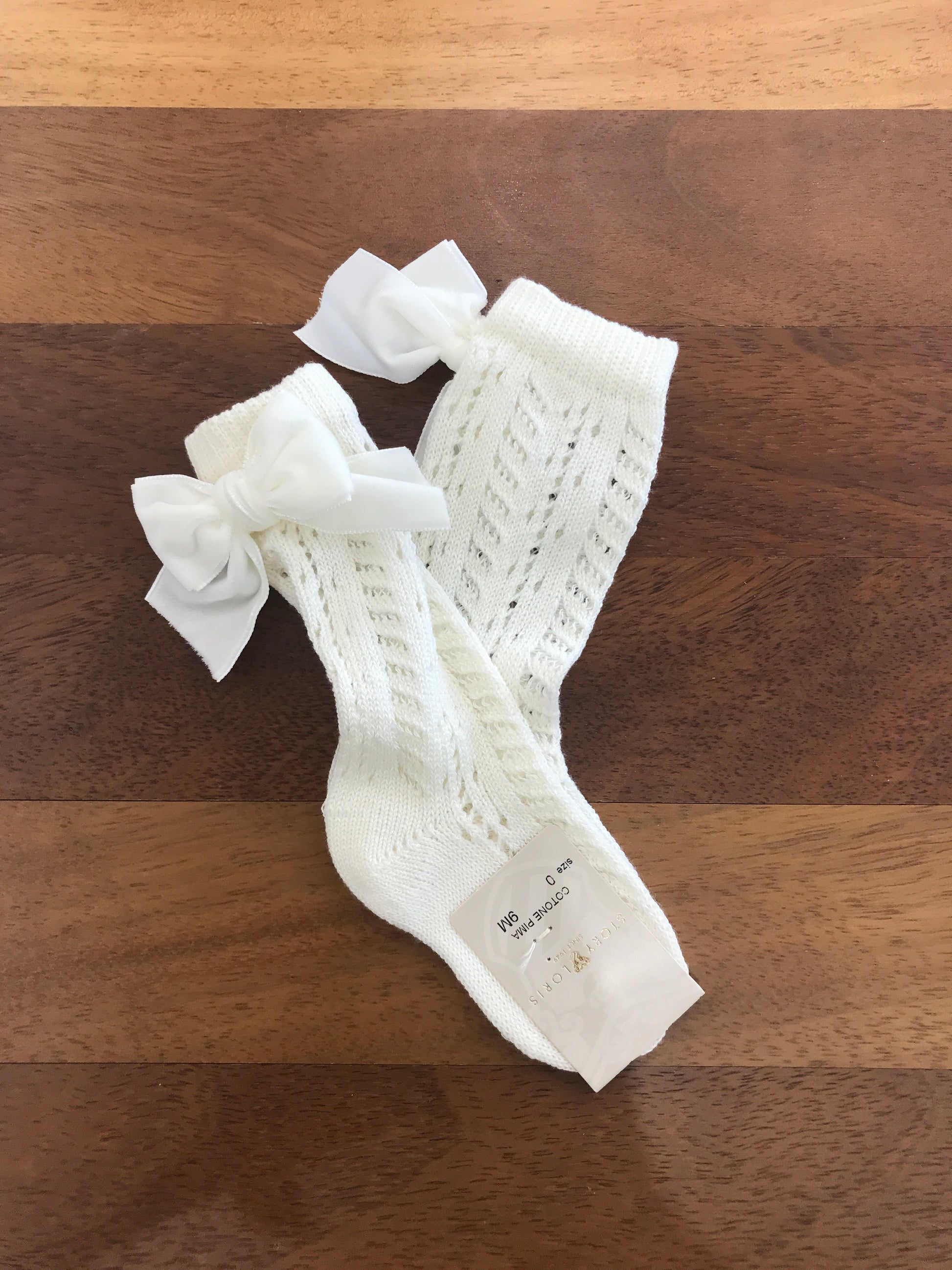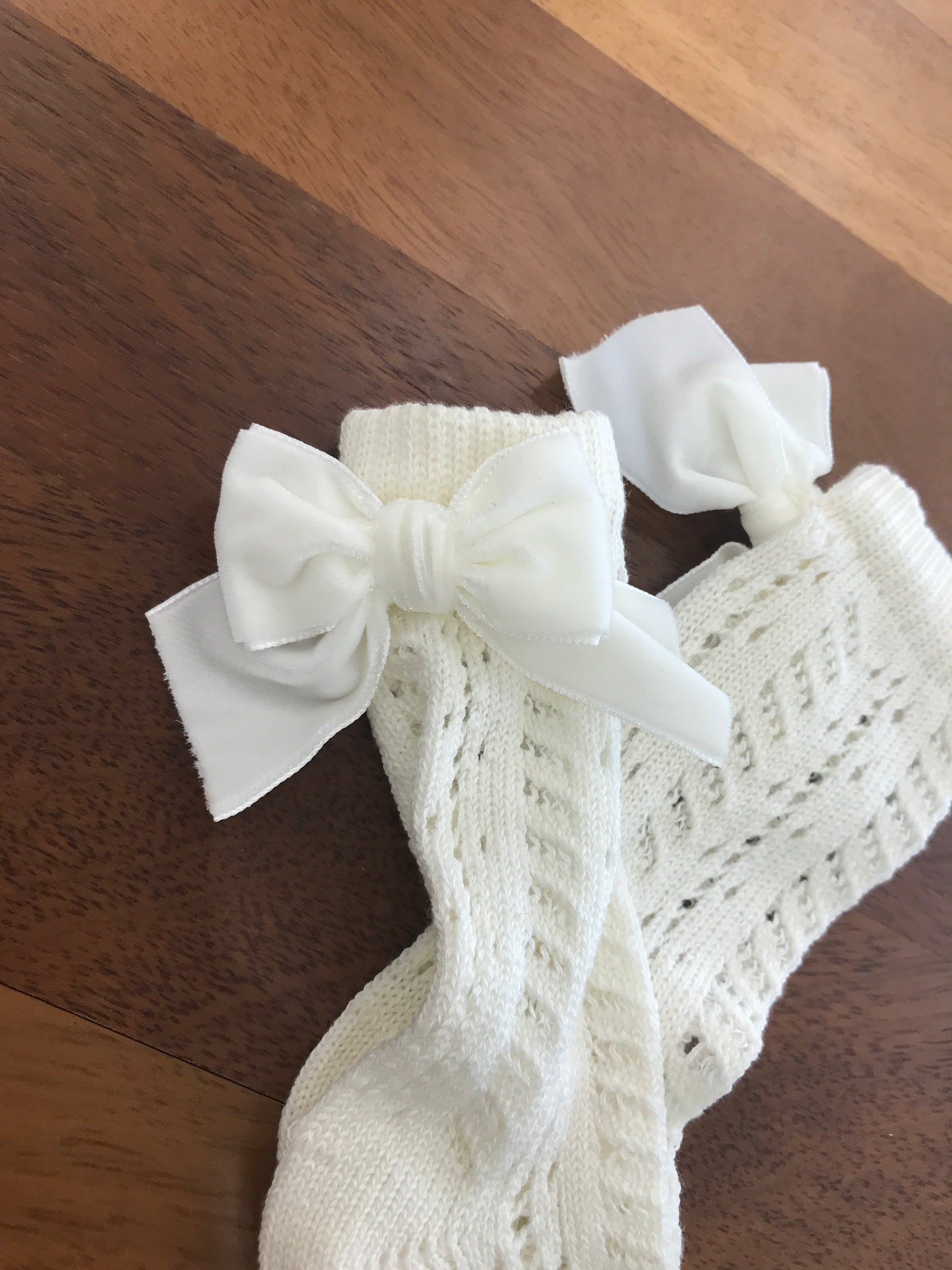 Calzini color crema realizzati in lana, caratterizzati da un motivo traforato e decorati con due fiocchi laterali in velluto tono su tono.