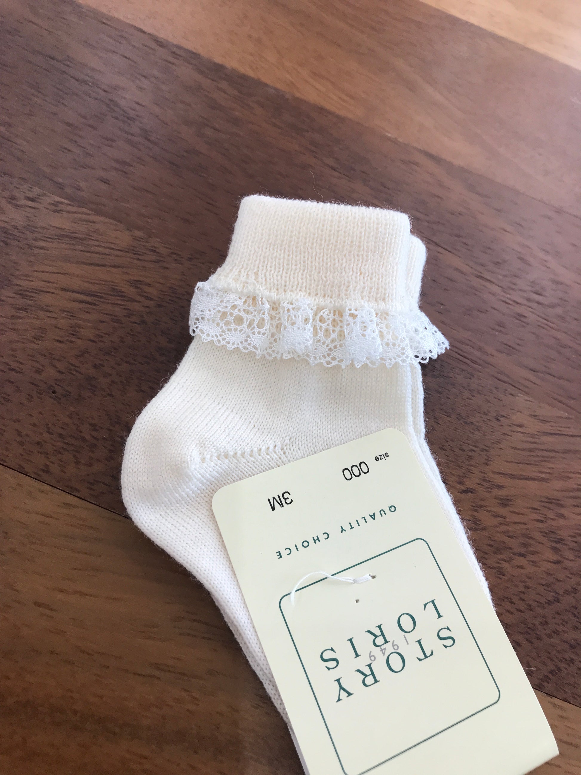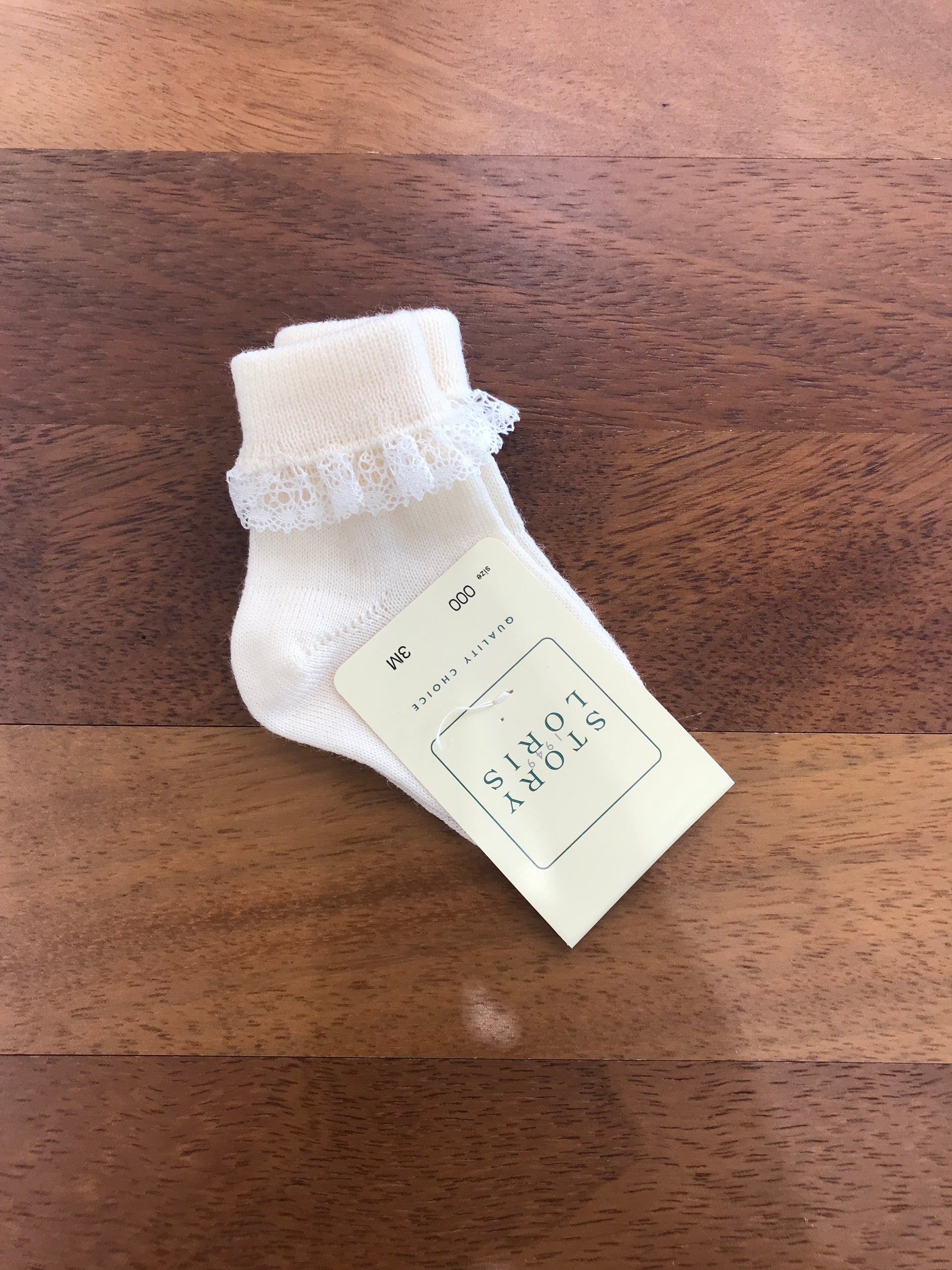 Calzino in lana avorio caratterizzato da un ricamo a punto festone sulla parte superiore del bordo.