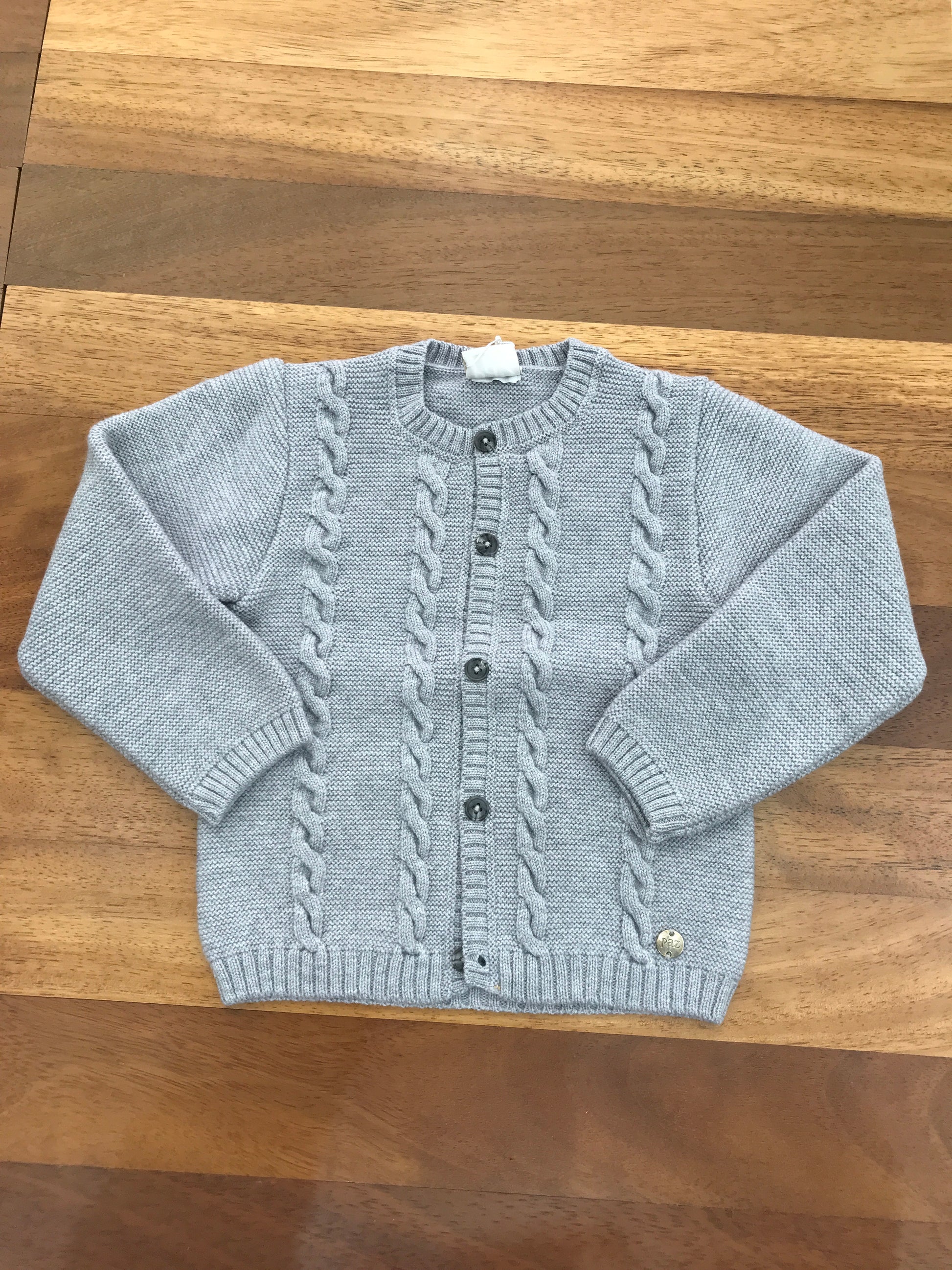 Cardigan in lana color grigio, caratterizzato da una lavorazione a trecce sul davanti.