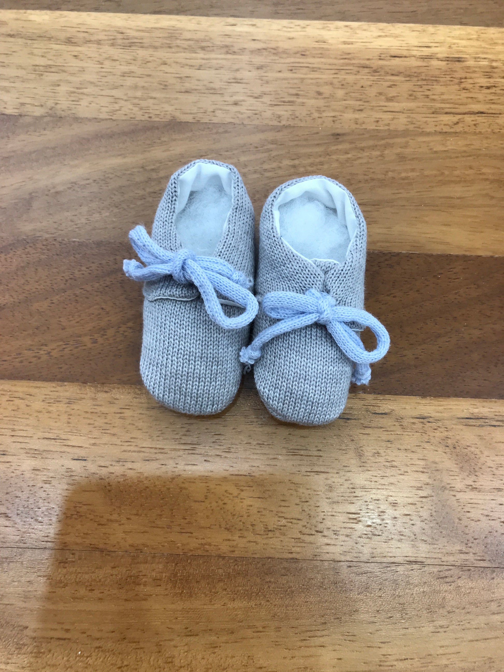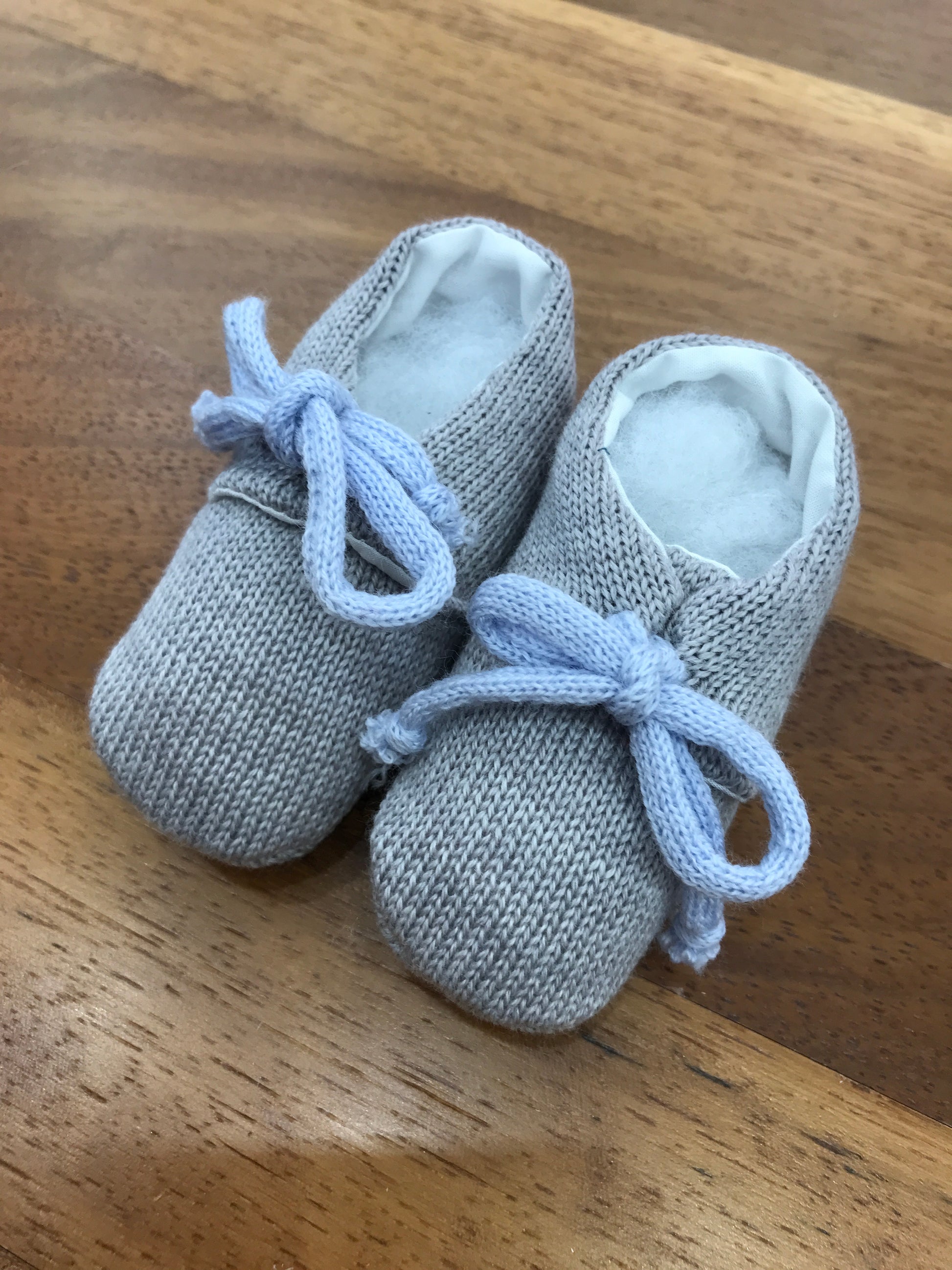 Morbide scarpine in lana di tonalità grigio chiaro decorate con un delicato fiocco azzurro.