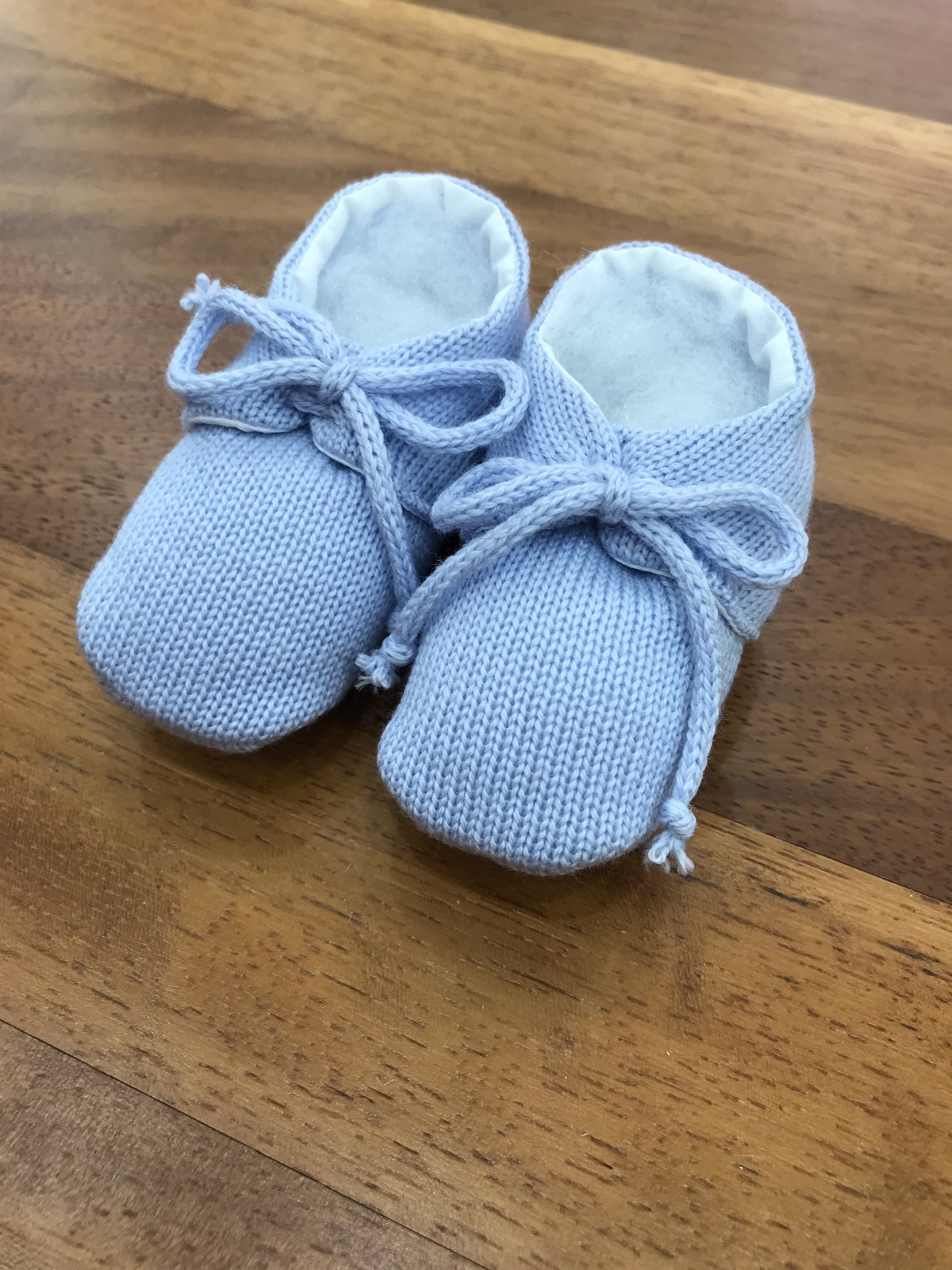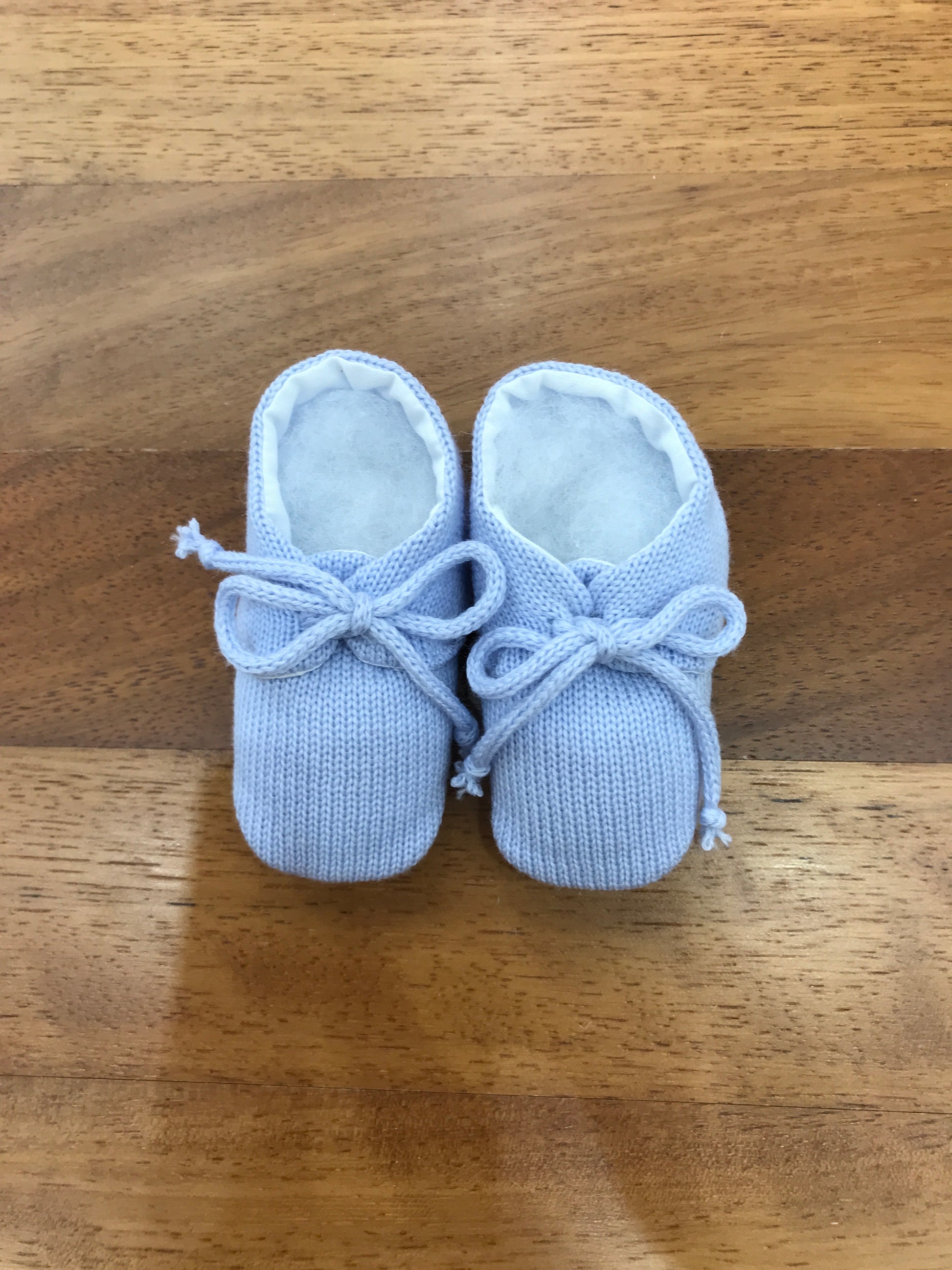 Morbidissime babbucce in lana tinta celeste, decorate con un delicato fiocchetto dello stesso colore sulla parte anteriore.