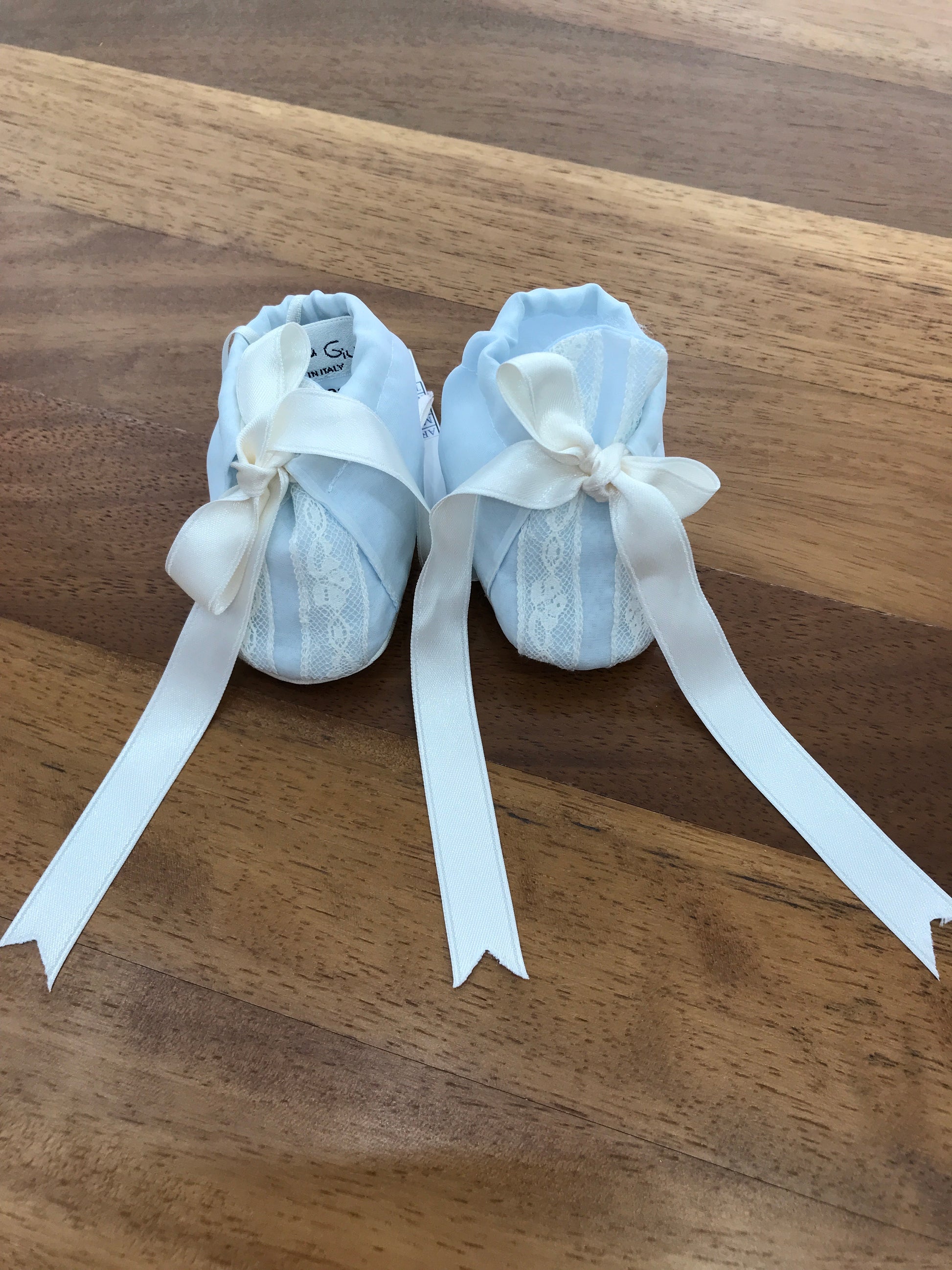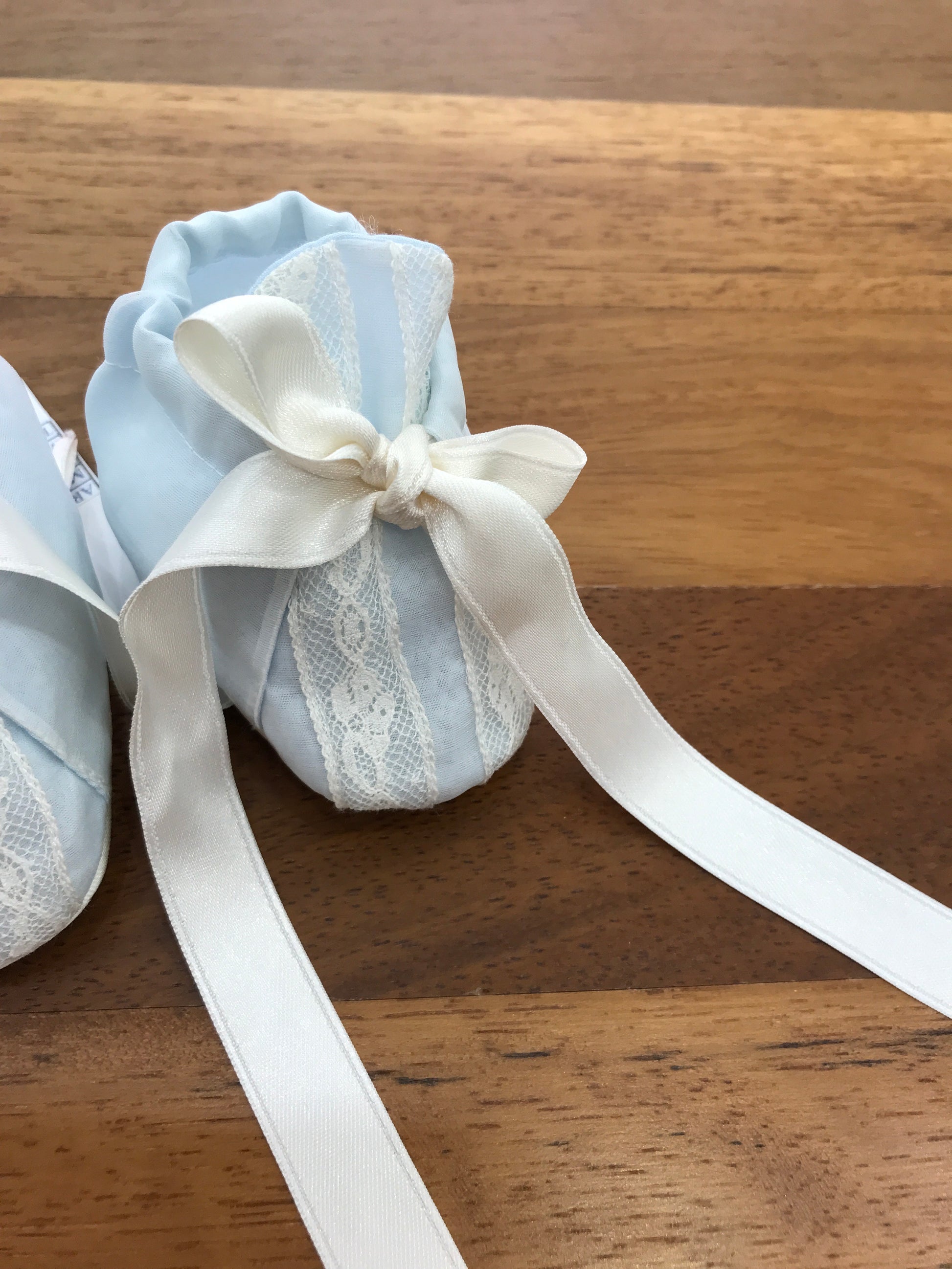 Scarpine realizzate in organza di seta color cielo, decorate sul davanti con un motivo valancienne a due strisce e chiuse da un fiocchetto.