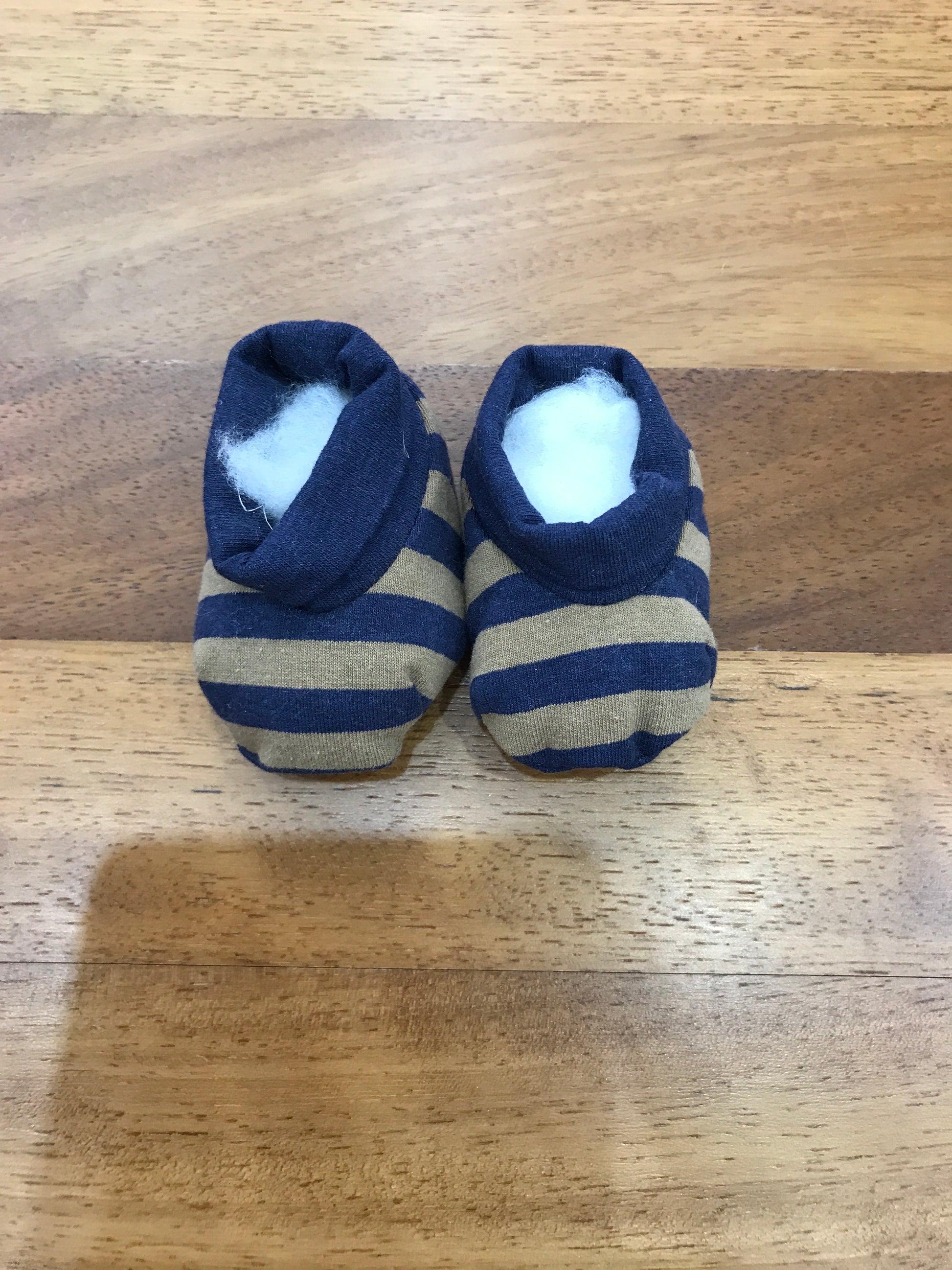 Morbide babbucce in caldo cotone, caratterizzate da una combinazione di colori chiari con righe blu e tortora.