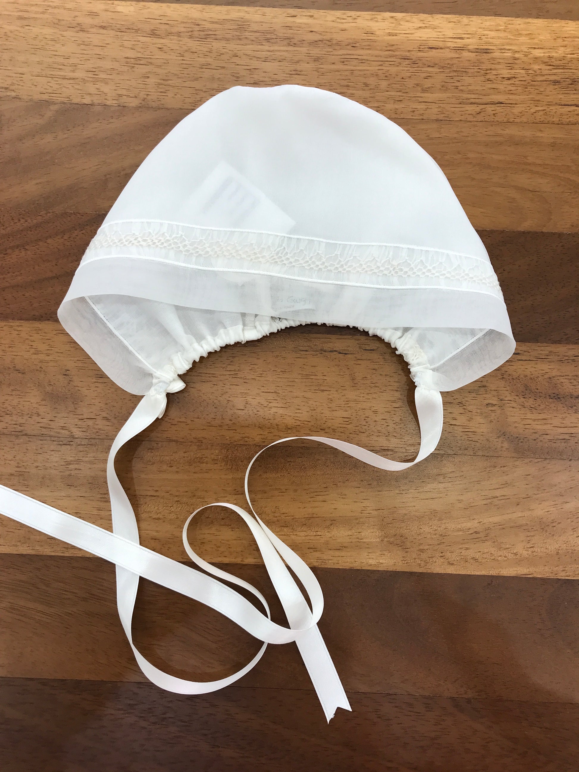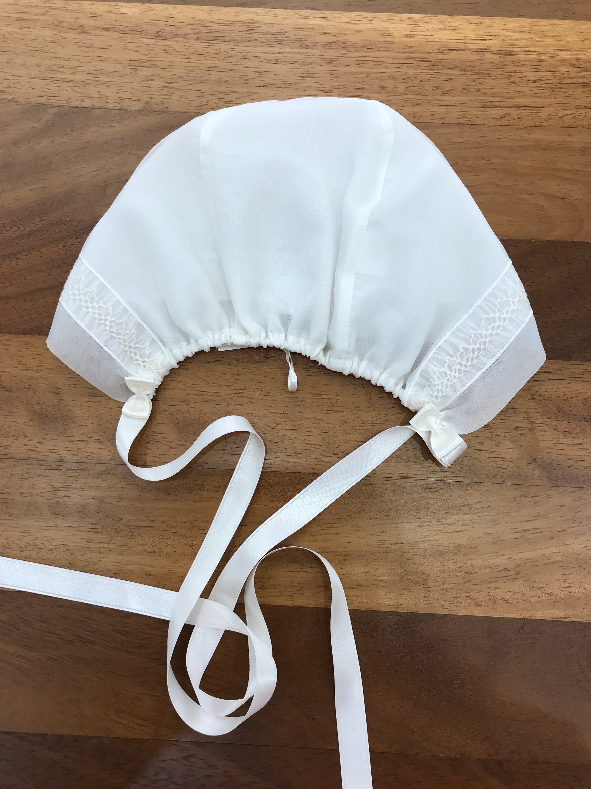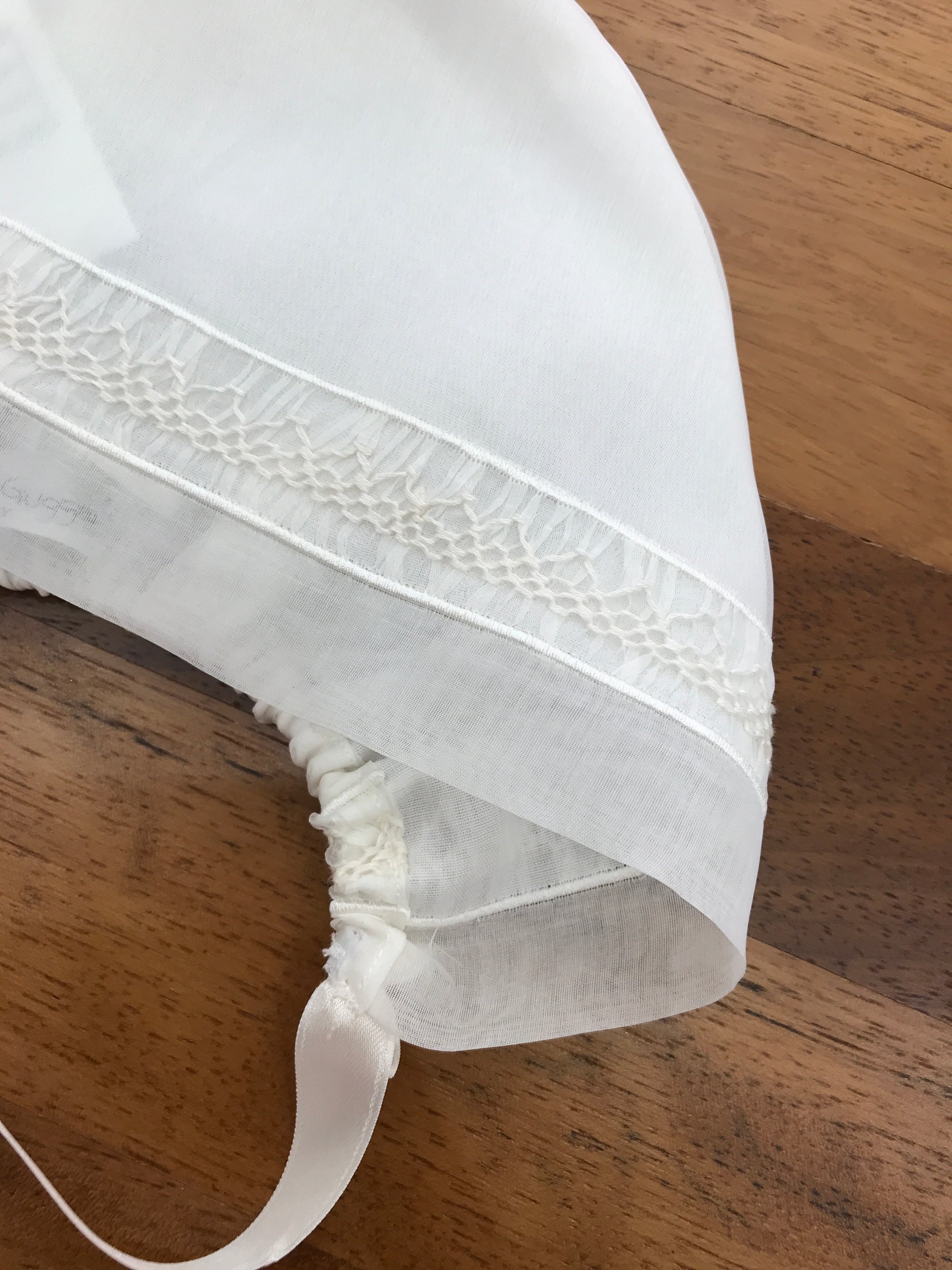 Cuffia in seta organza color avorio, arricchita da una fascia raffinata realizzata con punto smock, completata da una fascia bianca in organza di seta.