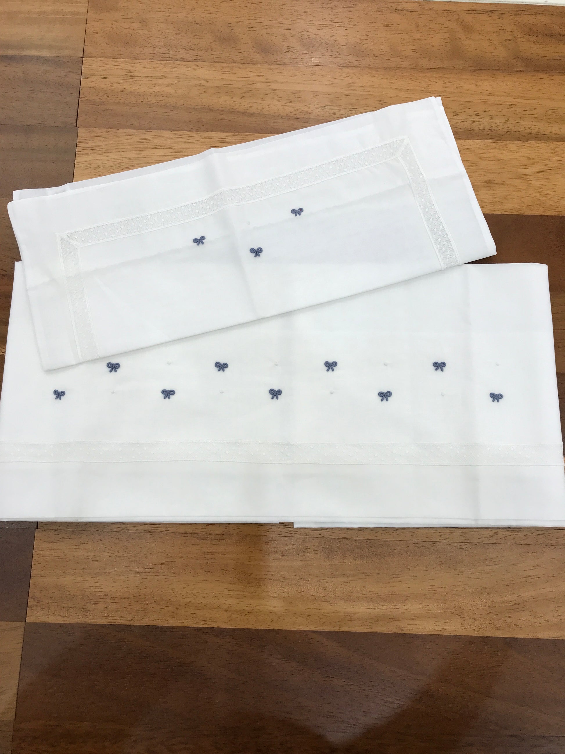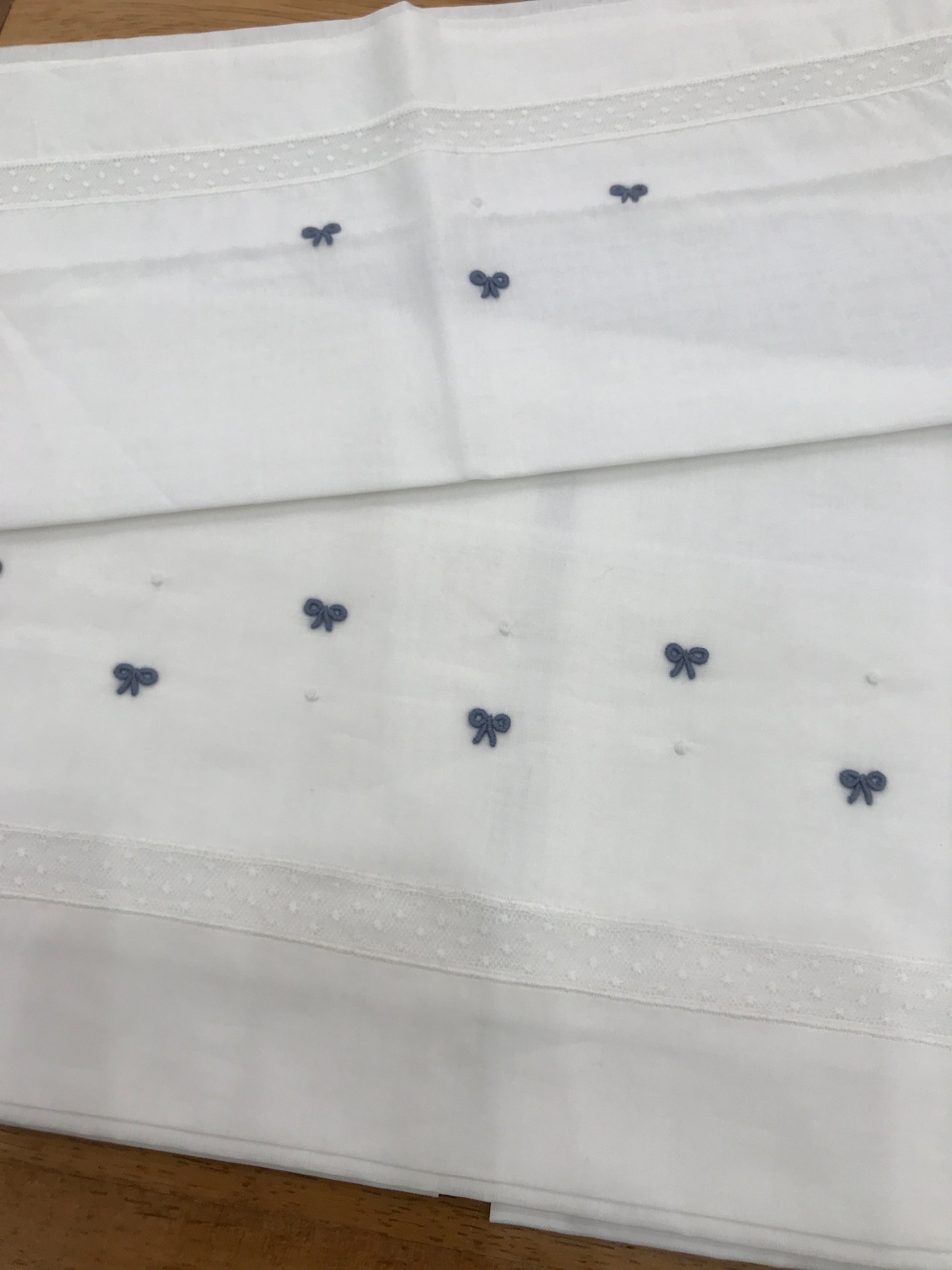 Lenzuola bianche arricchite da un delicato merletto ricamato, con fiocchetti blu e pois ricamati; la federa del cuscino presenta la medesima raffinata decorazione.