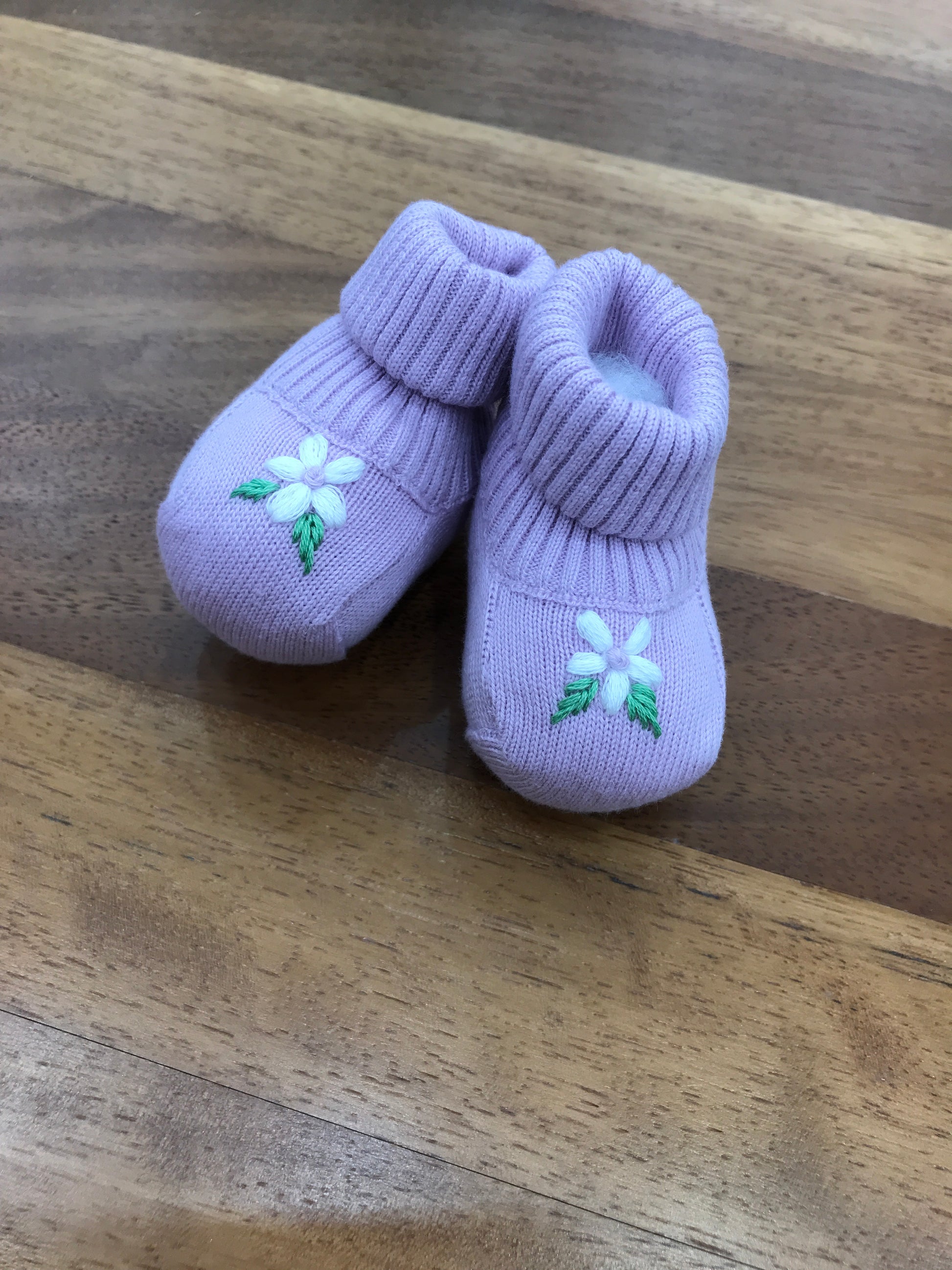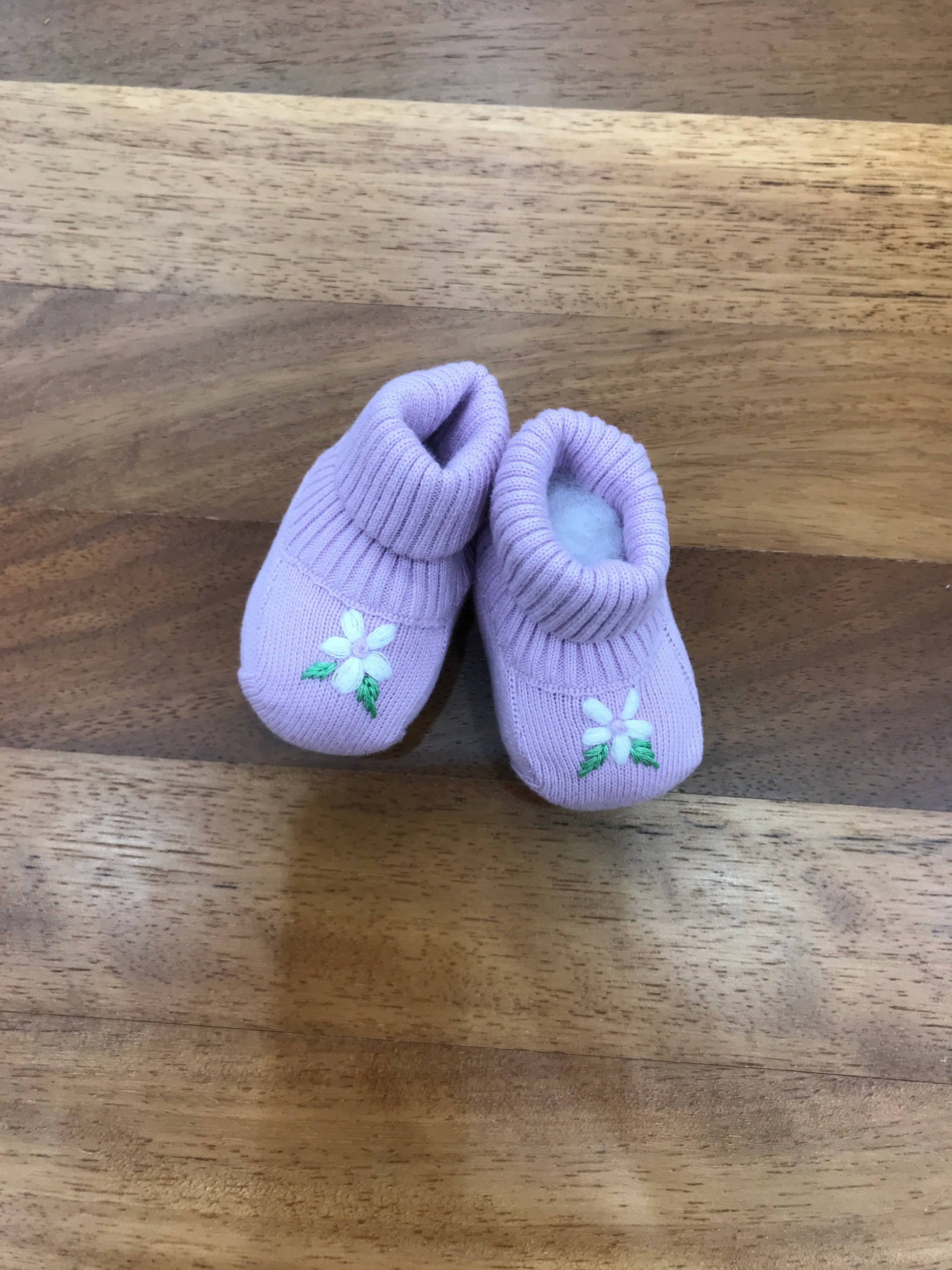 Babbuccia in lana color glicine, caratterizzata da un piccolo risvolto e da un ricamo a forma di margherita sul davanti.