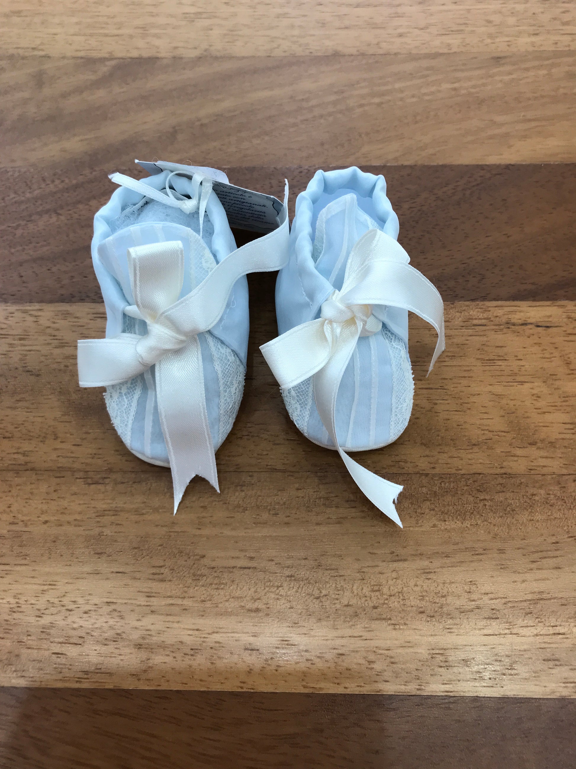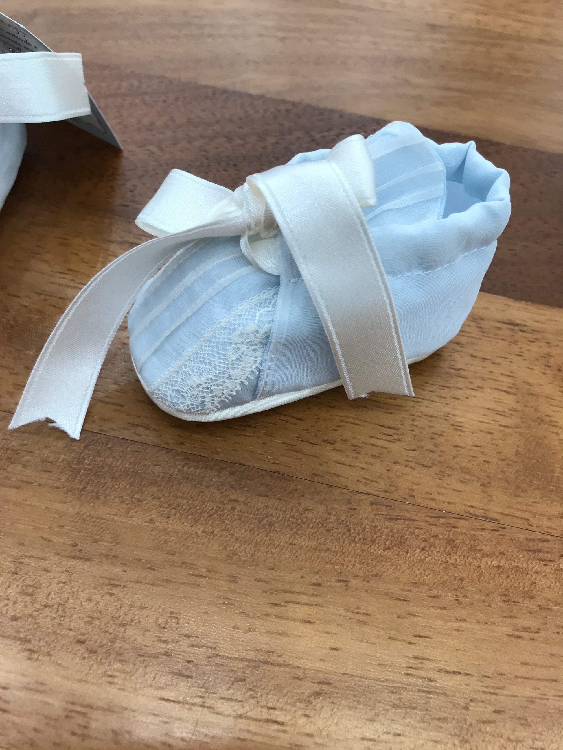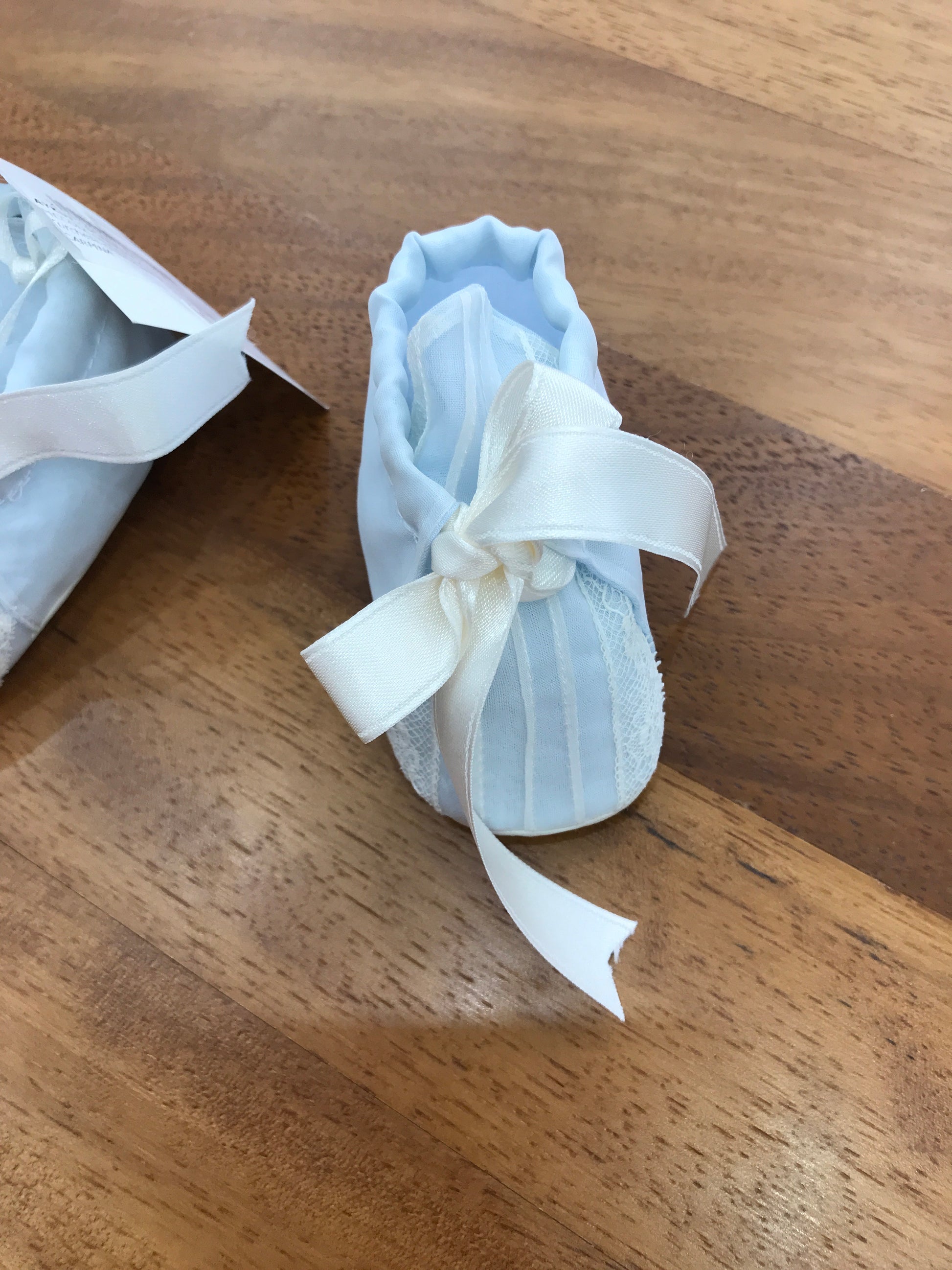 Scarpine realizzate in organza di seta color cielo, arricchite sul davanti da un'applicazione di valencienne e organza avorio, con chiusura raffinata a fiocchetto.