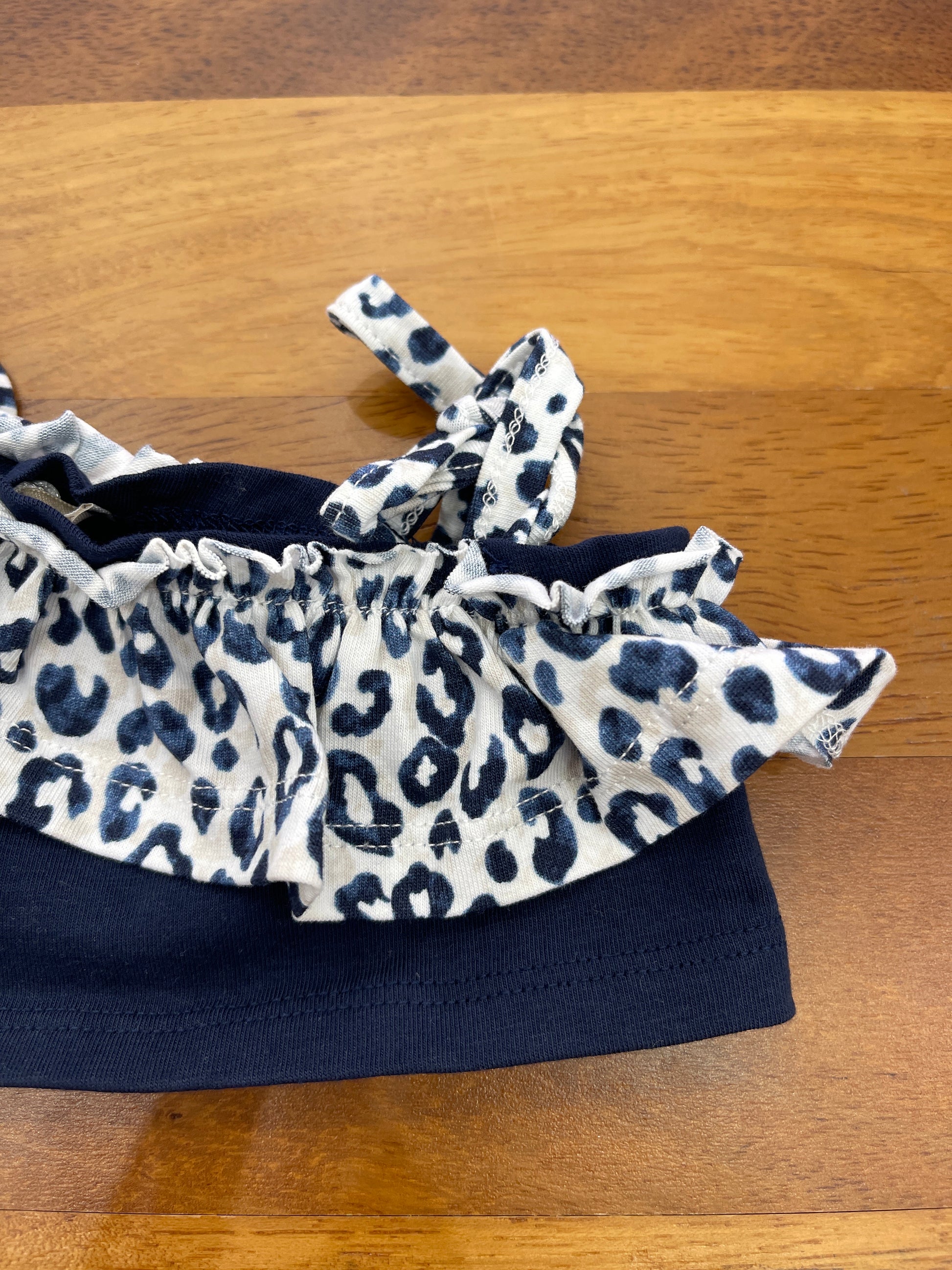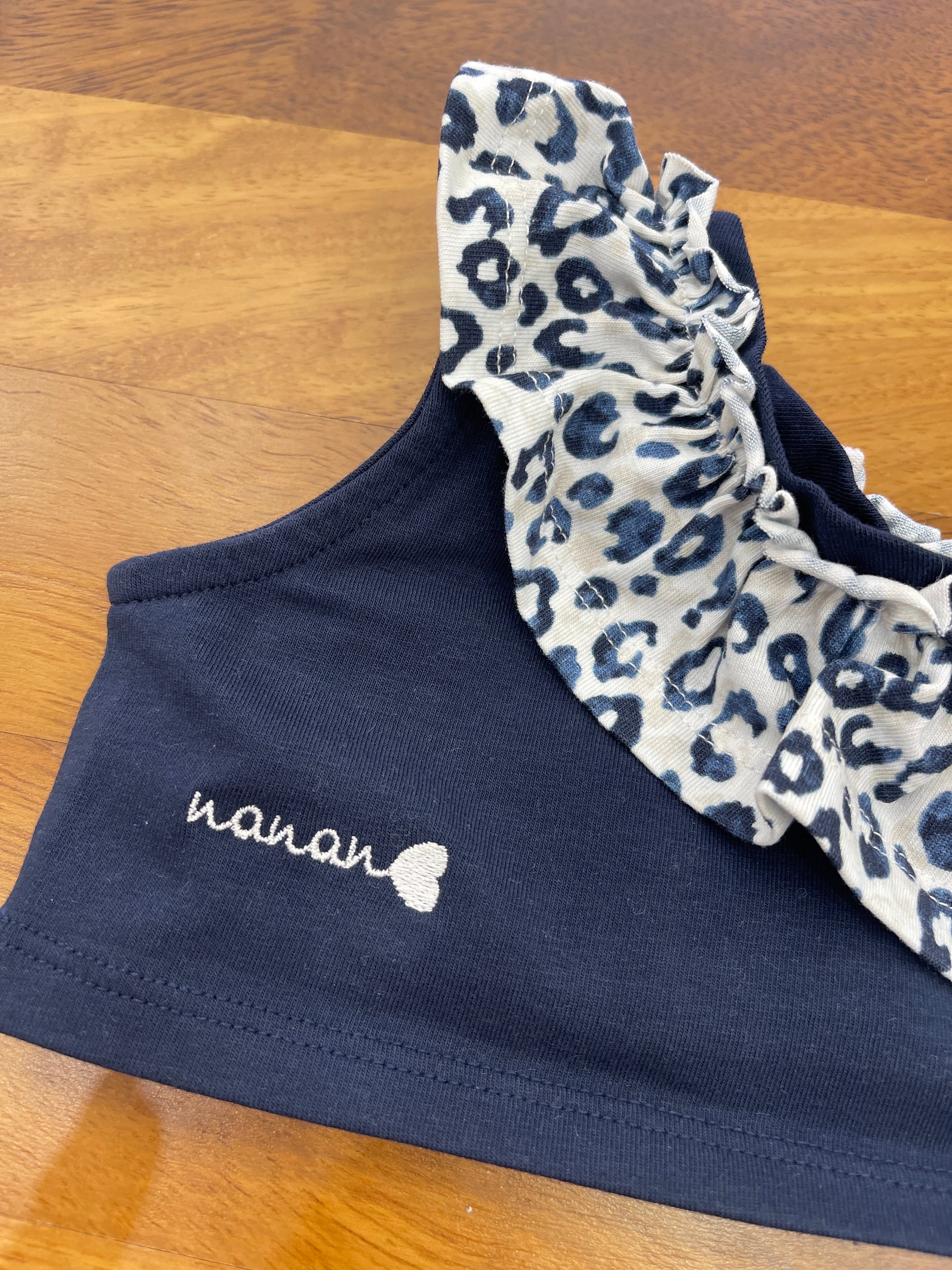 Questo Costume nanan, realizzato in cotone di alta qualità, è composto da un top monospalla con doppia balza maculata e una comoda mutandina liscia. Il design a due pezzi è perfetto per le giornate estive, mentre le balze maculate aggiungono un tocco di stile e originalità. Indossa questo costume e goditi il massimo comfort e un look unico!