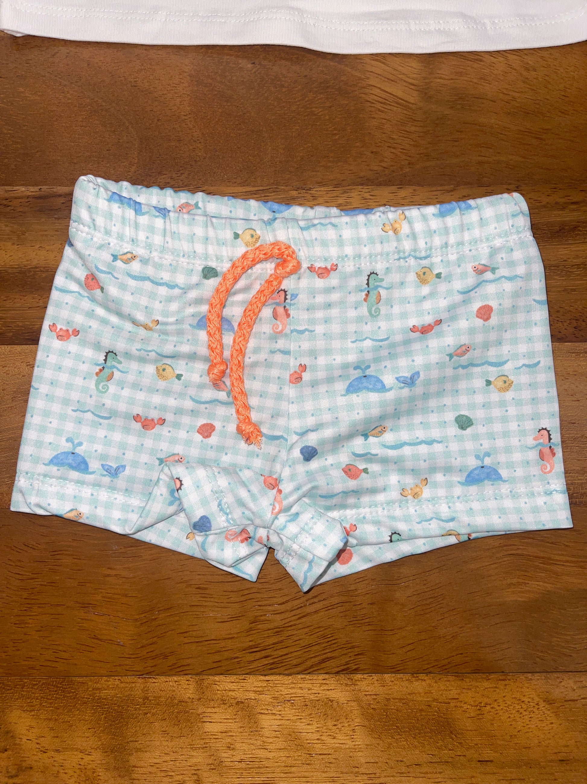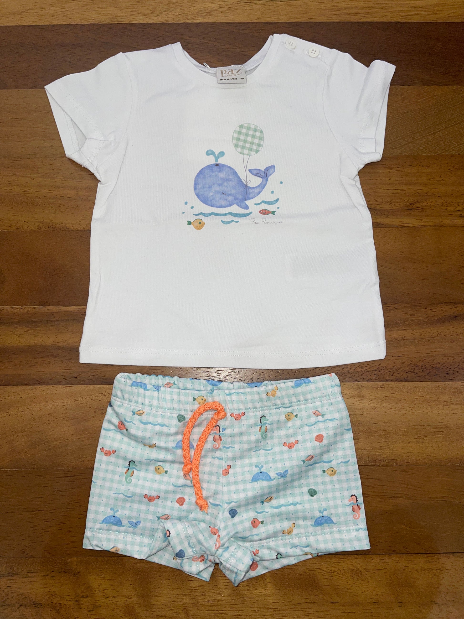Questo costume paz rodriguez presenta un design a due pezzi coordinato, con un pantaloncino a quadretti e una maglietta mezza manica in cotone. Decorato con graziosi disegni di pesciolini e balene, è perfetto per le giornate estive al mare. Comodo, resistente e adorabile, questo costume offre un'esperienza di balneazione unica.