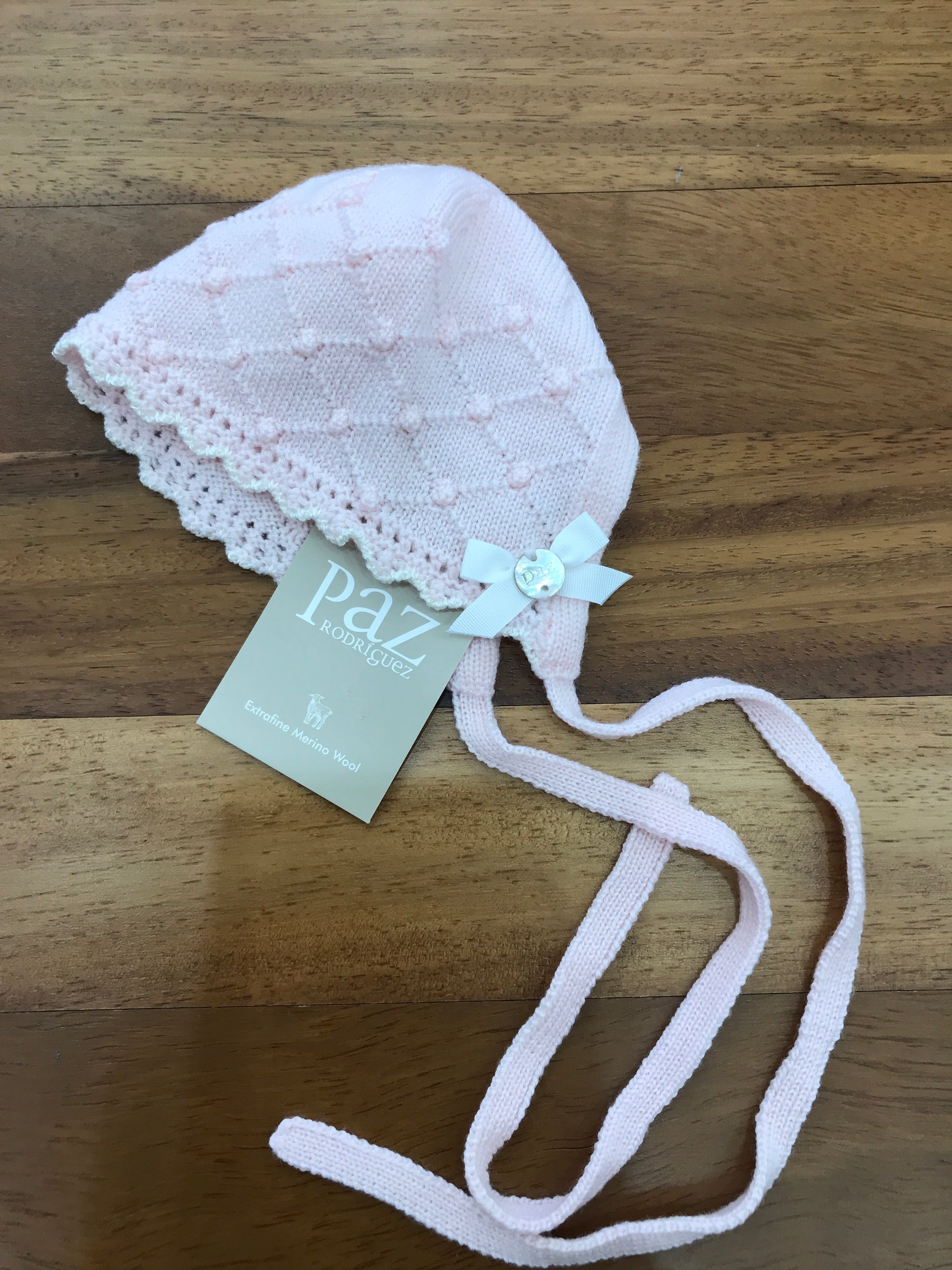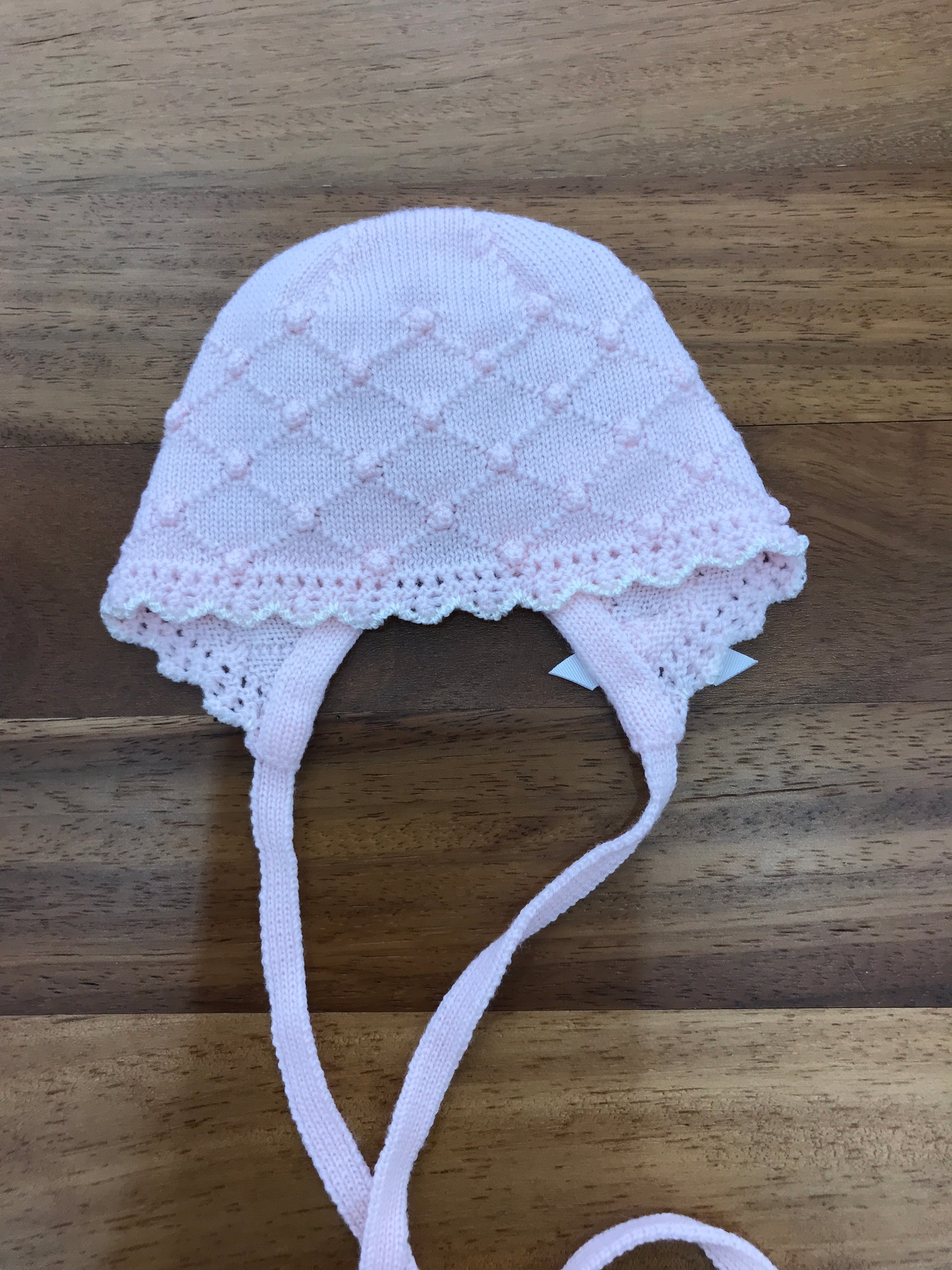 Questa cuffia in lana presenta una chiusura a fiocco e una lavorazione a maglia che crea un motivo a rombi, unendo stile e comfort con un tocco artigianale raffinato.