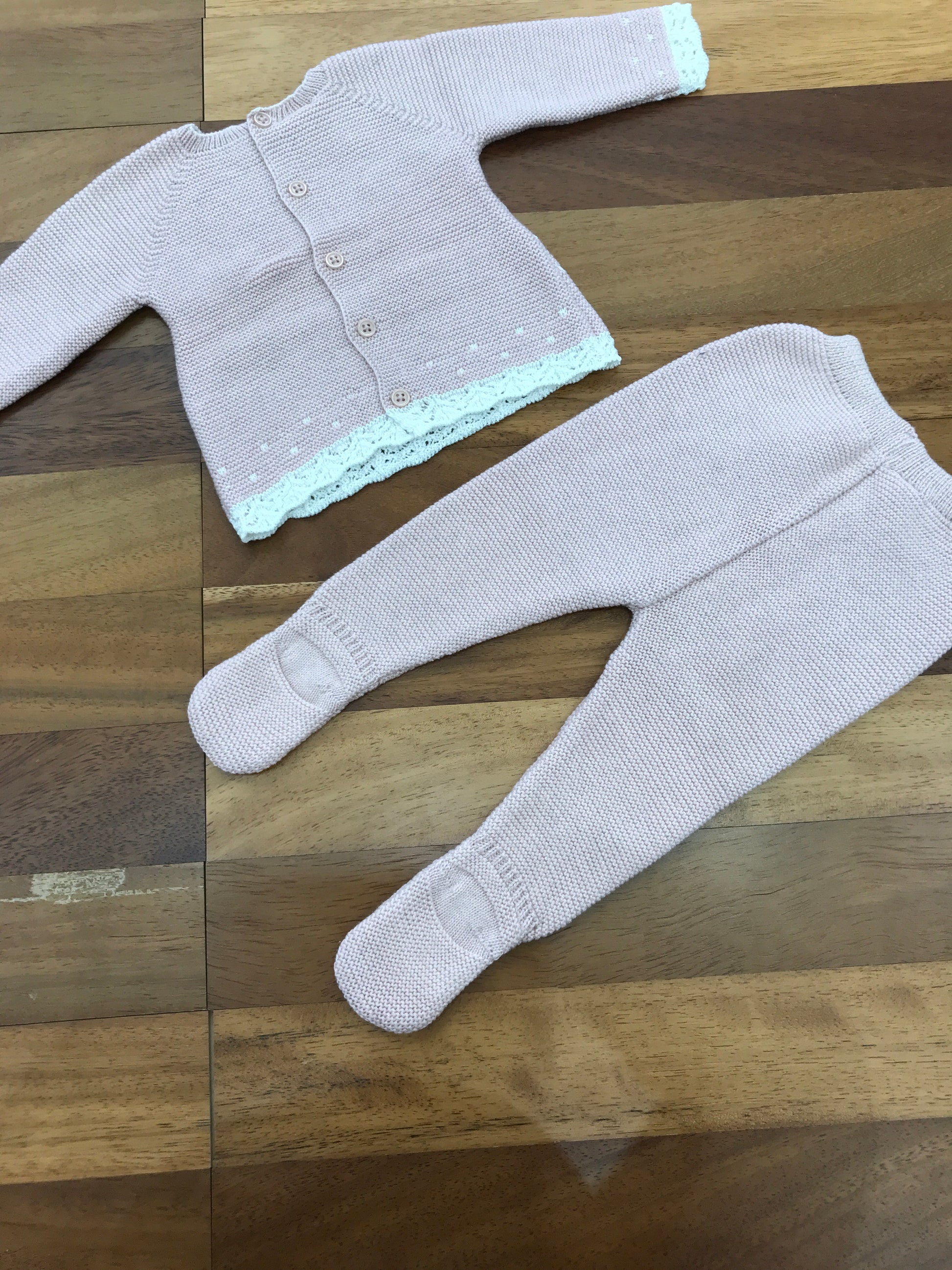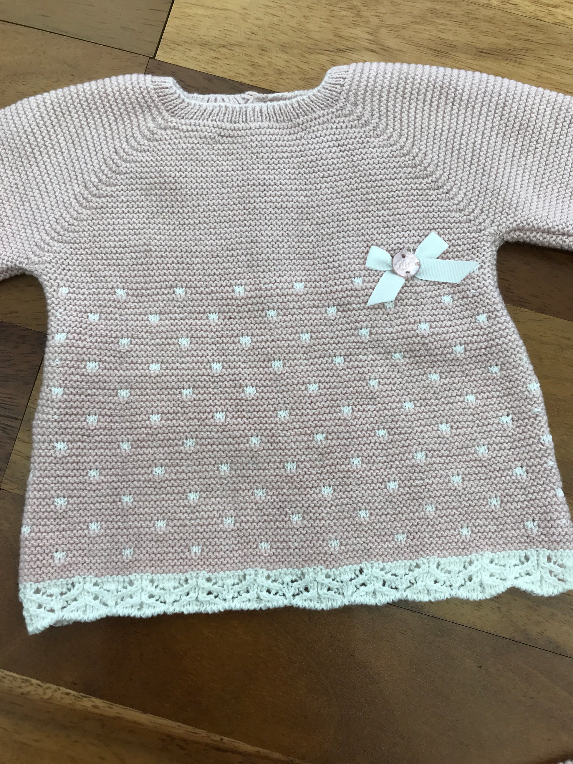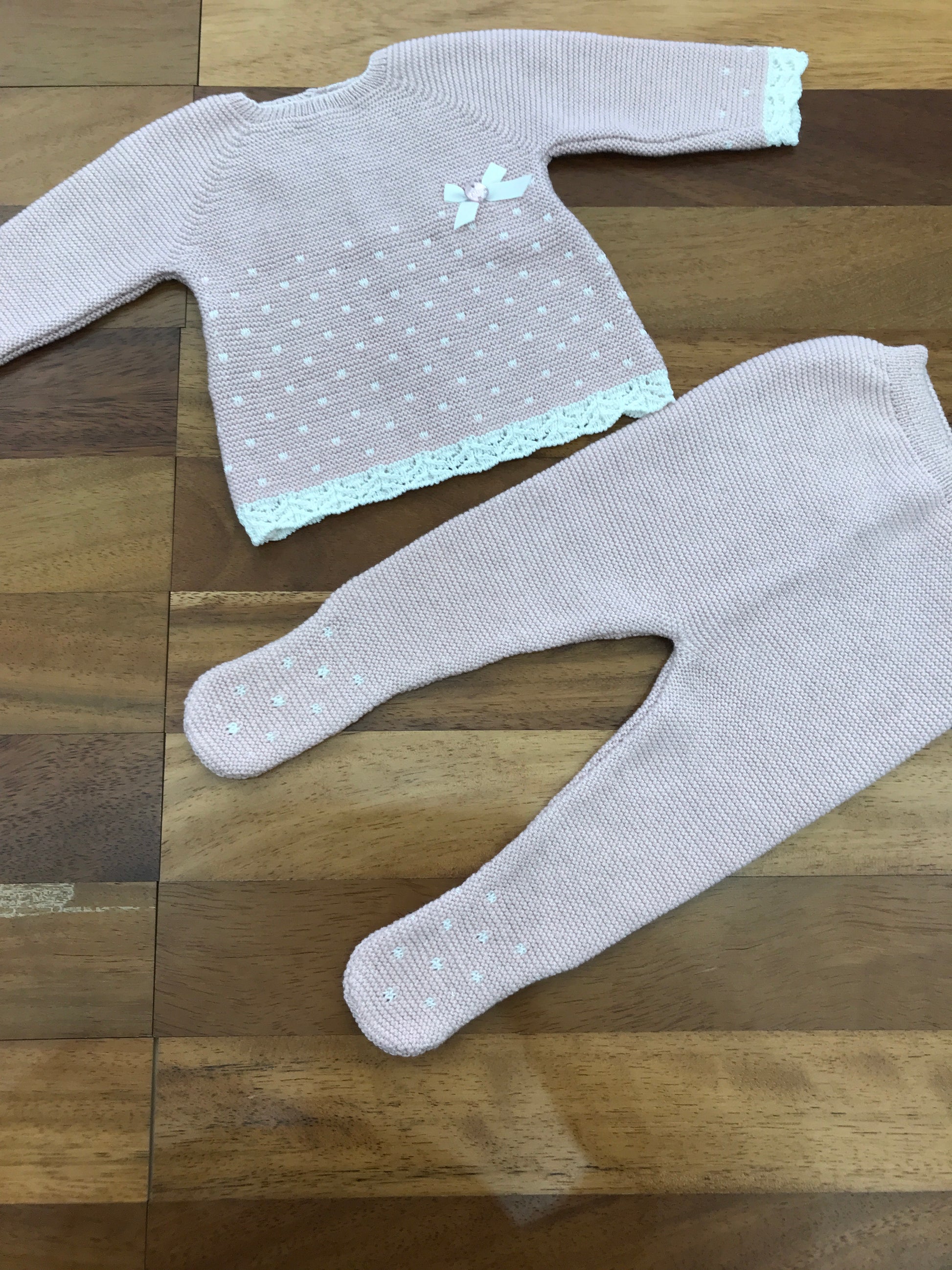 Completo in lana composto da due pezzi, caratterizzato da dettagli raffinati. I piedini sono impreziositi da pois ricamati, mentre la parte superiore presenta pois bianchi ricamati su un design senza colletto, che conferisce un aspetto elegante e moderno. La maglietta e le maniche sono rifinite con una delicata lavorazione in pizzo ricamato lungo il bordo, aggiungendo un tocco di raffinatezza e cura artigianale al capo. Questo completo unisce comfort e stile, ideale per chi cerca qualità e attenzione ai dettagli nei capi in lana.