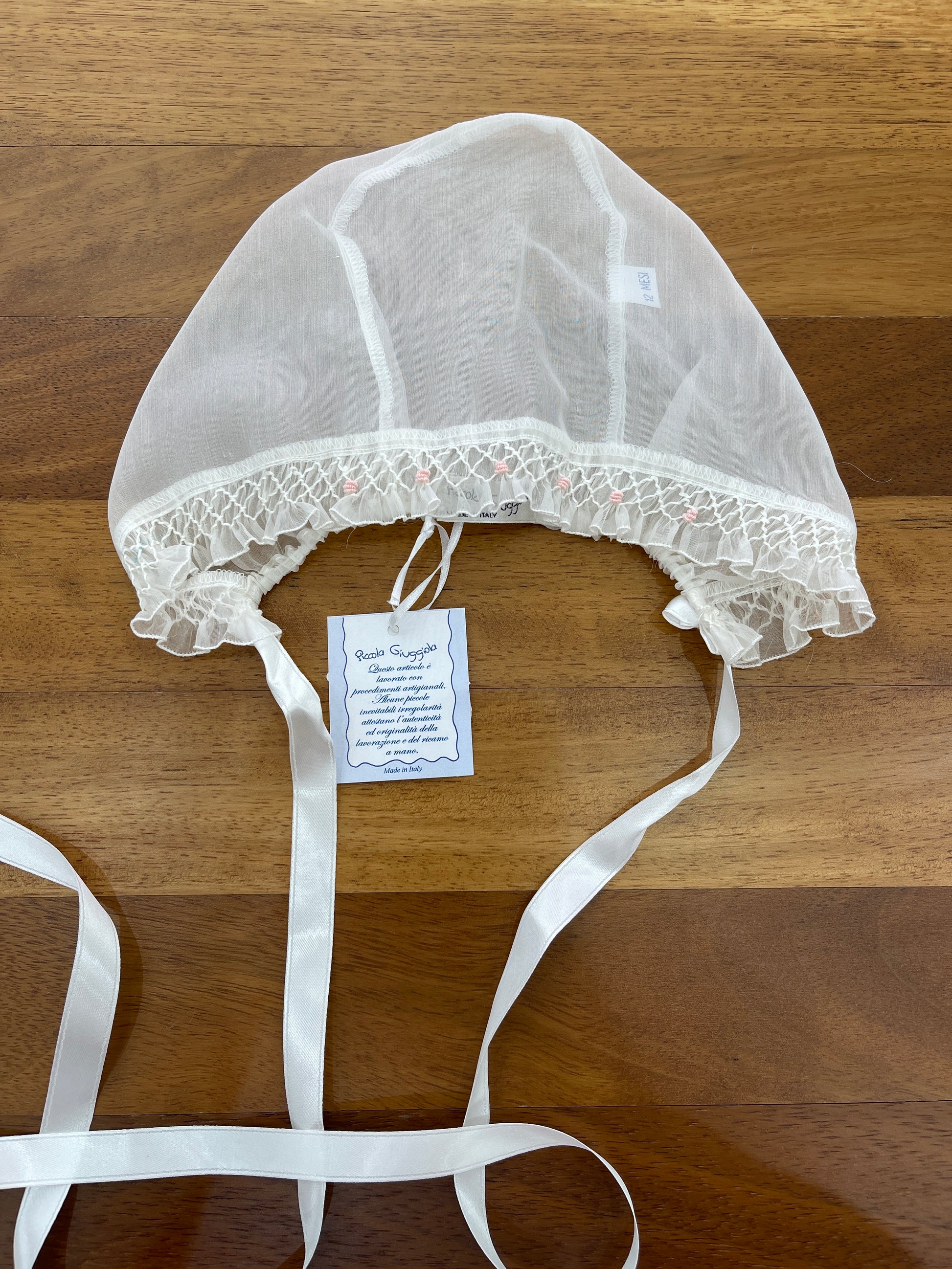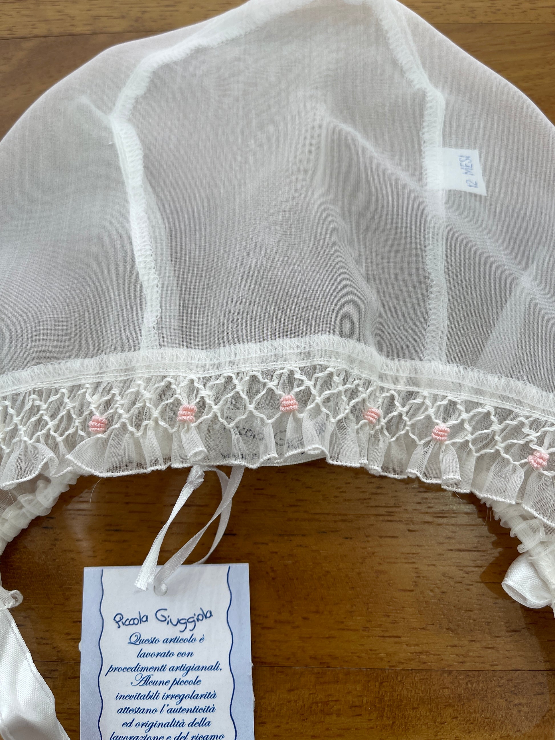 Cuffia realizzata in organza con punto smock a mano e rifinita con un delicato ricamo a forma di rosa.