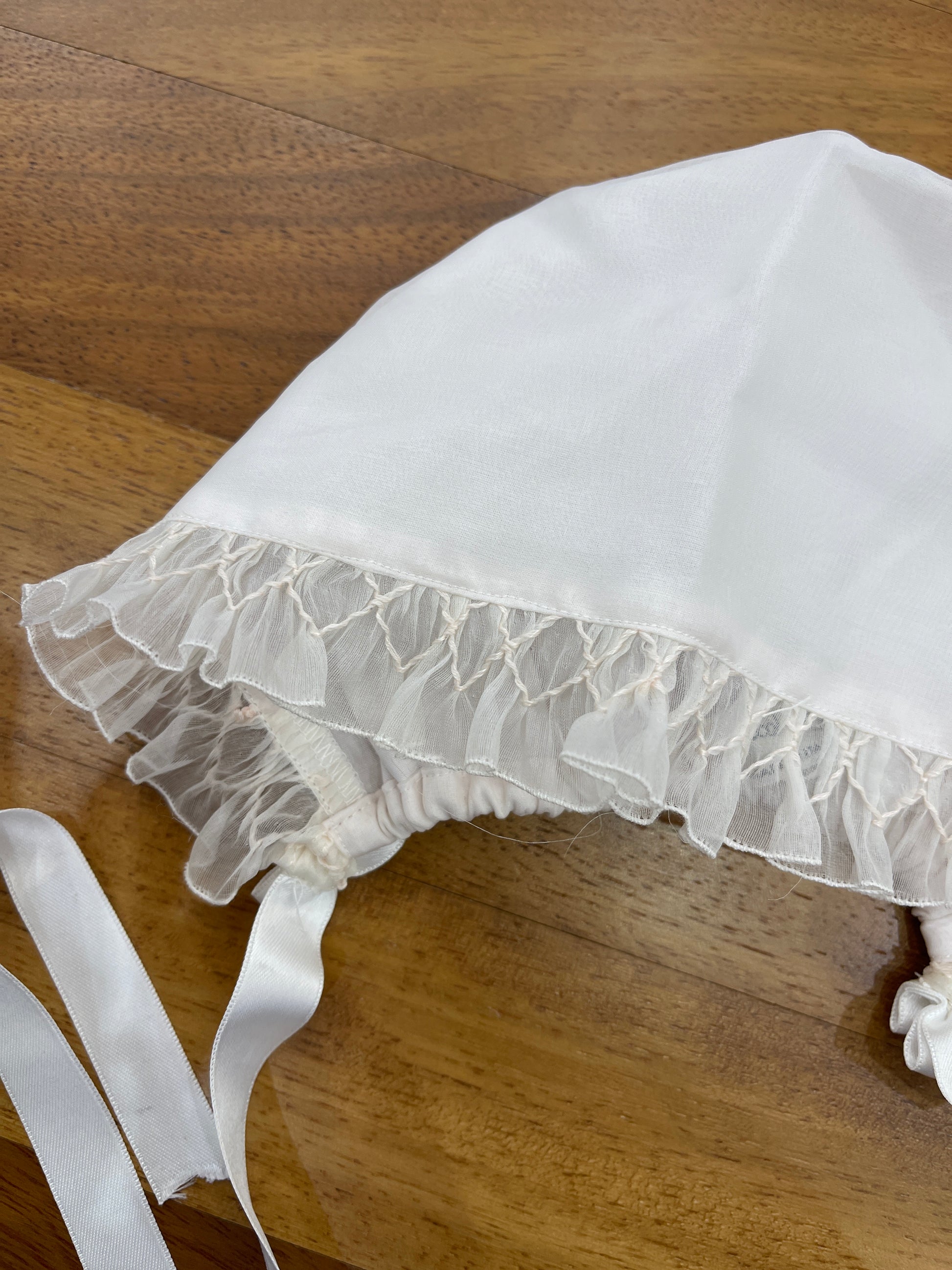 Cuffia realizzata in seta organza, caratterizzata da una raffinata lavorazione a punto smock.