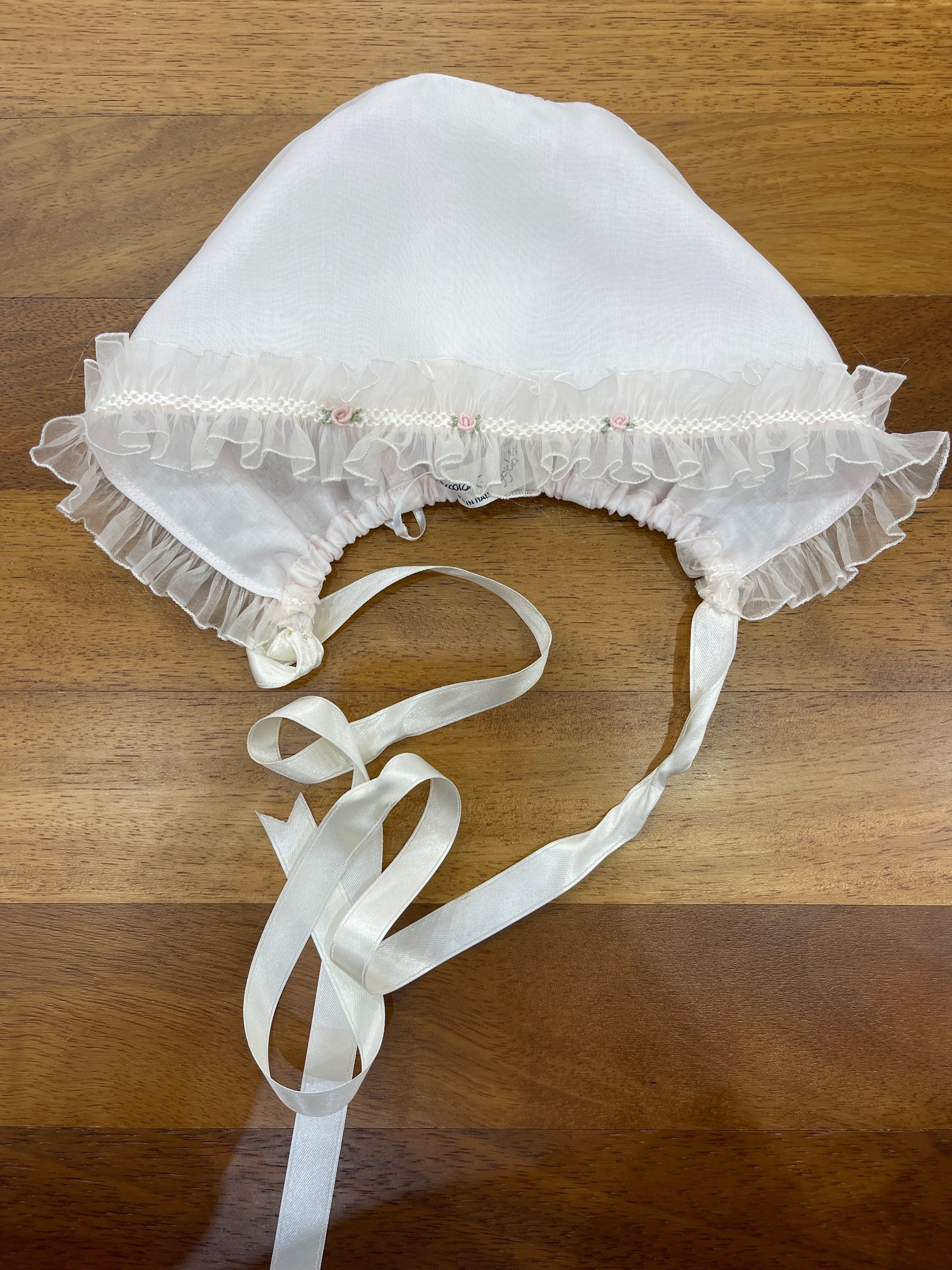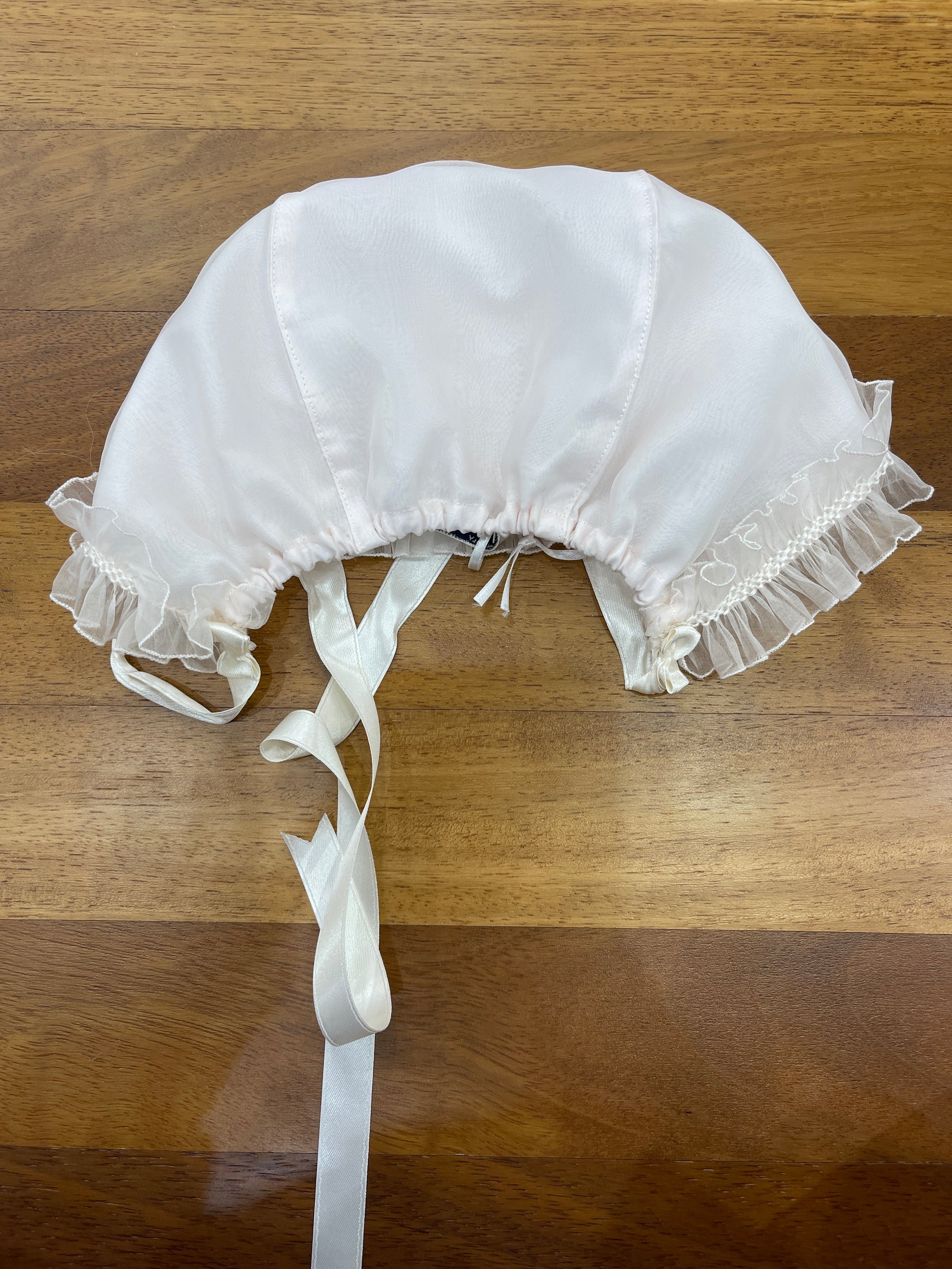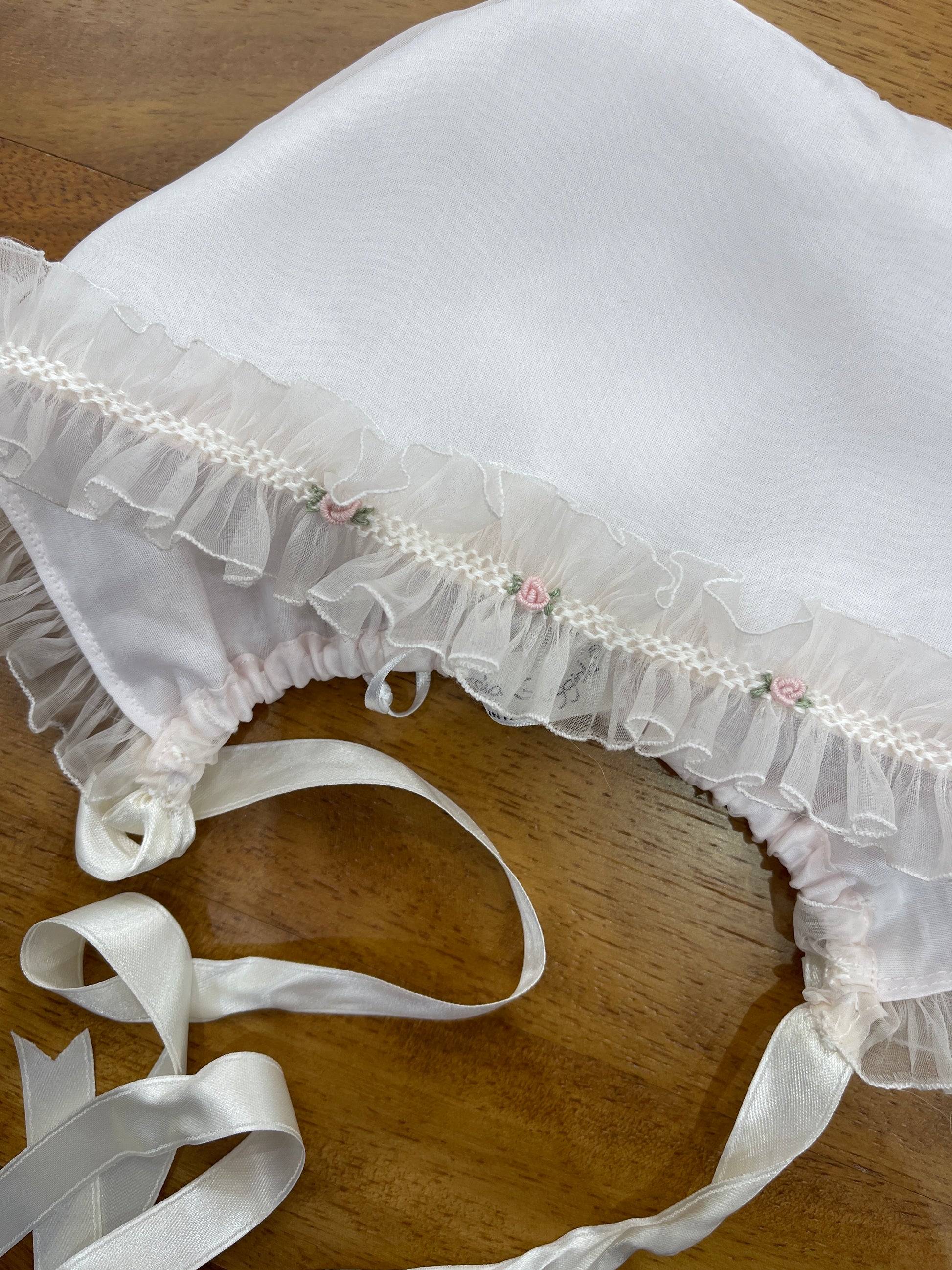 Cuffia realizzata in organza di seta, arricchita da un arricciatura applicata sul davanti e decorata con rosette ricamate a mano.
