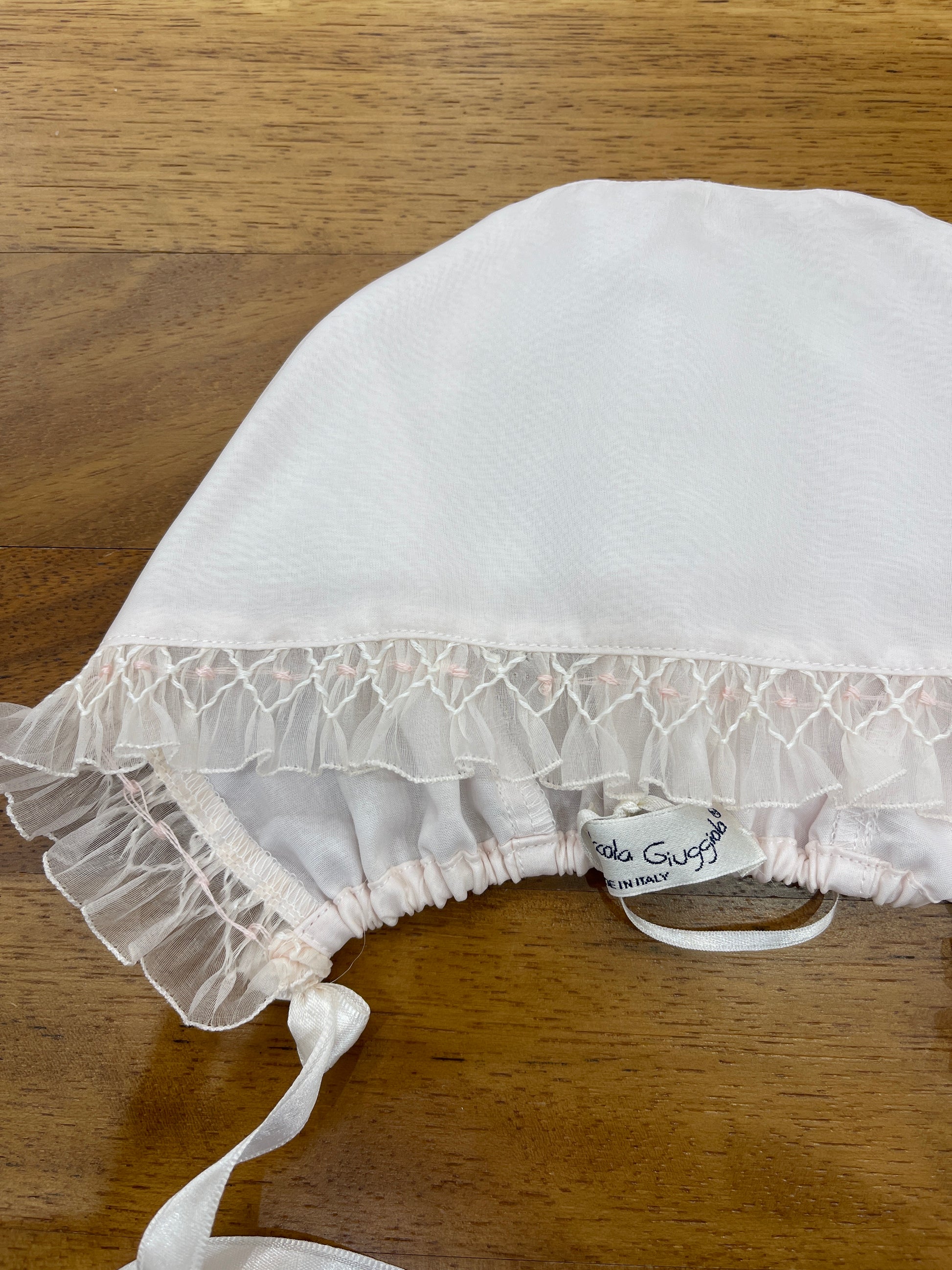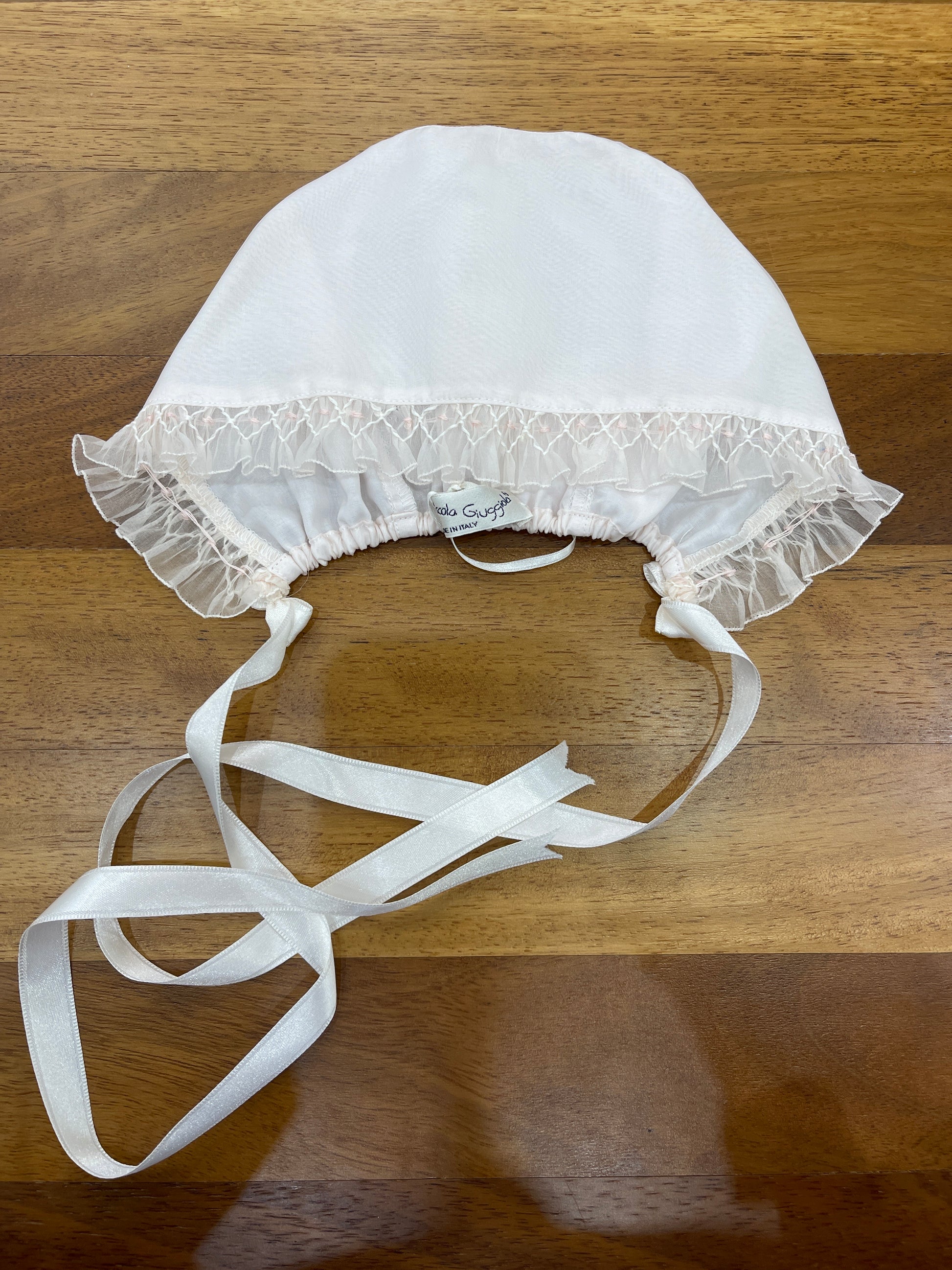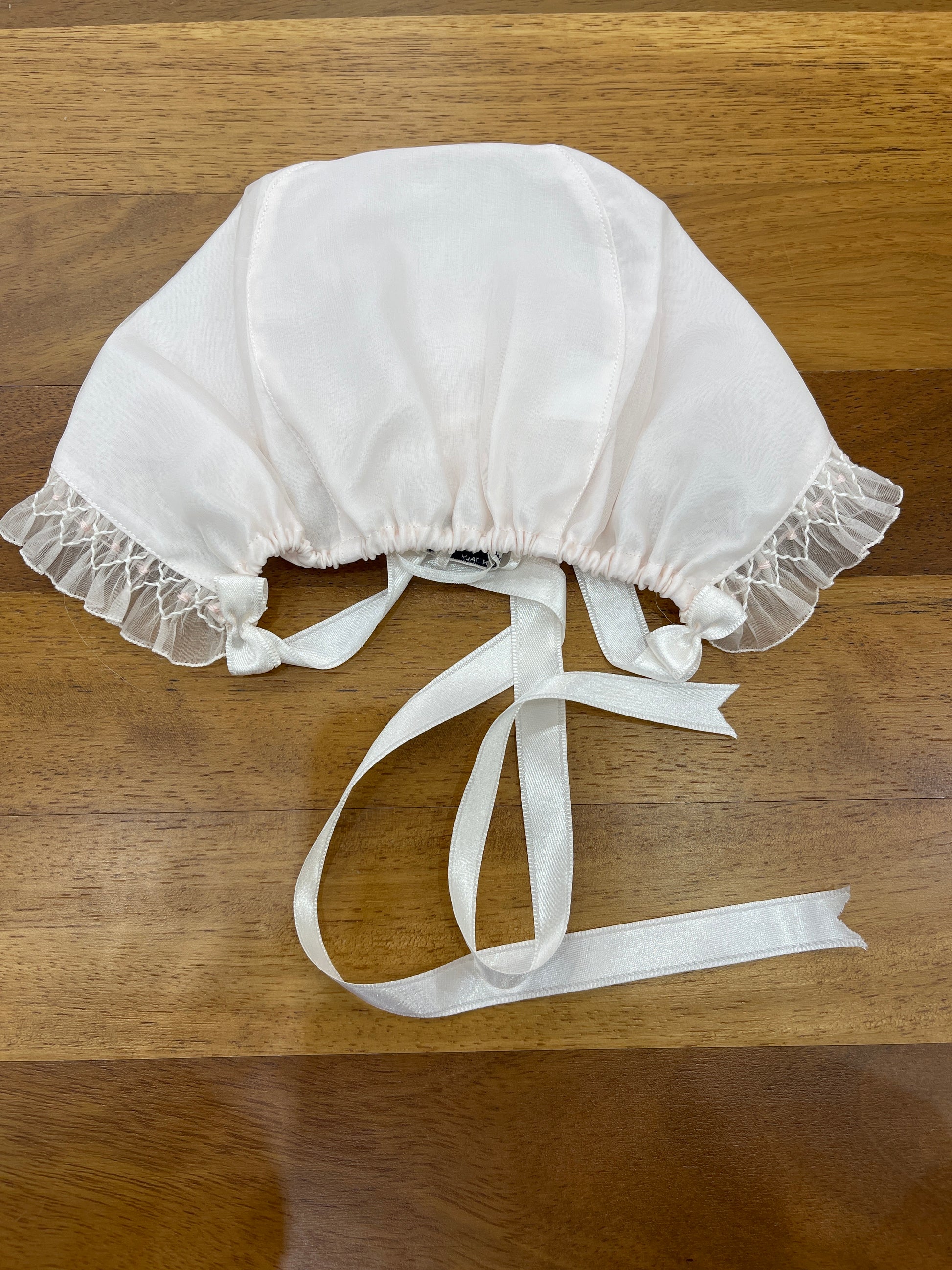 Cuffia realizzata in seta organza, caratterizzata da una raffinata lavorazione a punto smock sulla parte anteriore.