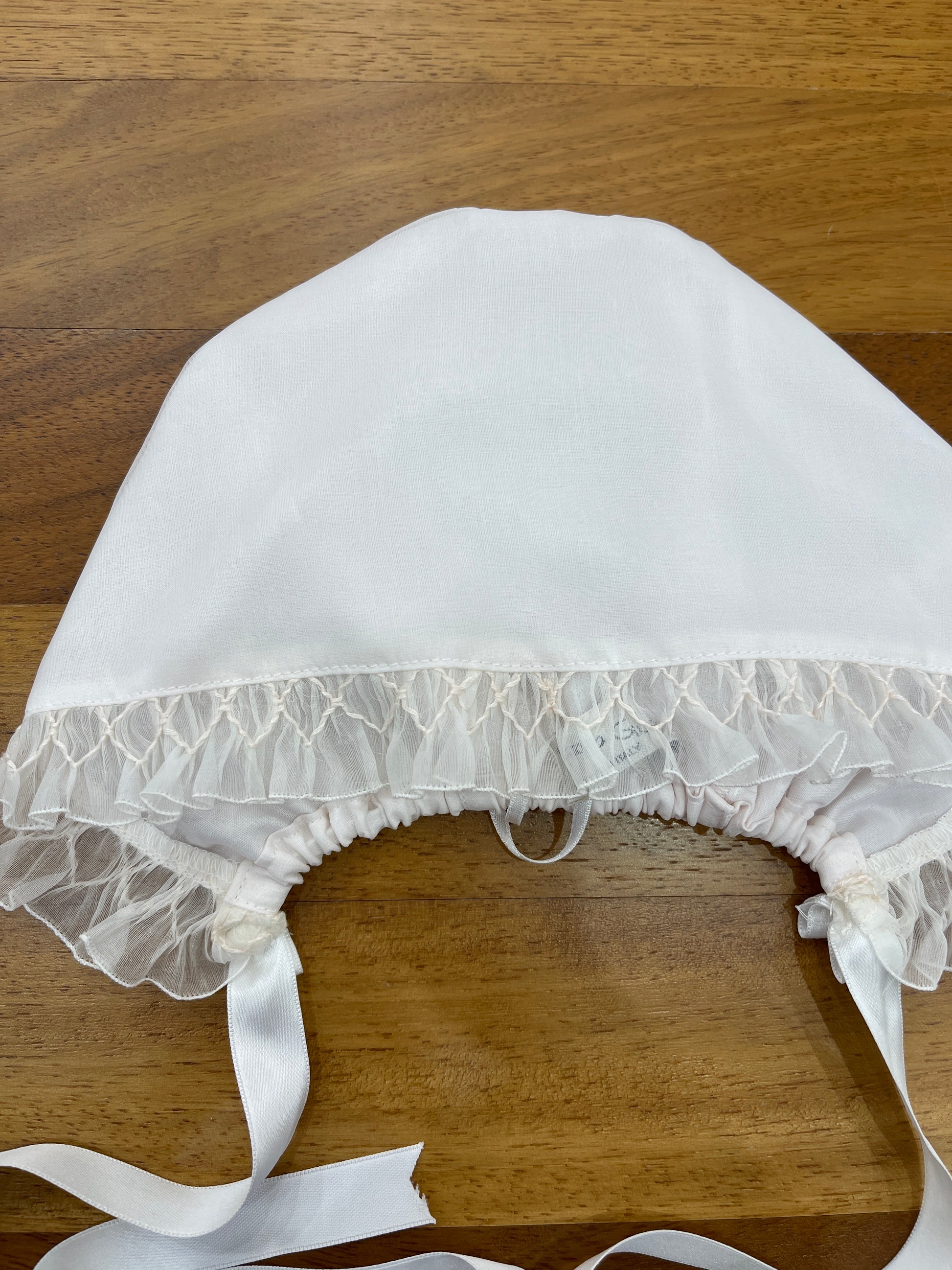 Cuffia realizzata in organza di seta, caratterizzata da una raffinata lavorazione a punto smock sulla parte frontale.