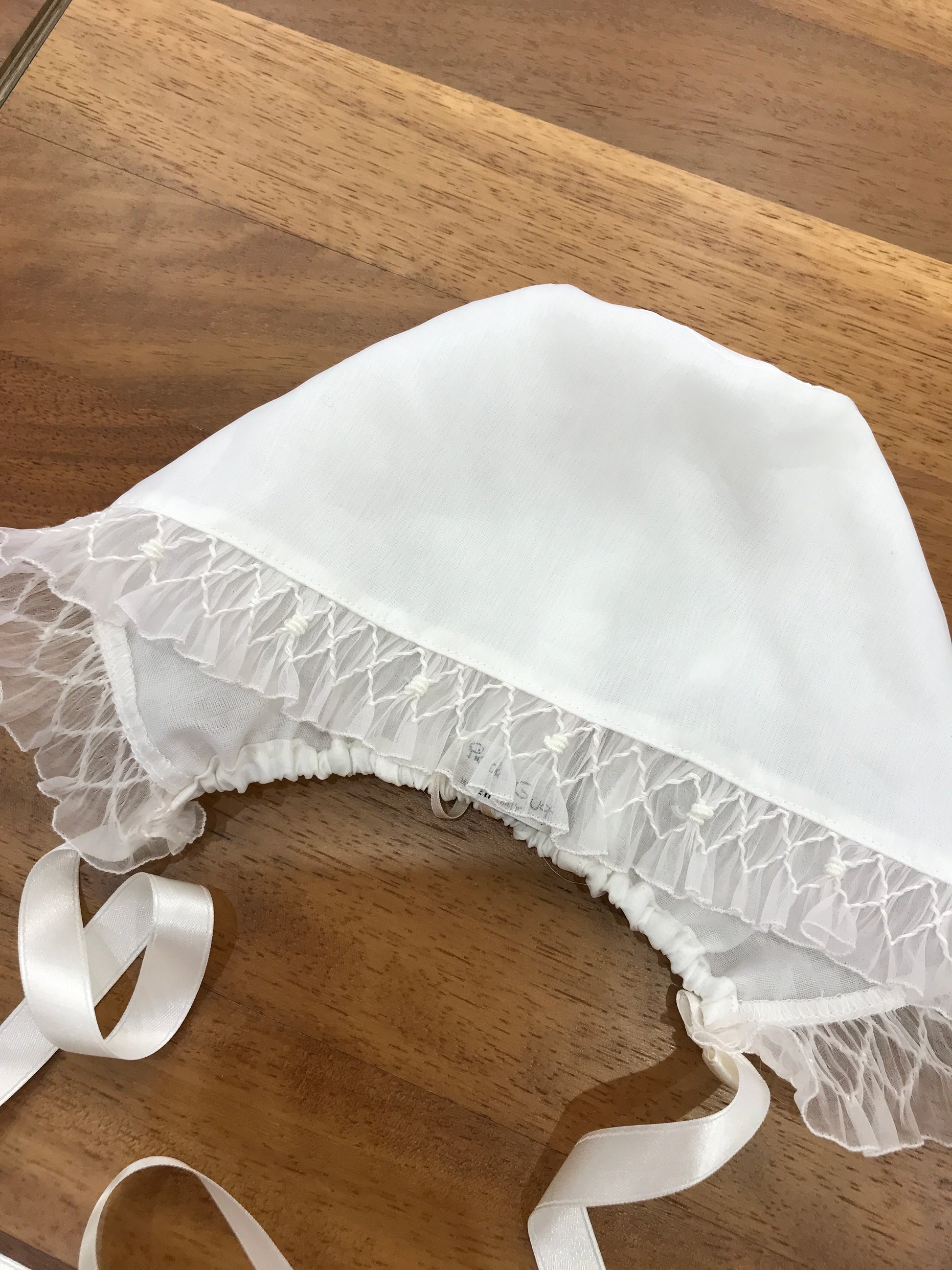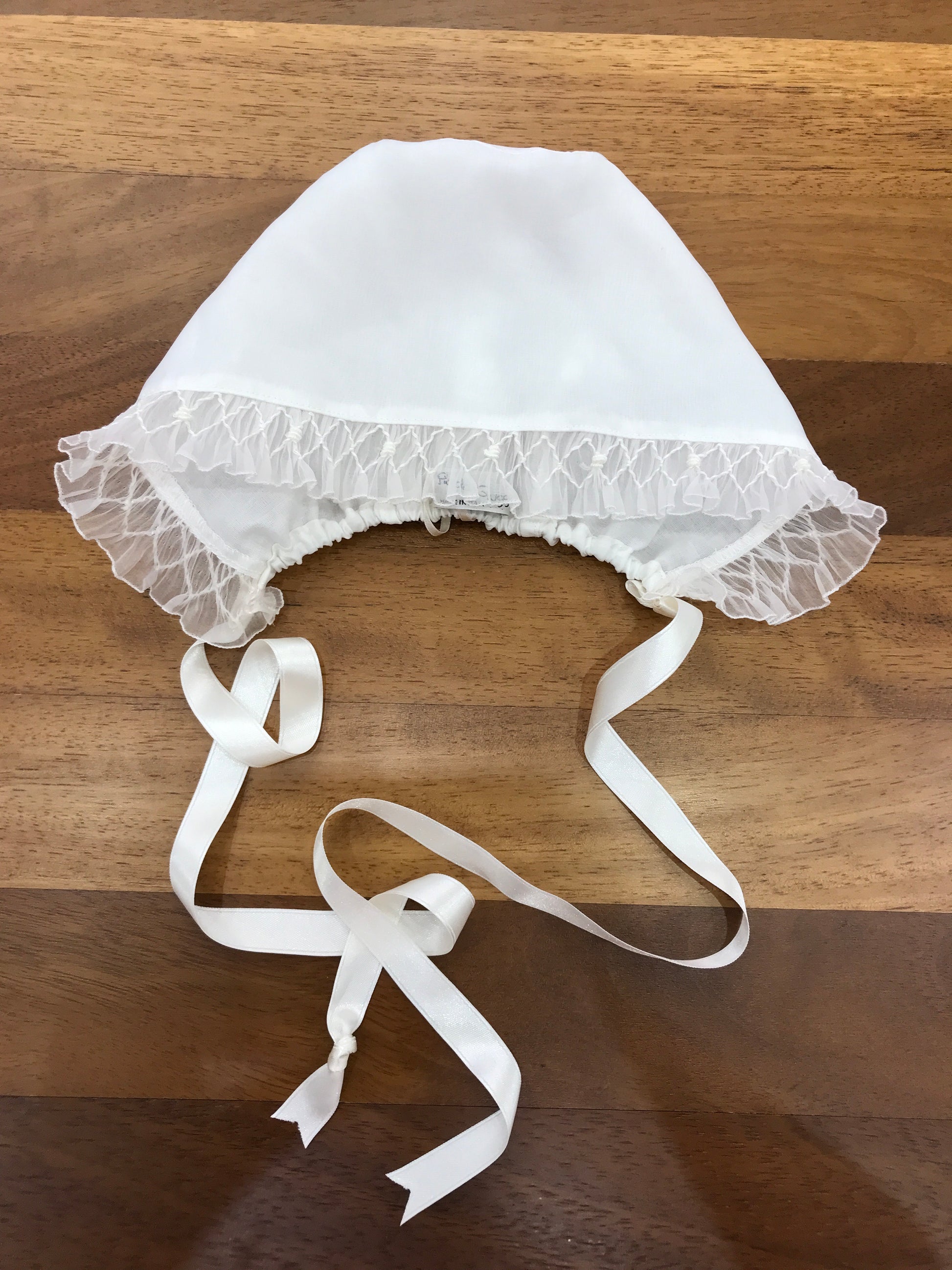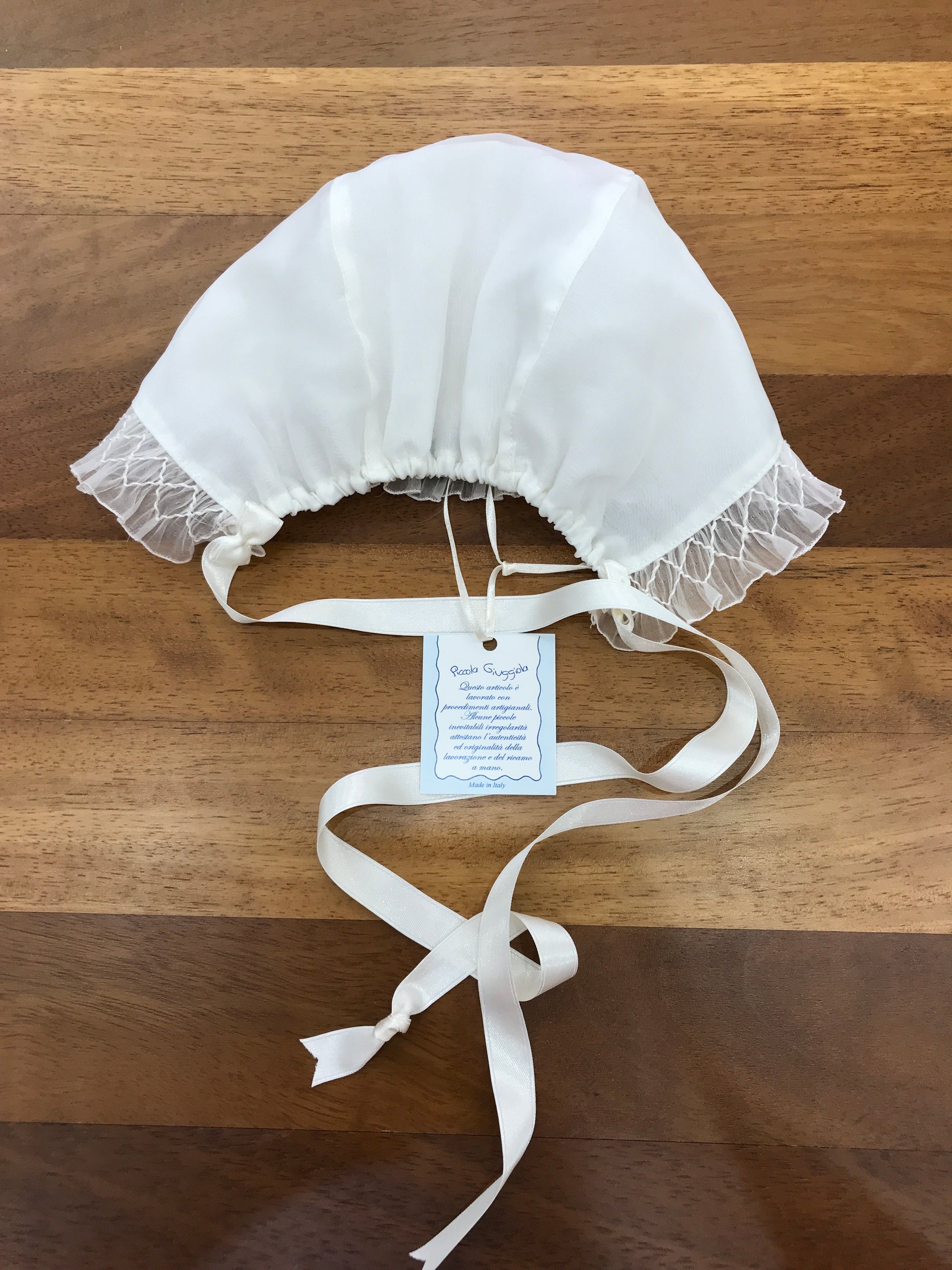 Cuffia realizzata in organza di seta color avorio, con una fascia frontale in organza di seta, interamente decorata con punto smock.