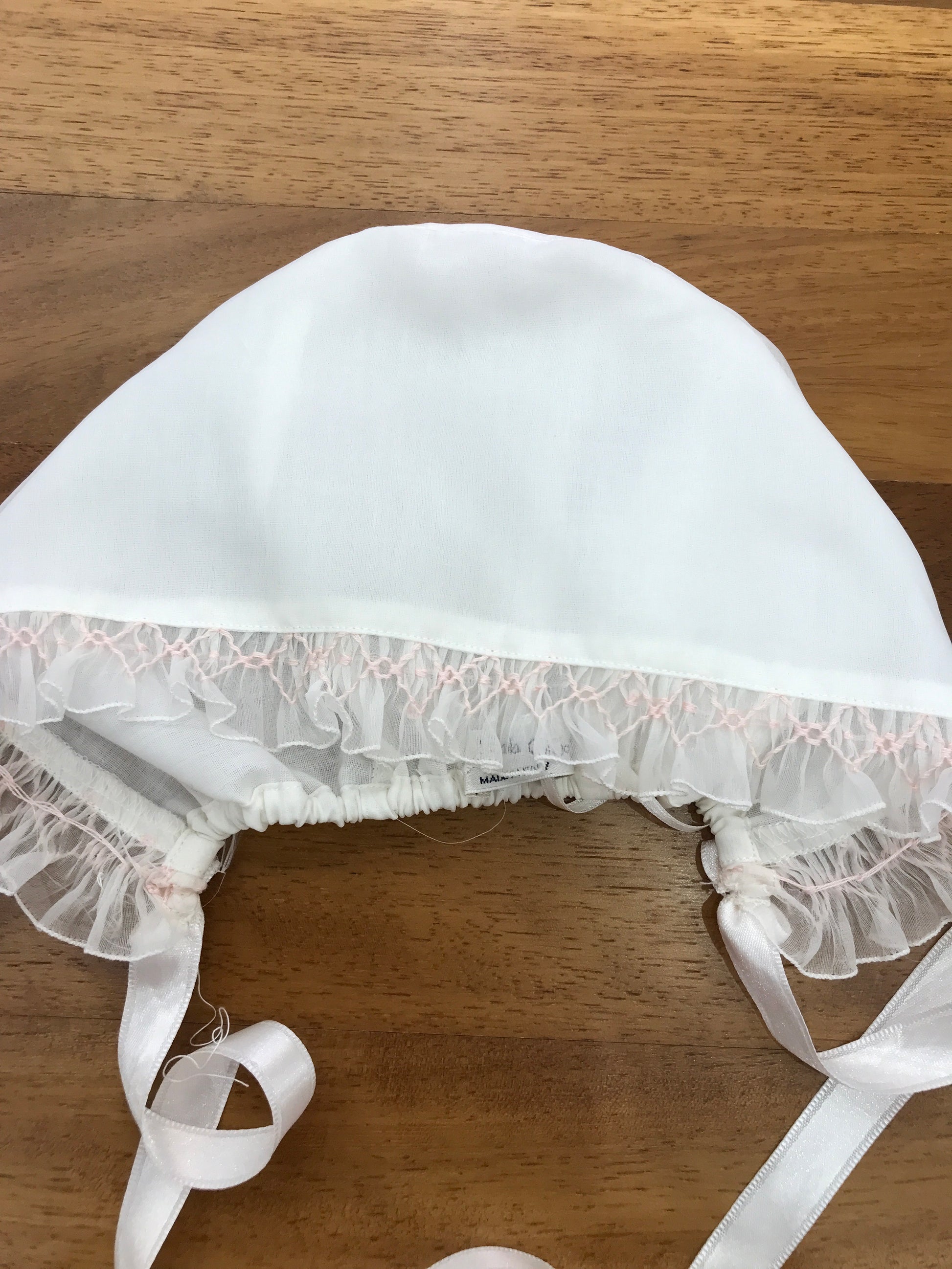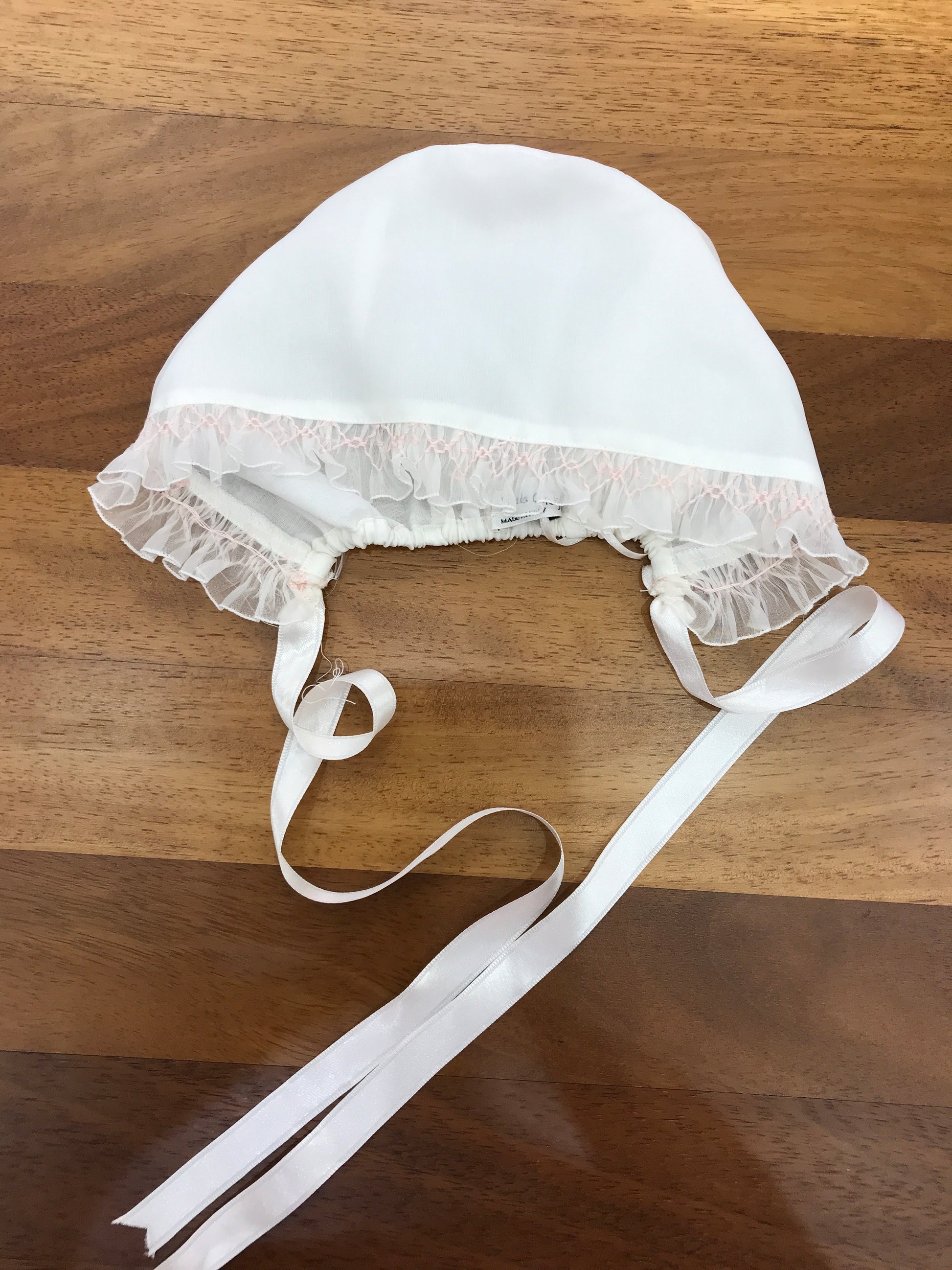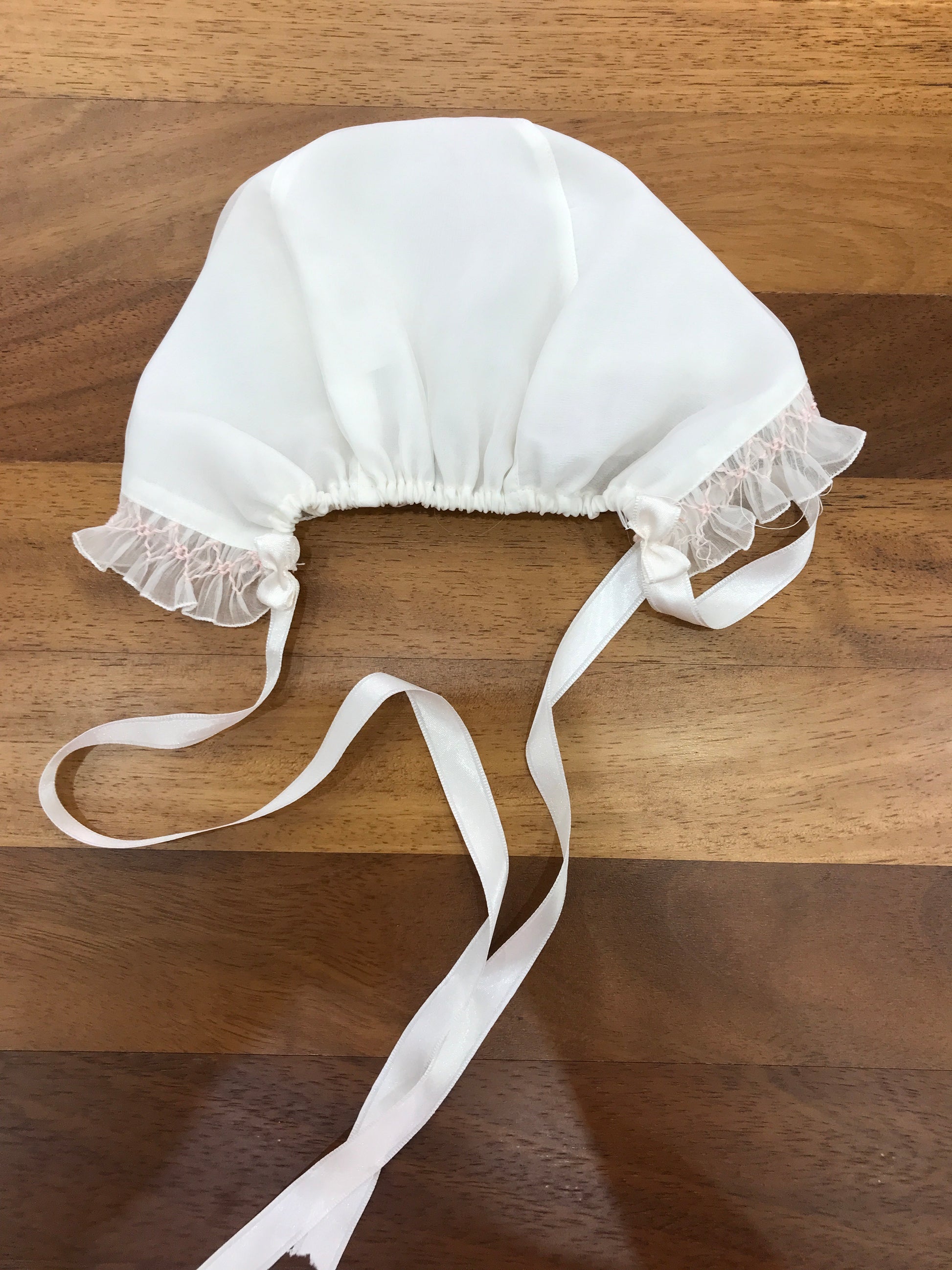 Cuffia realizzata in organza di seta color avorio, con una fascia frontale in organza di seta, interamente decorata con punto smock.