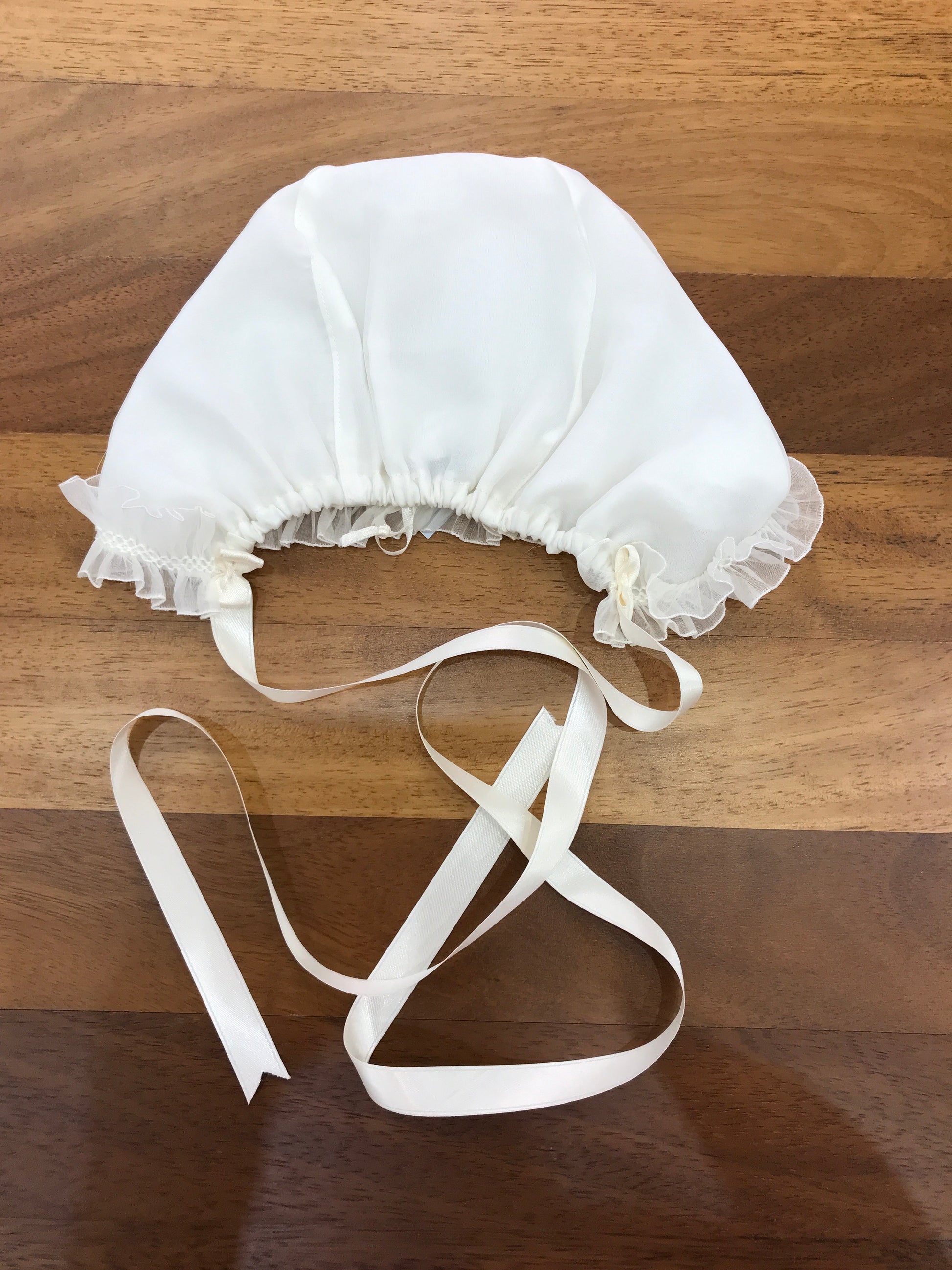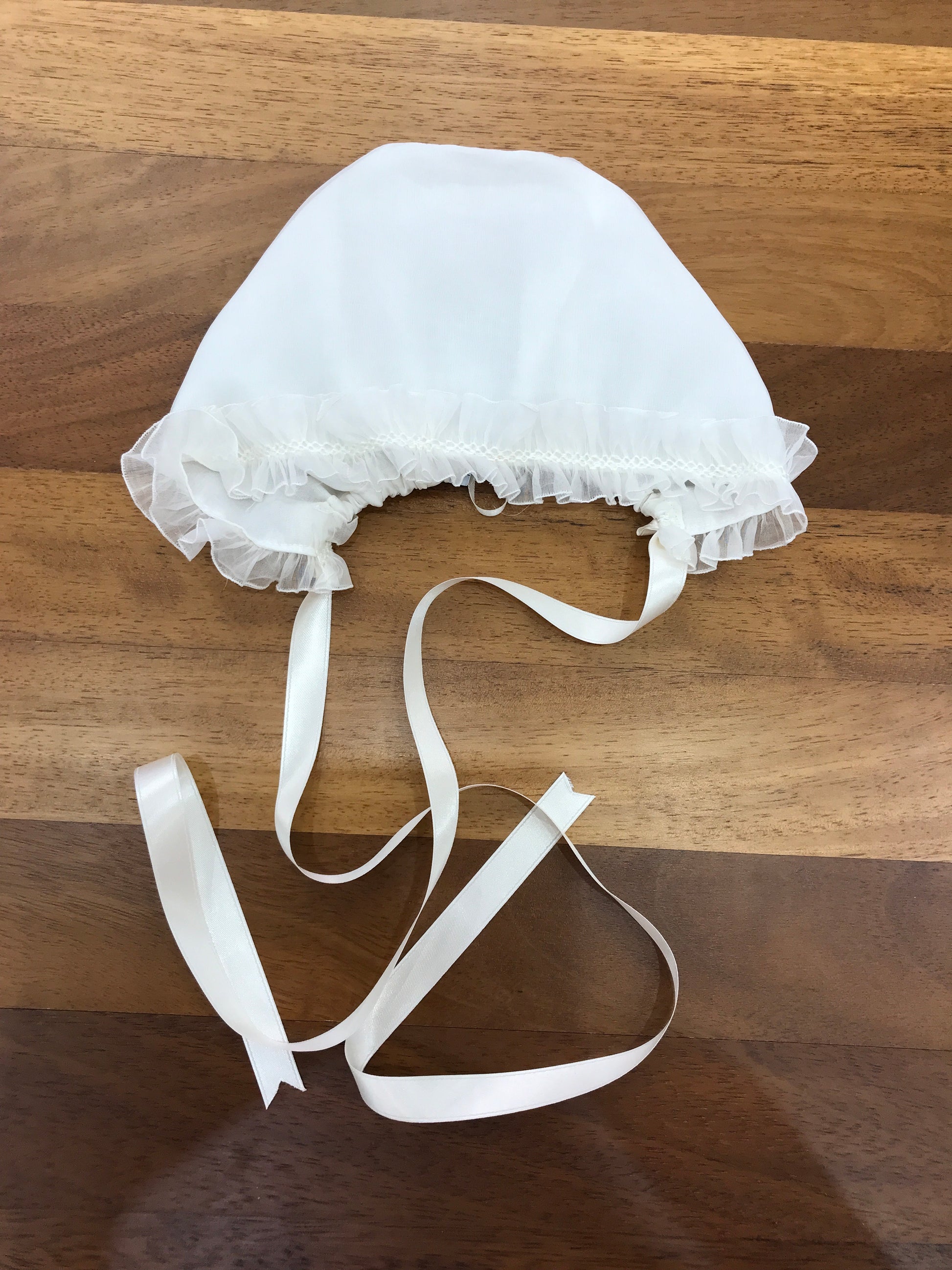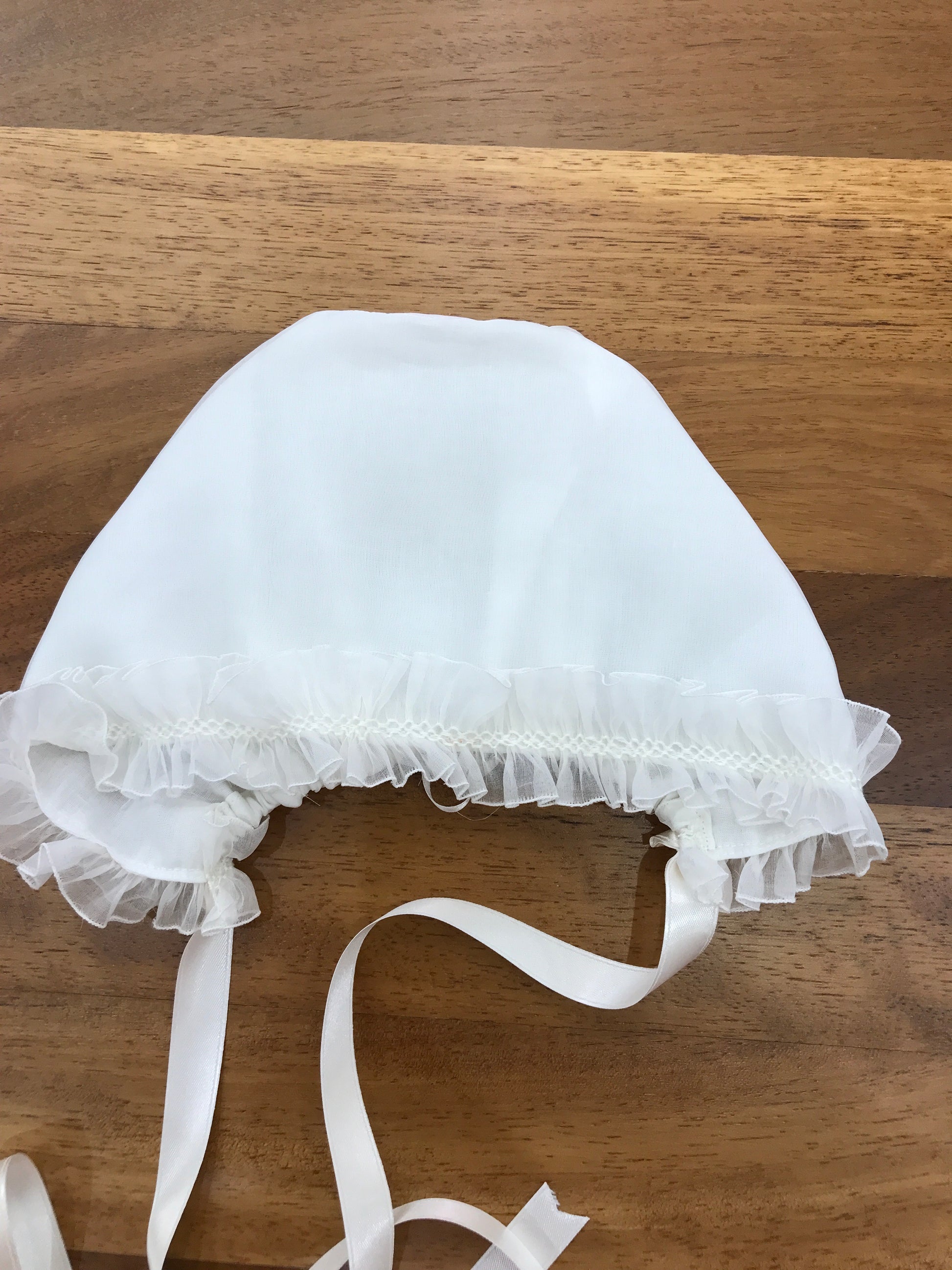 Cuffia realizzata in organza di seta color avorio, con una fascia frontale in organza di seta, interamente decorata con punto smock.