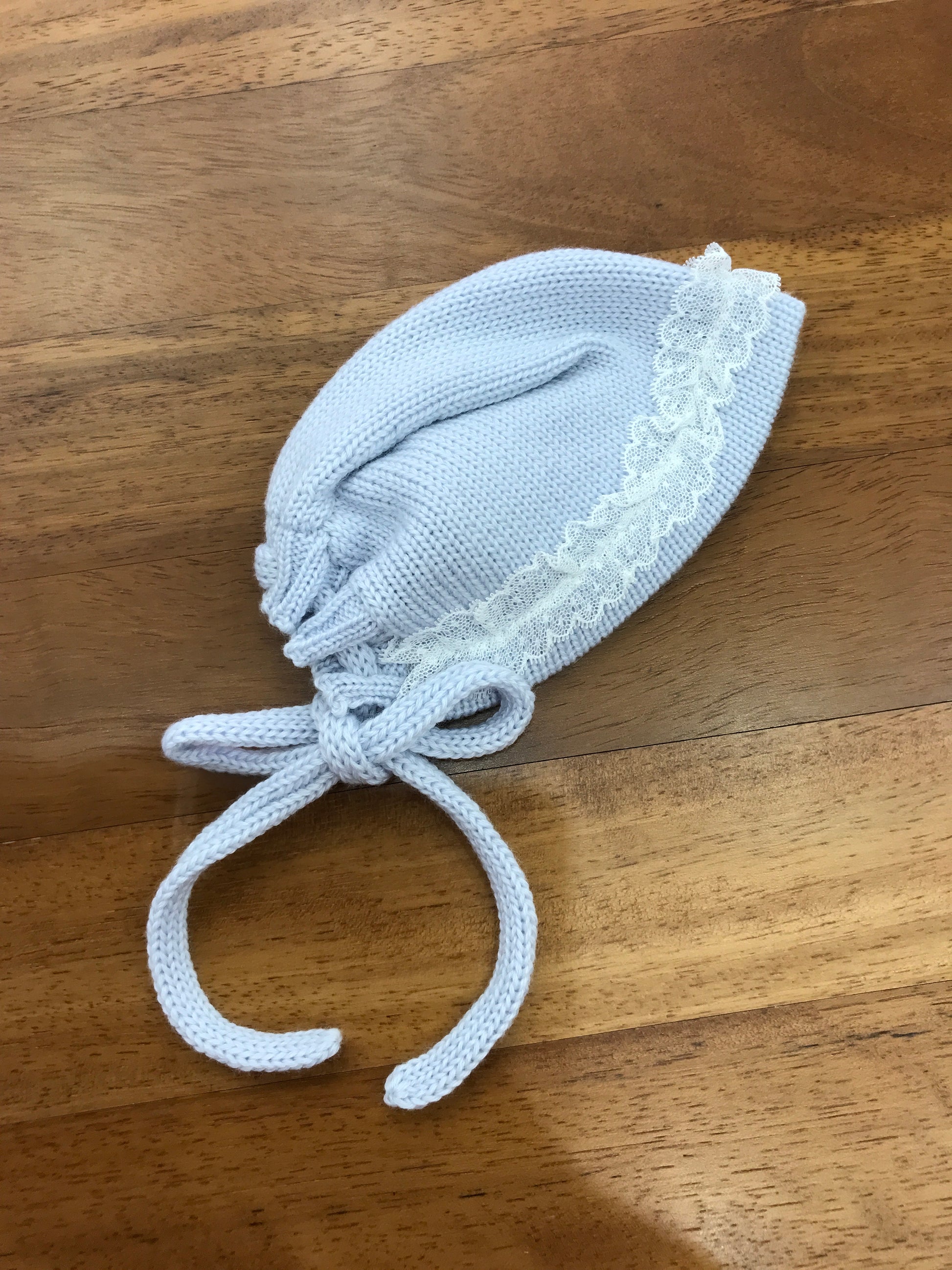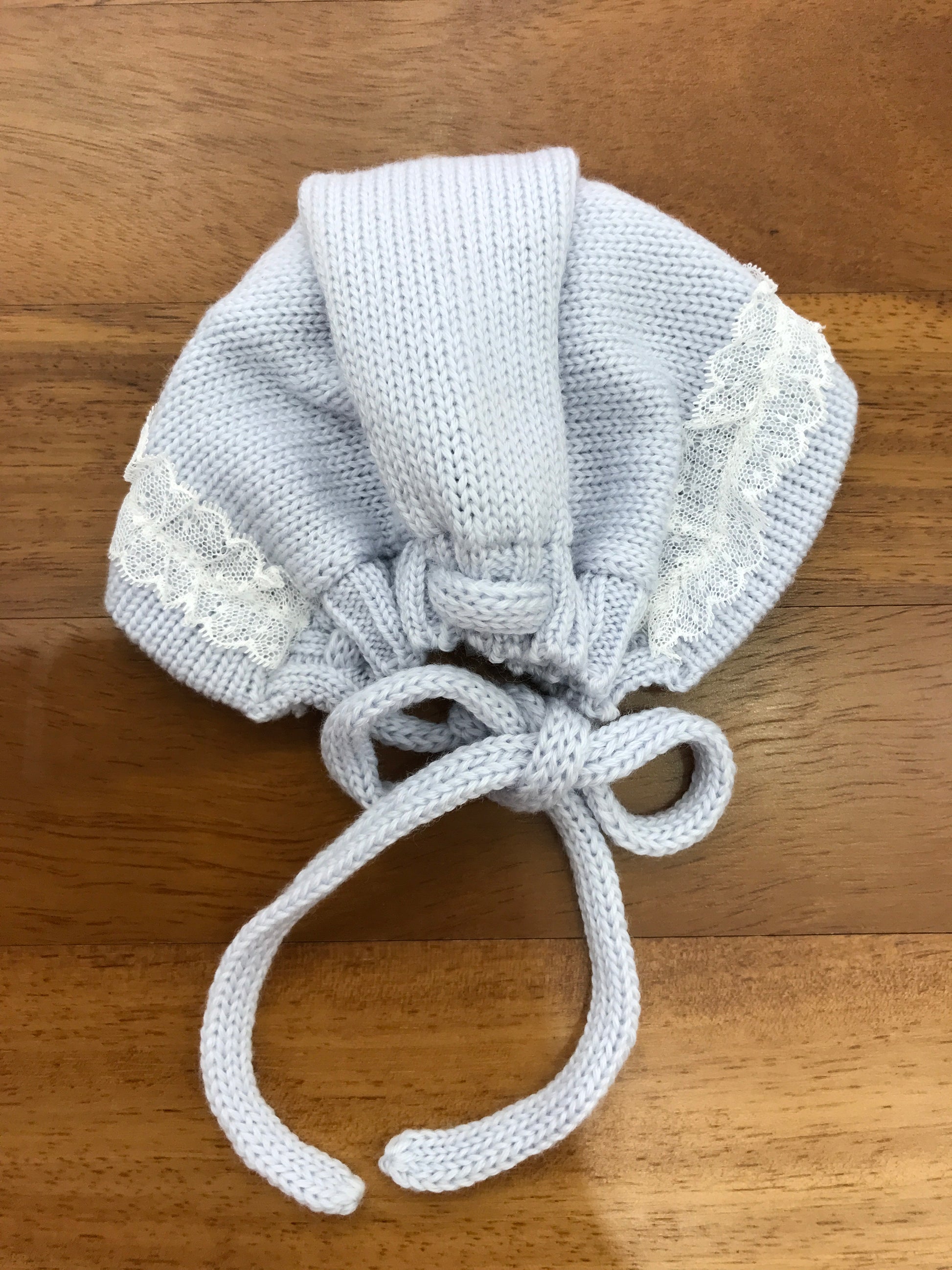 Cuffietta realizzata in lana, decorata con un delicato merletto ricamato lungo il bordo e dotata di passanastro per la chiusura a fiocco.