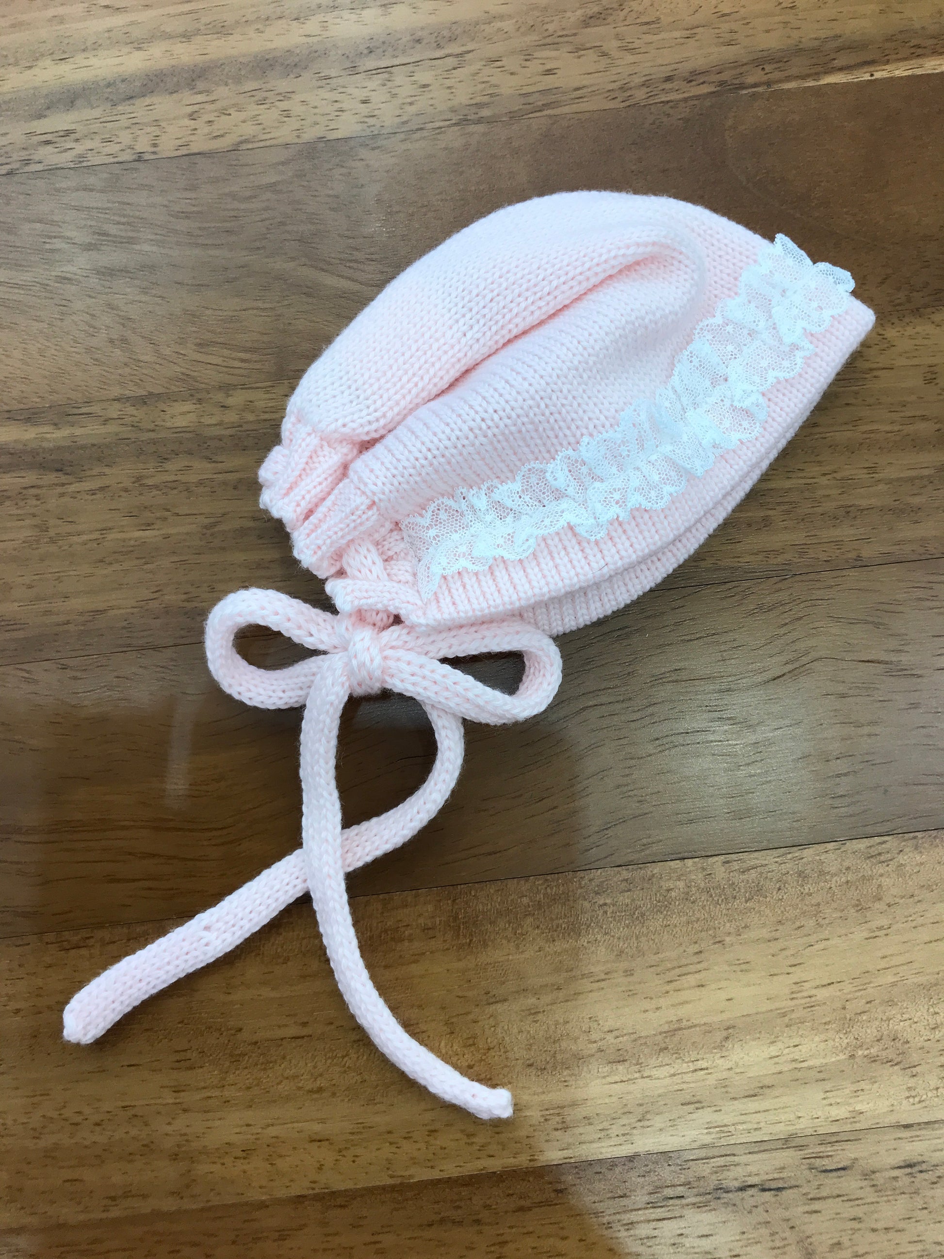 Cuffietta realizzata in lana, decorata con un delicato merletto ricamato lungo il bordo e dotata di passanastro per la chiusura a fiocco.