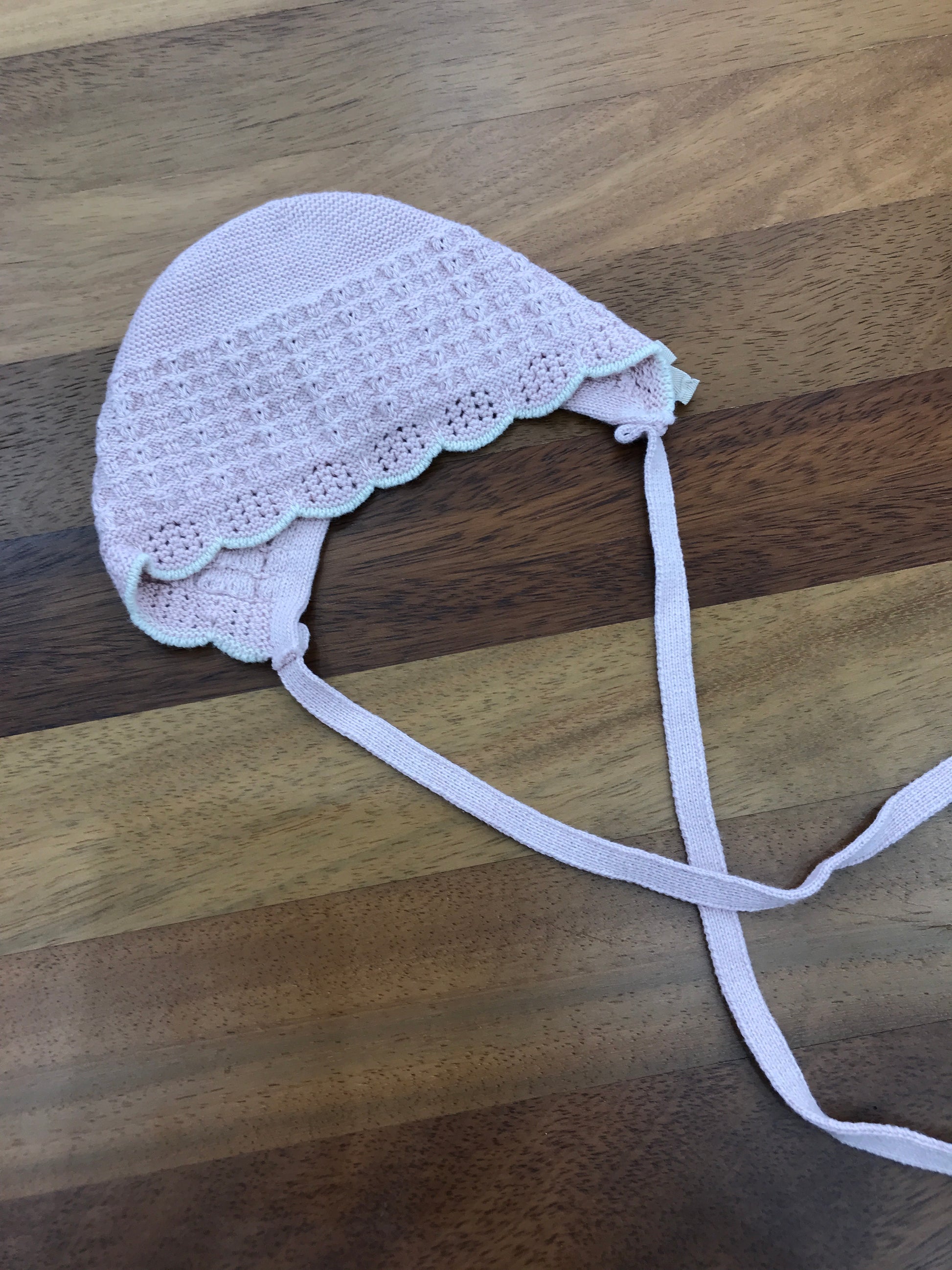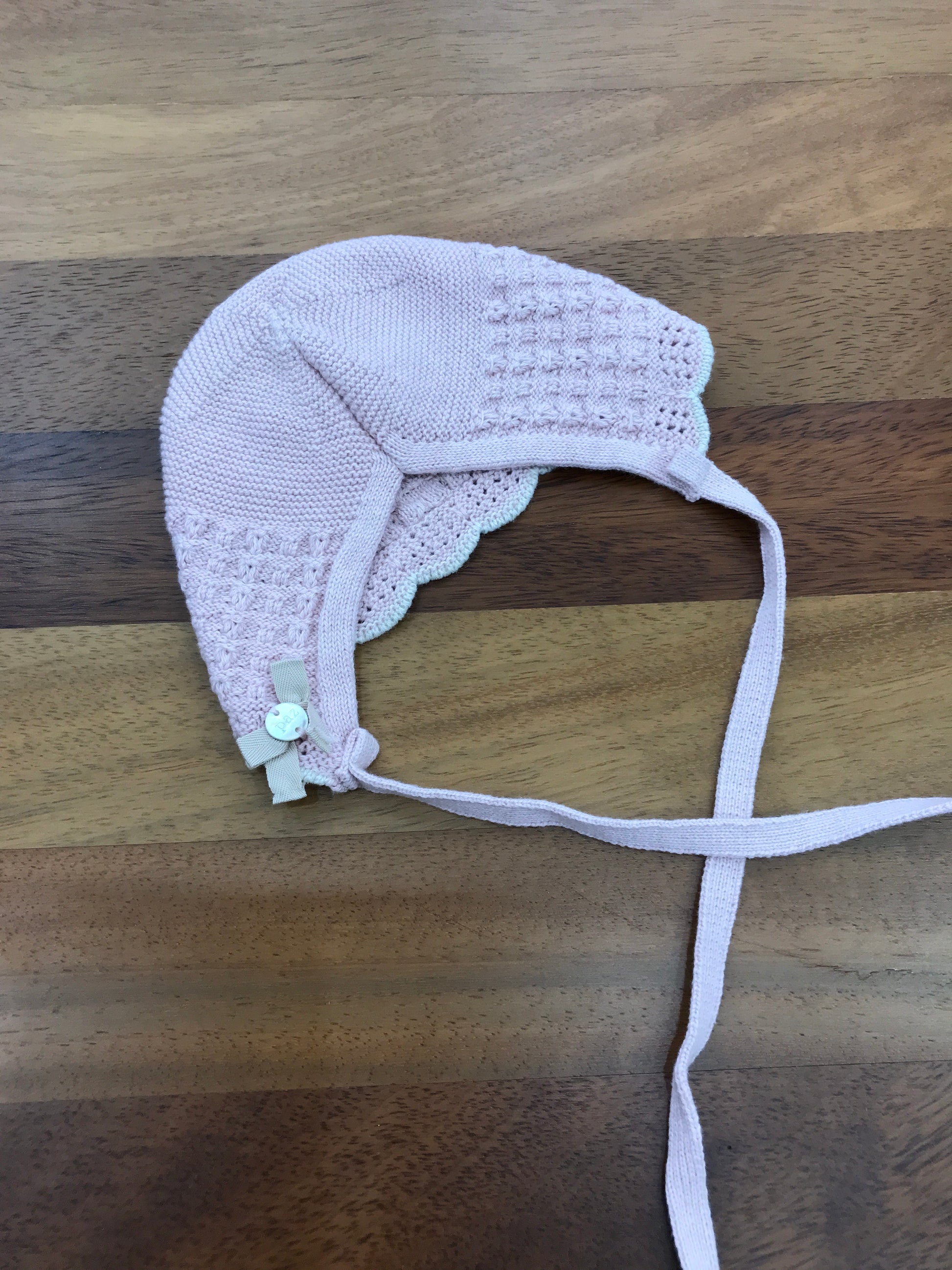 Questa cuffietta in lana presenta una chiusura a fiocco, arricchita da ricami che decorano l'intera superficie. Il bordo smerlato e il motivo leggermente traforato conferiscono un tocco di eleganza e raffinatezza al capo.