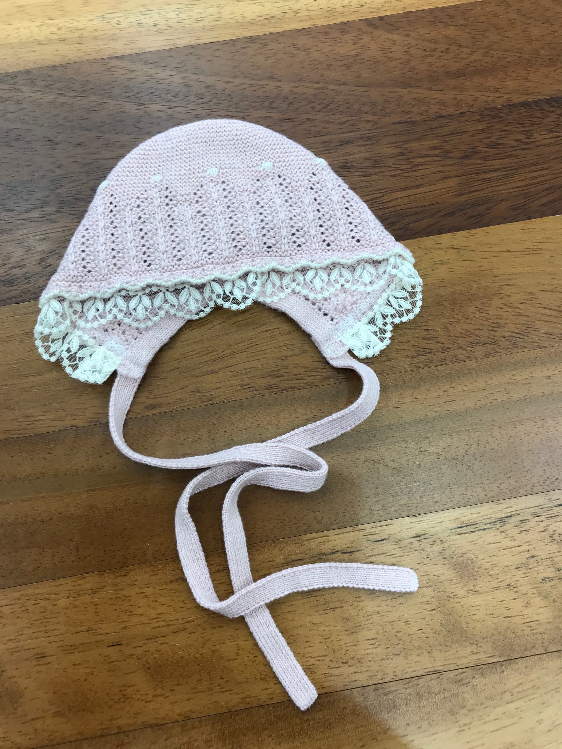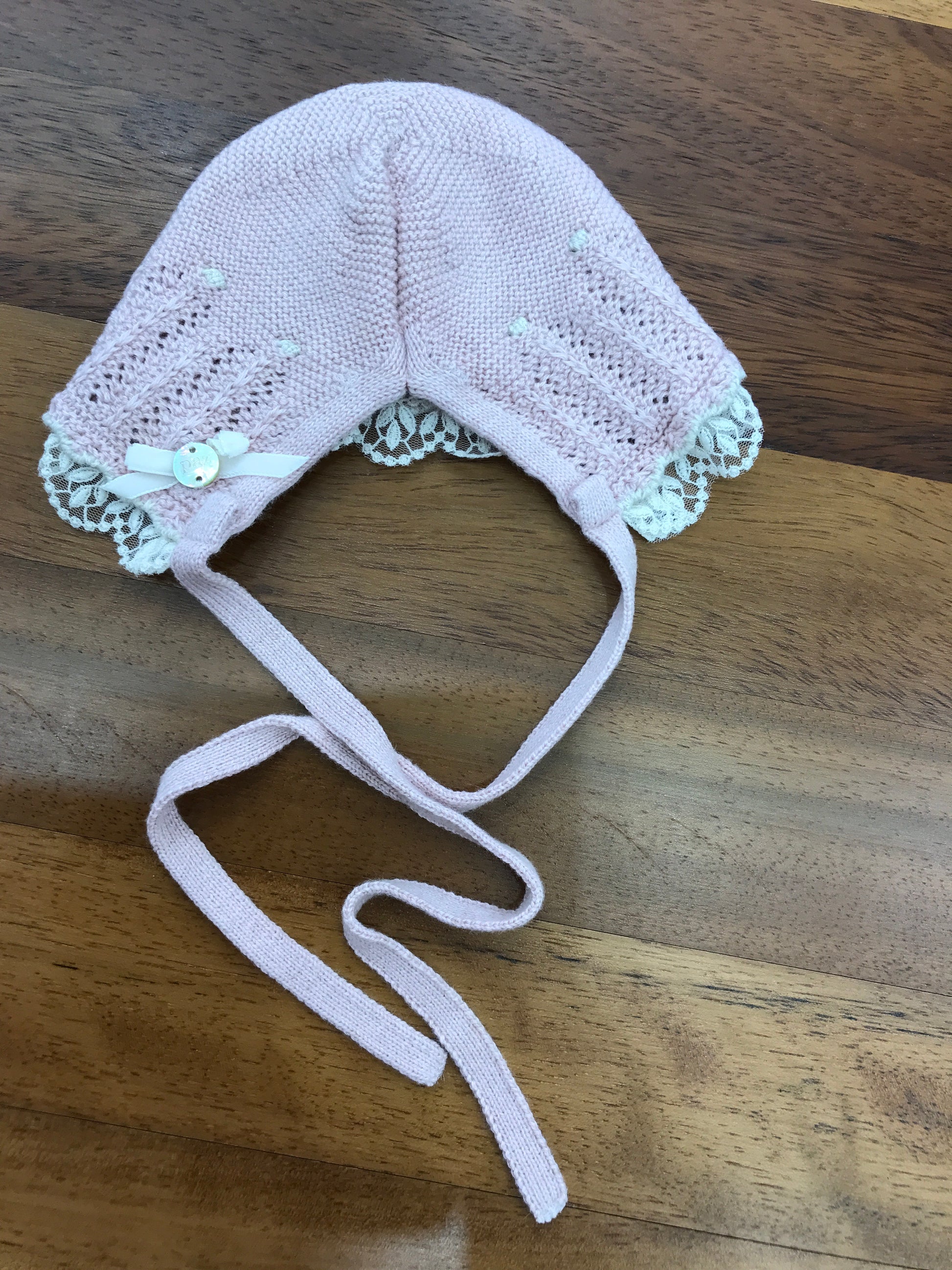 Cuffietta in lana dotata di chiusura a fiocco, con inserti di merletto ricamato e lavorazione a maglia traforata che copre l'intera superficie, arricchita da dettagli rosa.