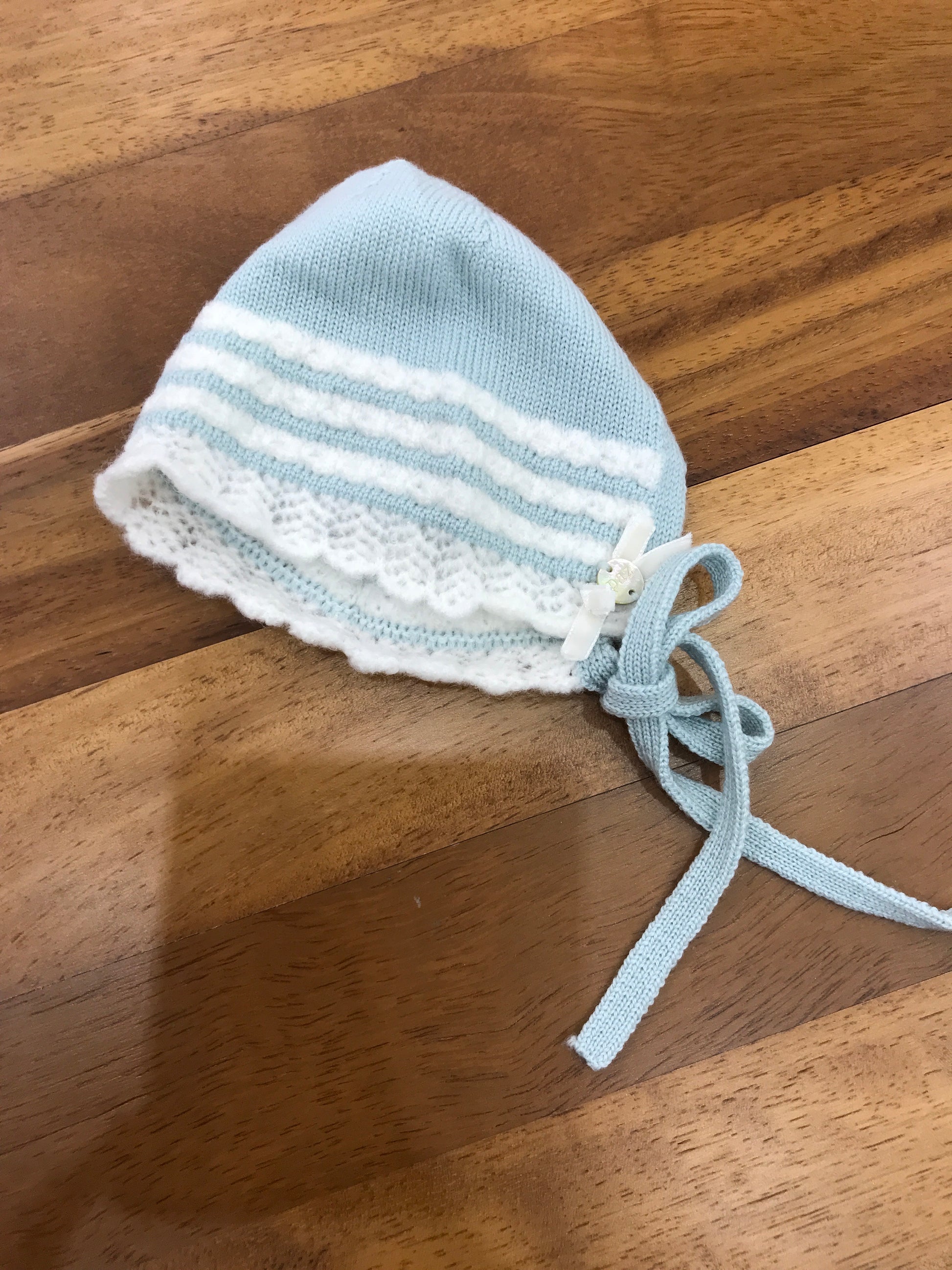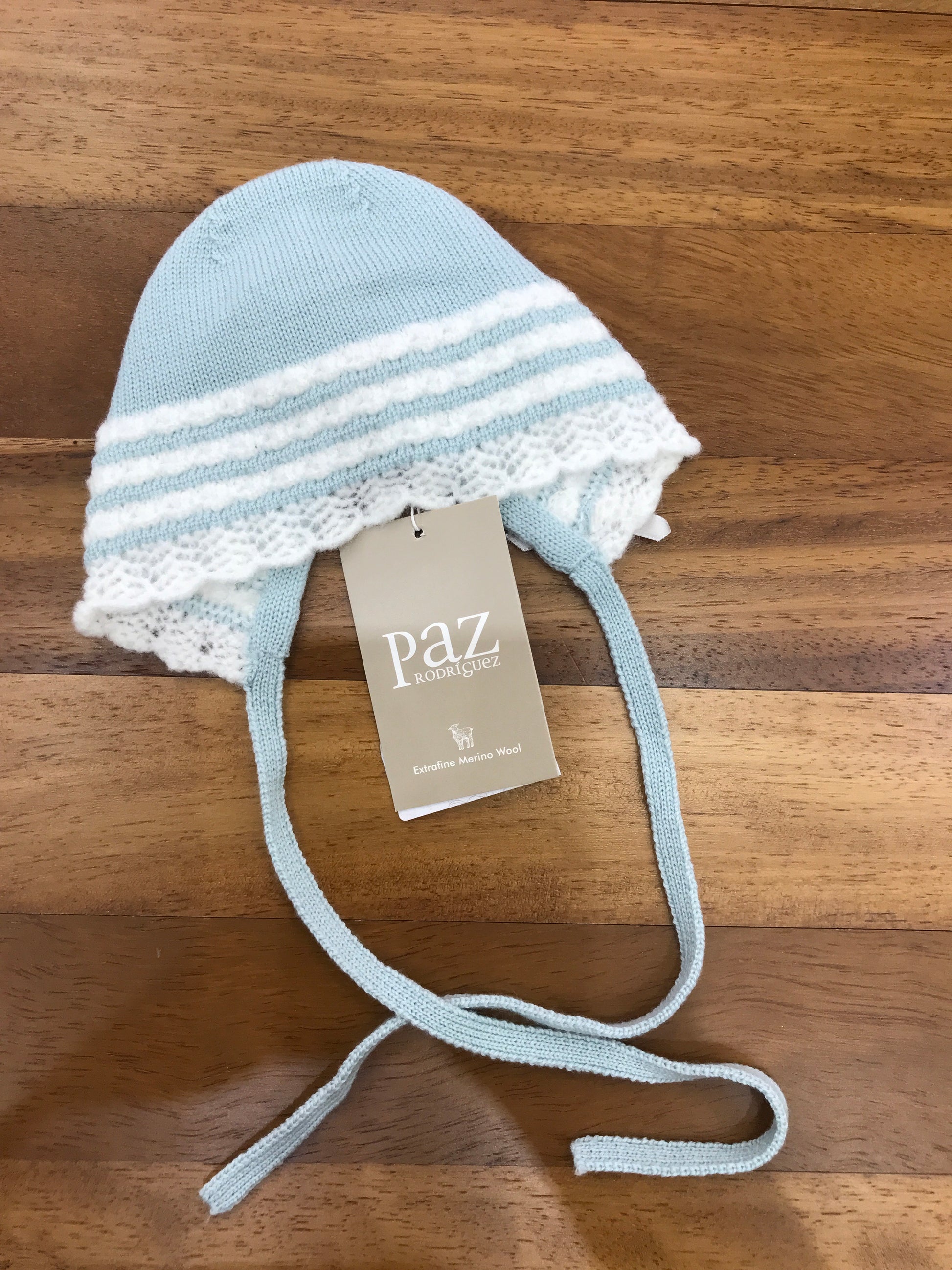 Cuffietta Paz Rodriguez realizzata in lana, arricchita da delicati ricami e dotata di una chiusura a fiocchetto per una vestibilità regolabile e confortevole.